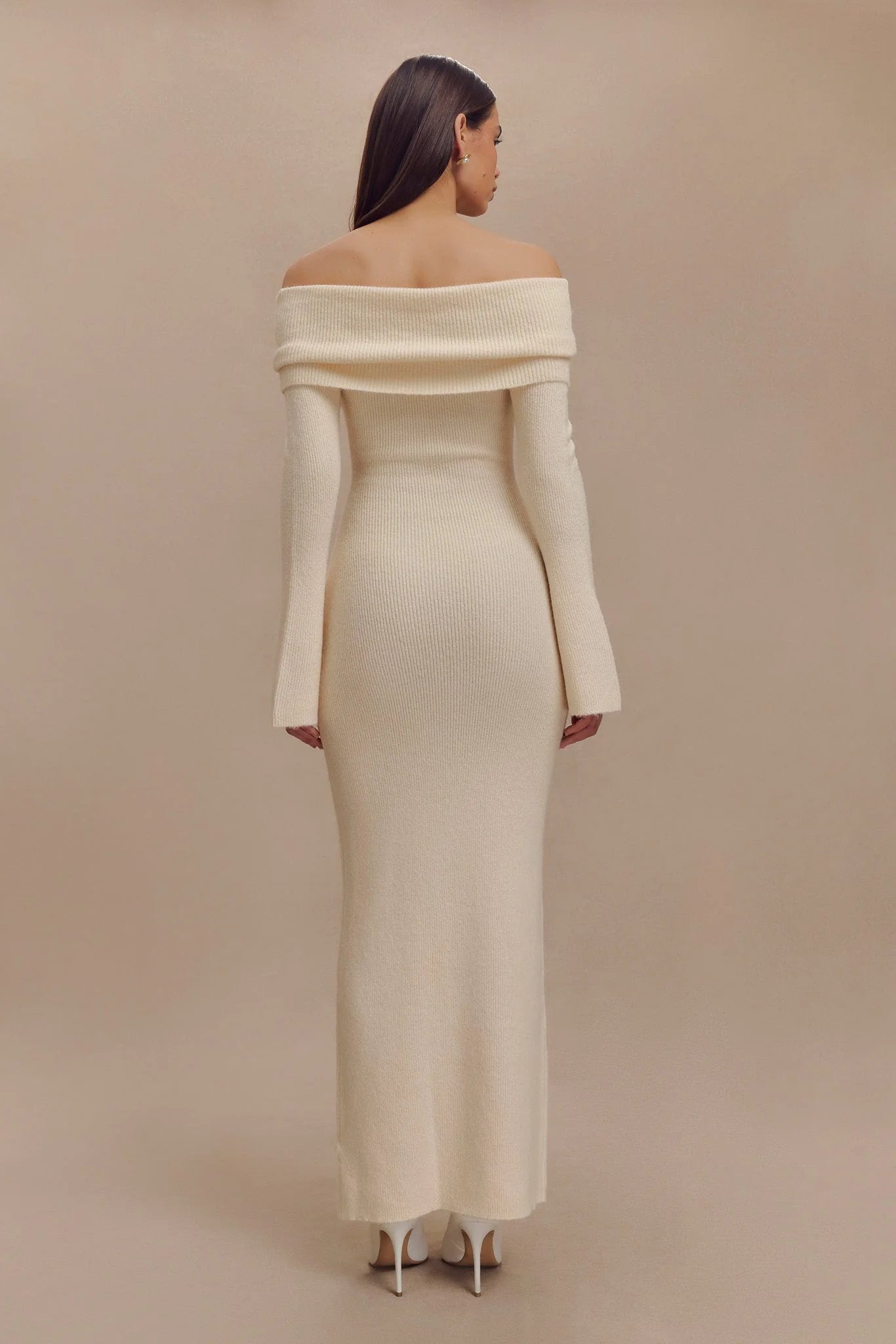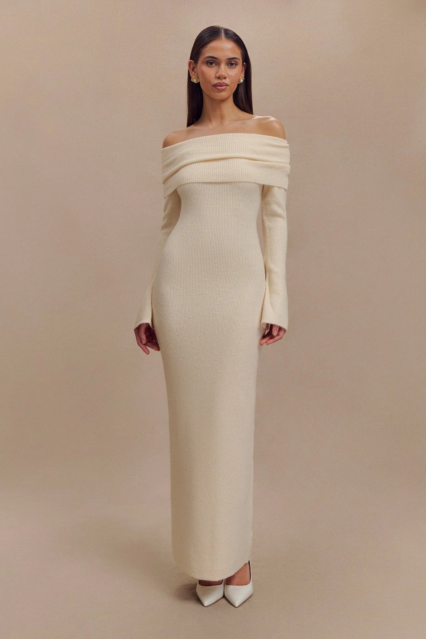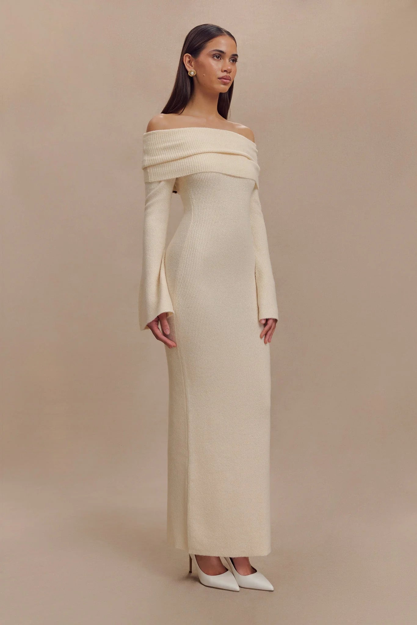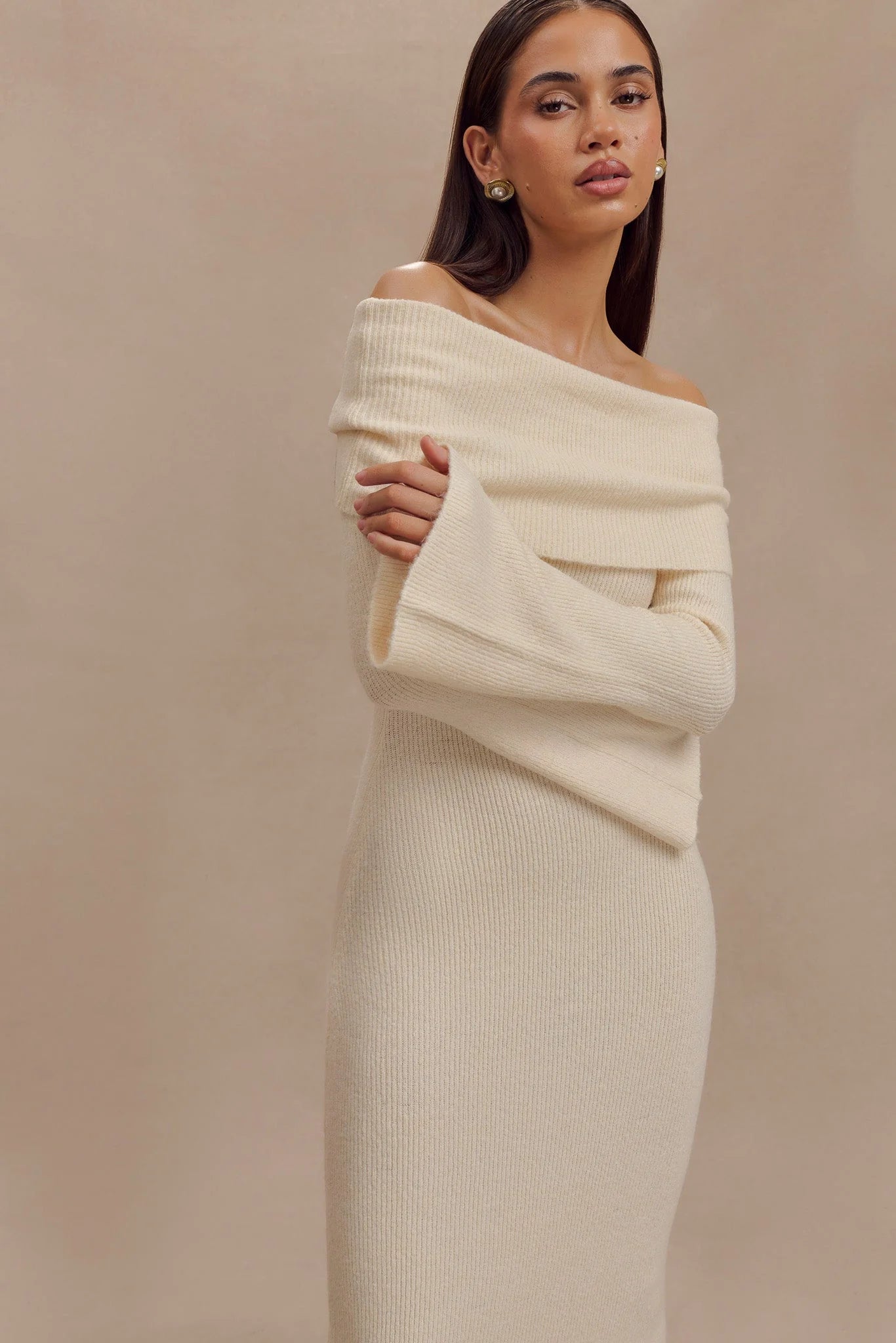 The KATHERINE Off Shoulder Knit Maxi Dress is a stunning example of elegant sophistication with a modern edge. Featuring an asymmetrical neckline and a ruched overlay, this dress offers a unique and stylish look. The long sleeves with flared hems add a touch of drama and movement, while the maxi length creates a graceful, flowing silhouette. Unlined and crafted from knit fabric, the Katherine Dress ensures both comfort and a chic, effortless style, making it perfect for formal occasions or evening events where making a memorable impression is key.