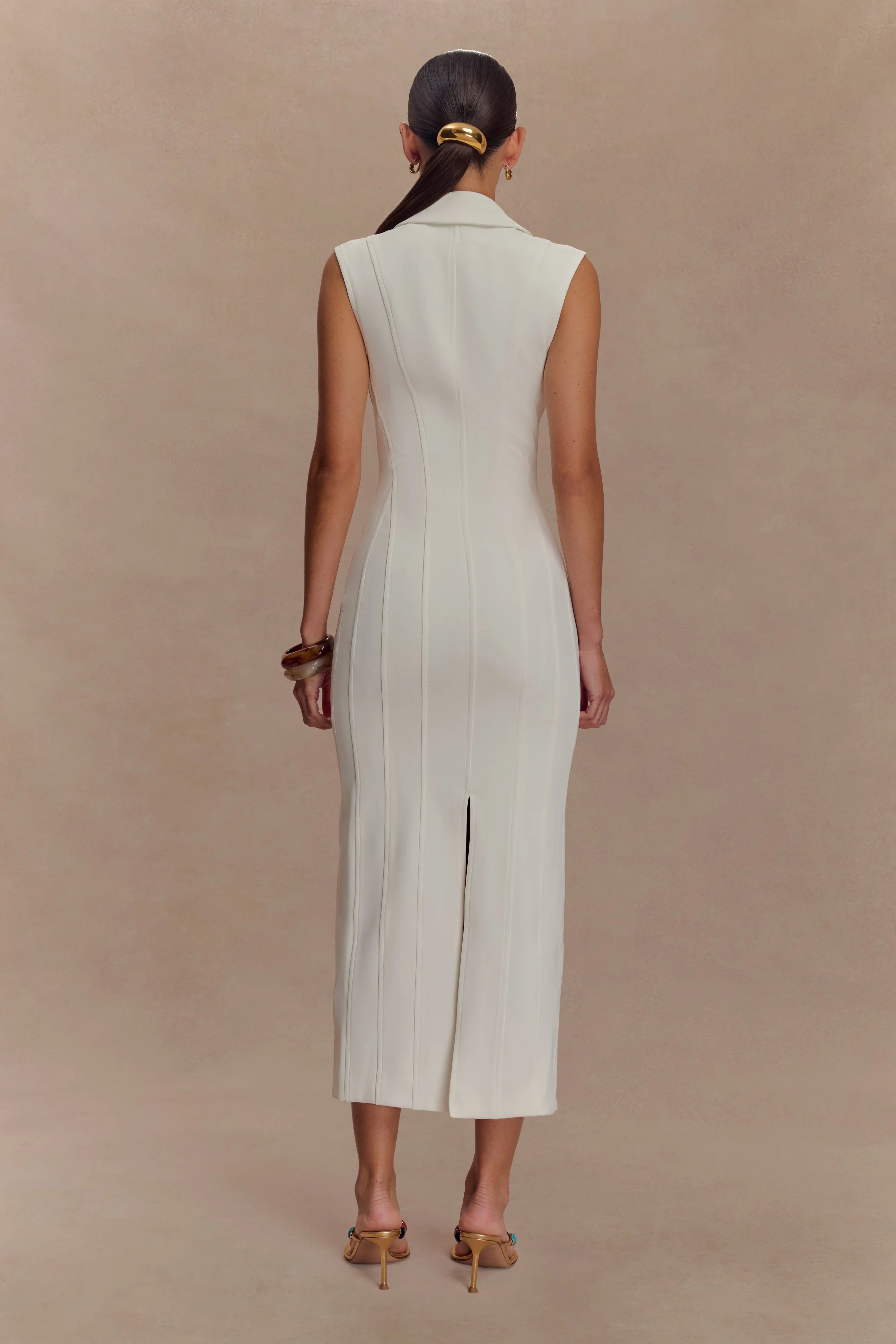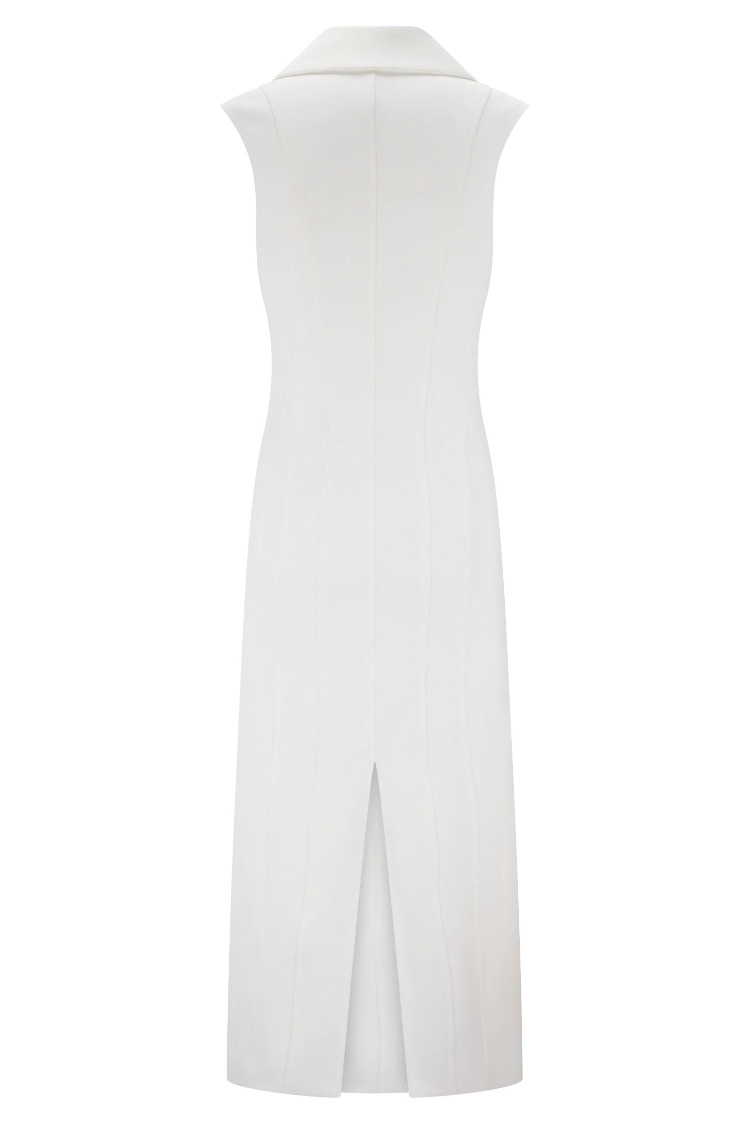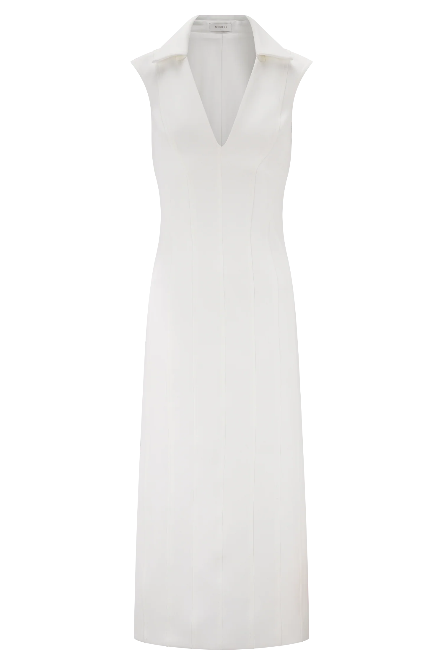 The KEAGAN Sleeveless Midi Dress delivers contemporary polish with timeless appeal. Featuring a deep V neckline with sharp collar detailing, this fitted silhouette is defined by vertical seam lines that contour the body for a sleek, elongated look. A closed back and centre back split adds a refined finish, making Keagan ideal for power dressing that doesn’t compromise on femininity. Perfect for work, events, or elevated evenings out—this is structure, redefined.