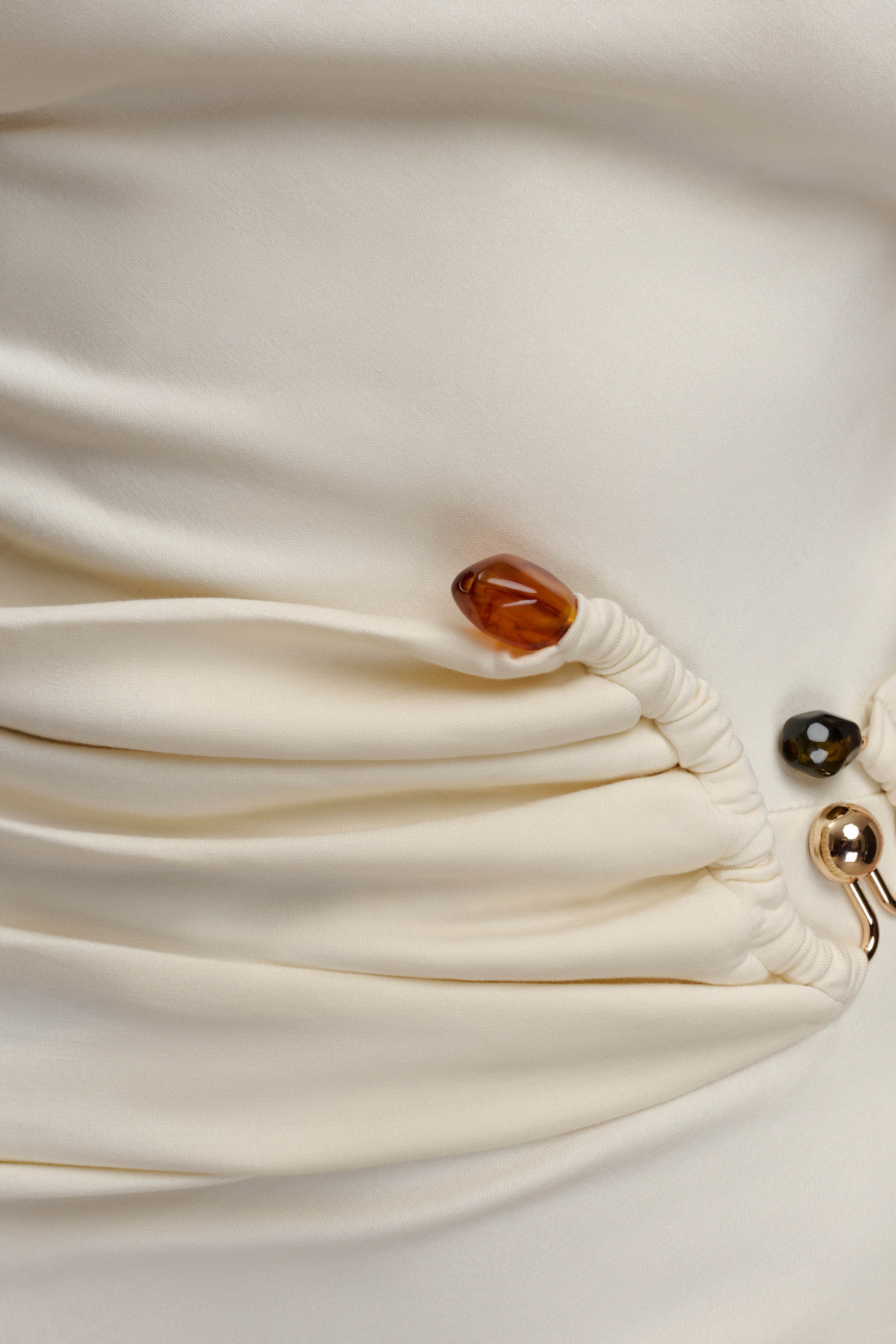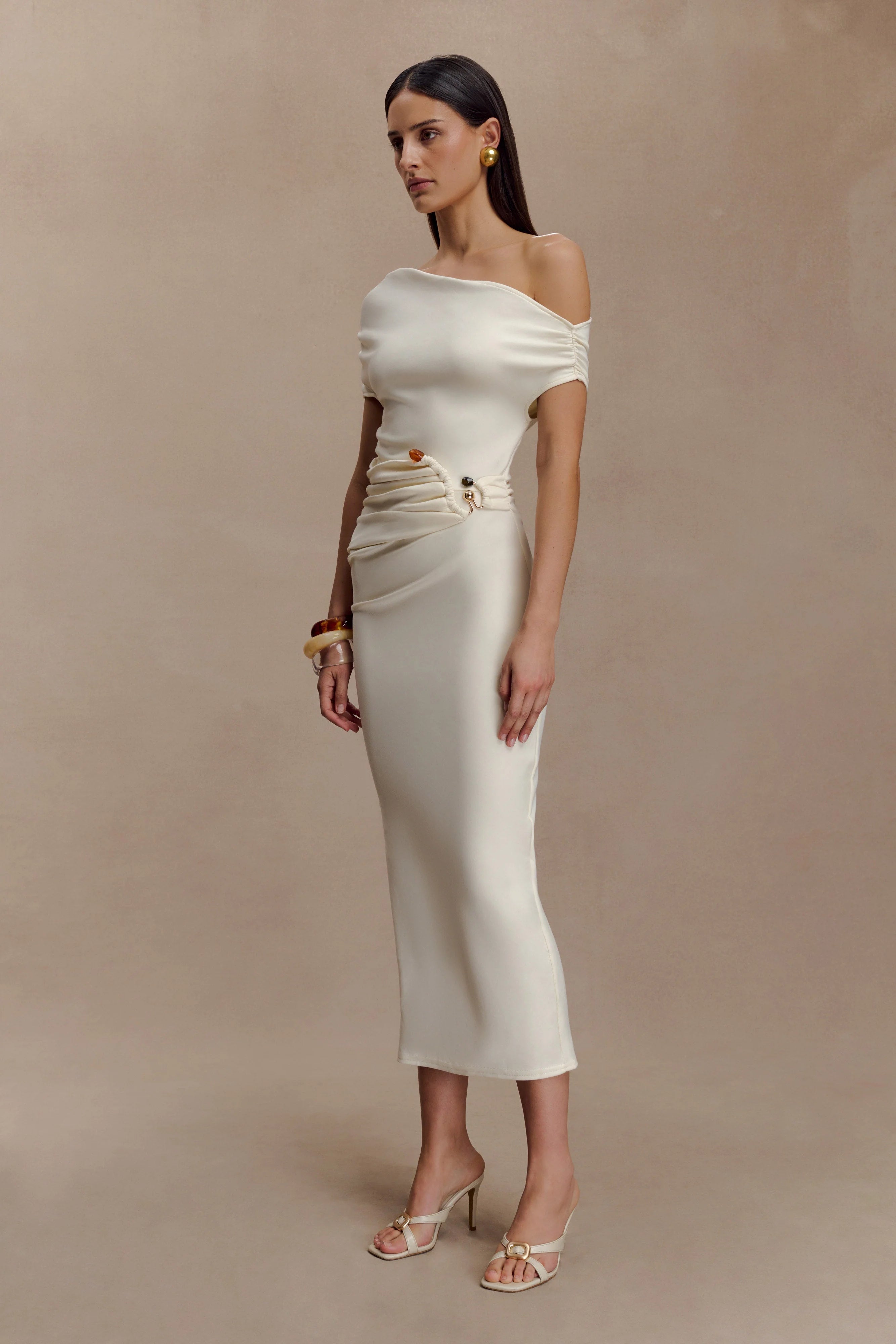 Own the spotlight in the KENDRA Scuba Jersey Midi Dress, a sculptural silhouette with elevated edge. Featuring an asymmetrical neckline and drop shoulder design, this dress is defined by its gathered shoulder and waist detailing that flatters the figure. Gold hardware accents add a luxe touch, while the fitted shape and midi length keep the look effortlessly refined. Unlined for a second-skin feel, this dress is your go-to for after-dark sophistication.