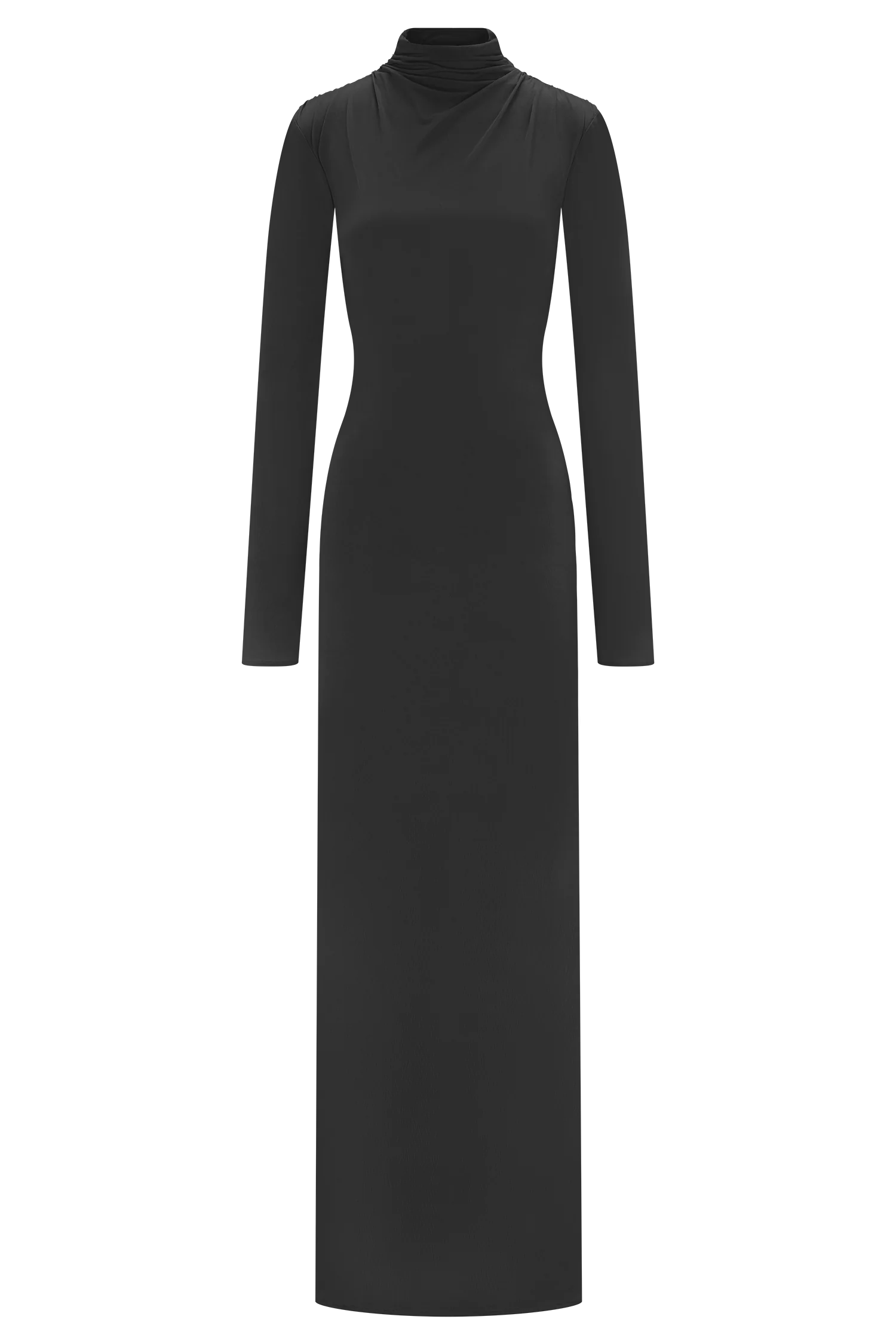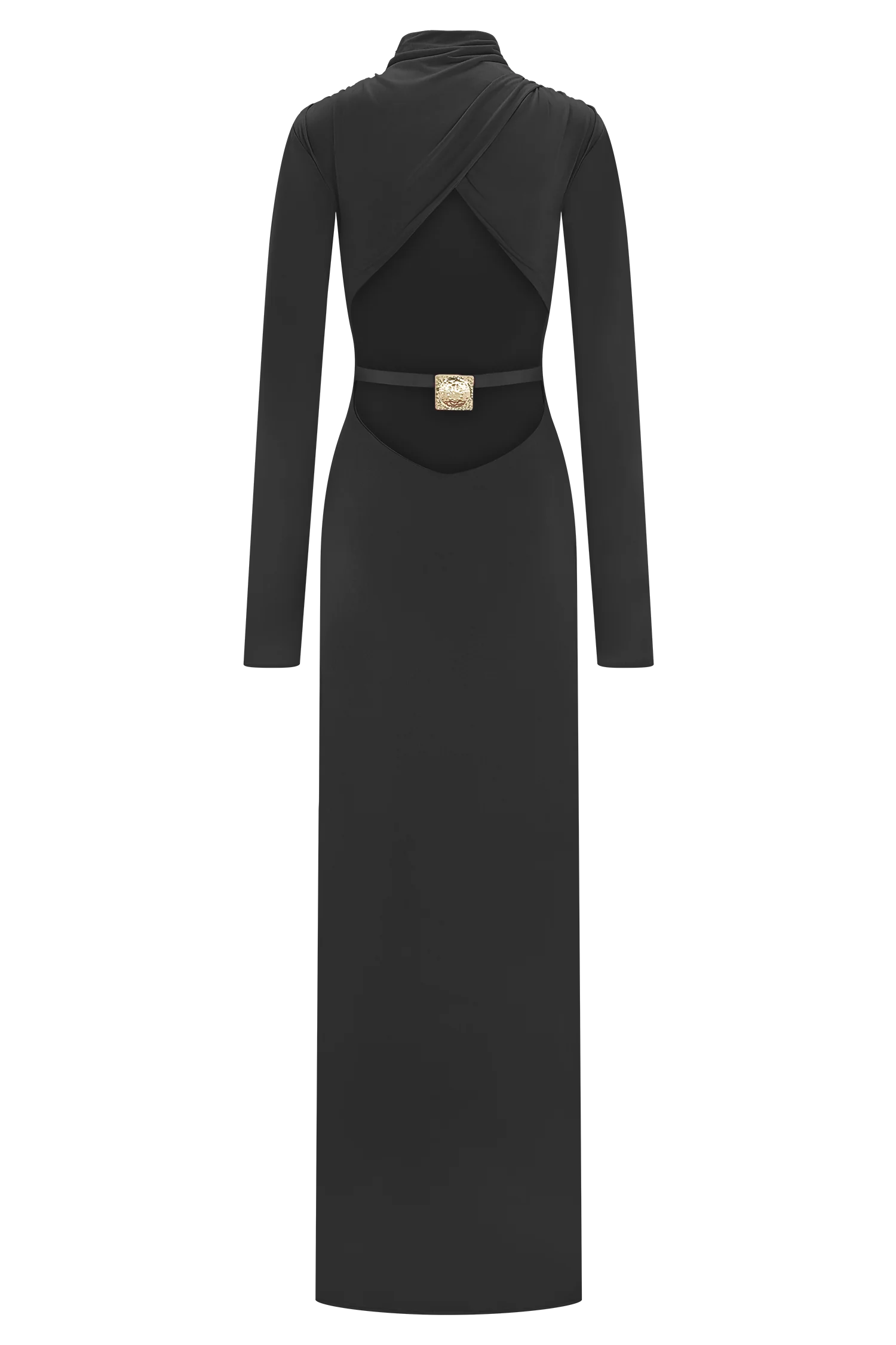 The KIYAH Slinky Cut Out Maxi Dress is a sleek, form-defining silhouette with directional detailing. Featuring a high neckline and long sleeves, it’s balanced by an open low-back cut-out with statement hardware for a touch of edge. Gathered shoulder accents create soft volume, while the fitted bodycon shape elongates the frame. Fully lined for a smooth finish and cut to a maxi length, this dress is the perfect fusion of sophistication and seduction.