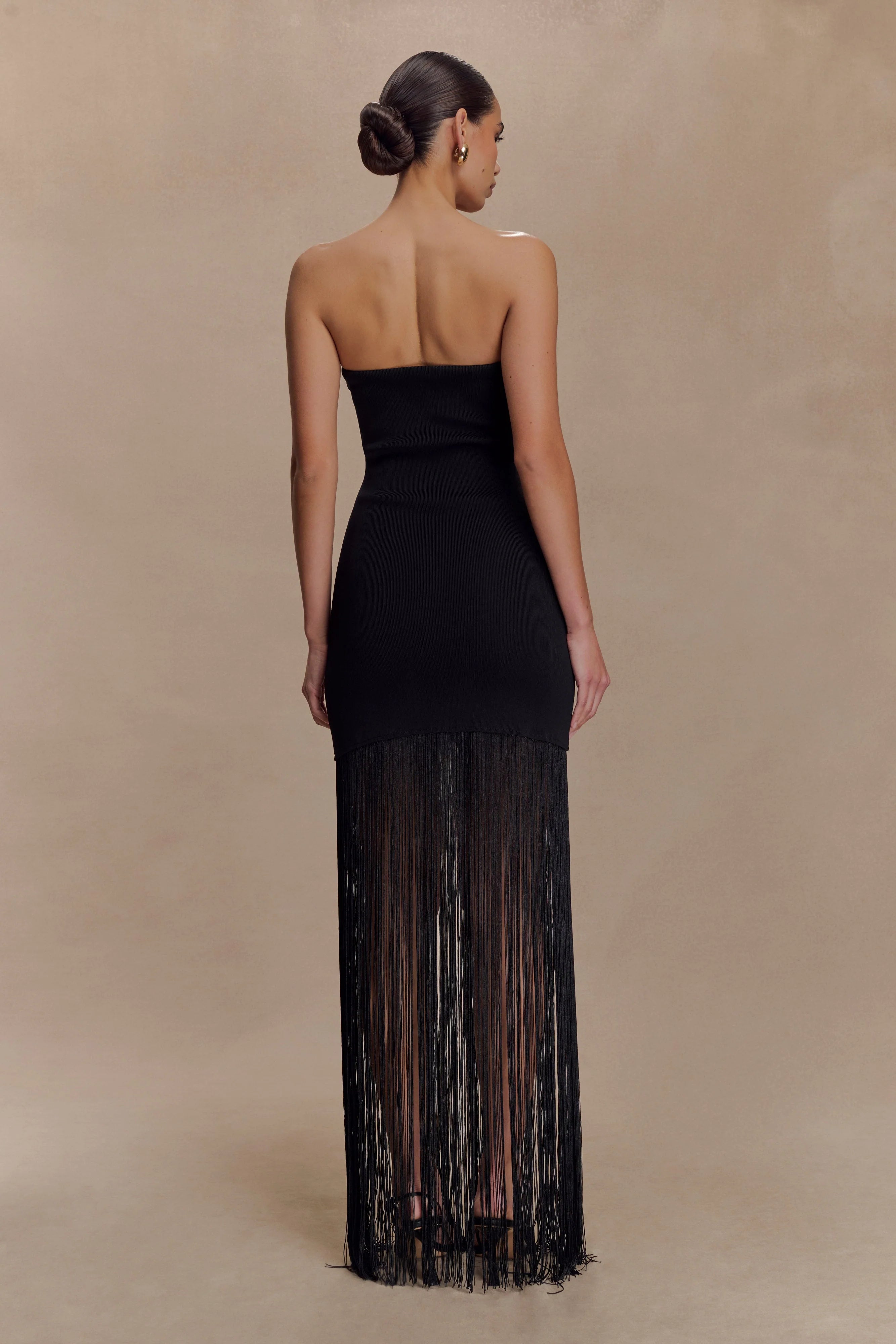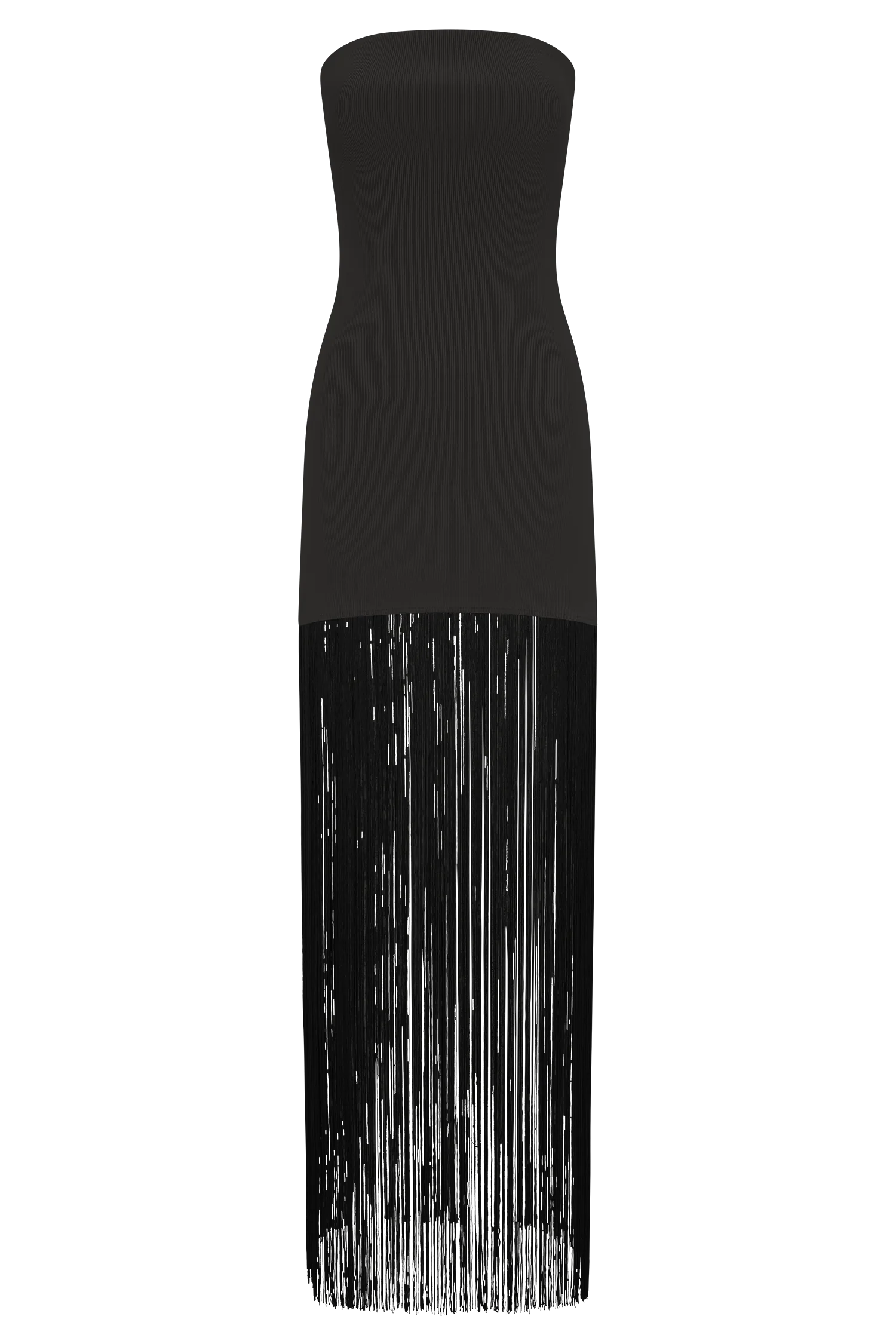 The KOAH Fringe Bandage Knit Maxi Dress delivers sleek sophistication with a playful twist. Designed with a strapless neckline and a figure-hugging bandage knit bodice, this dress flatters and defines the silhouette. The standout feature? A statement fringe hem that sways with every step, adding movement and allure. Crafted unlined for a lightweight feel, it is made for sun-drenched events and dancefloor moments alike.