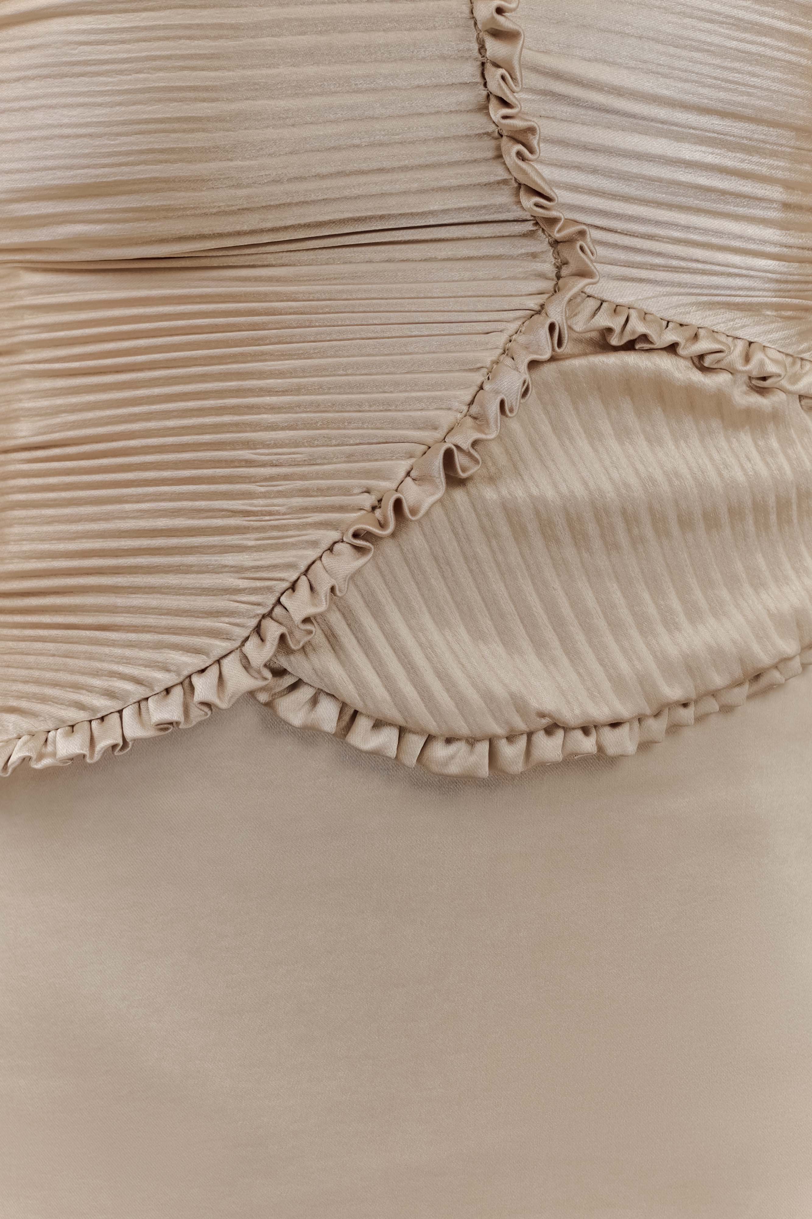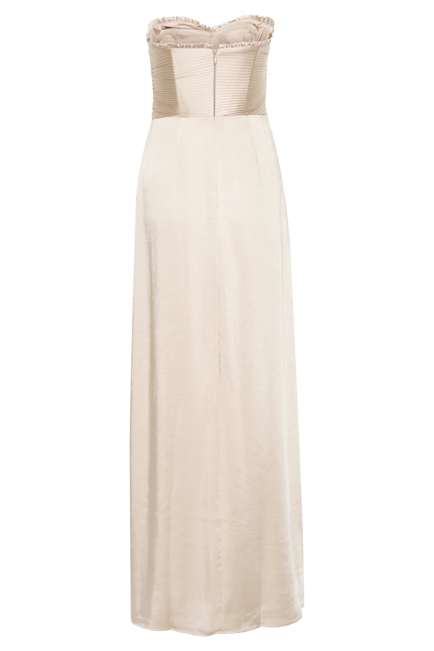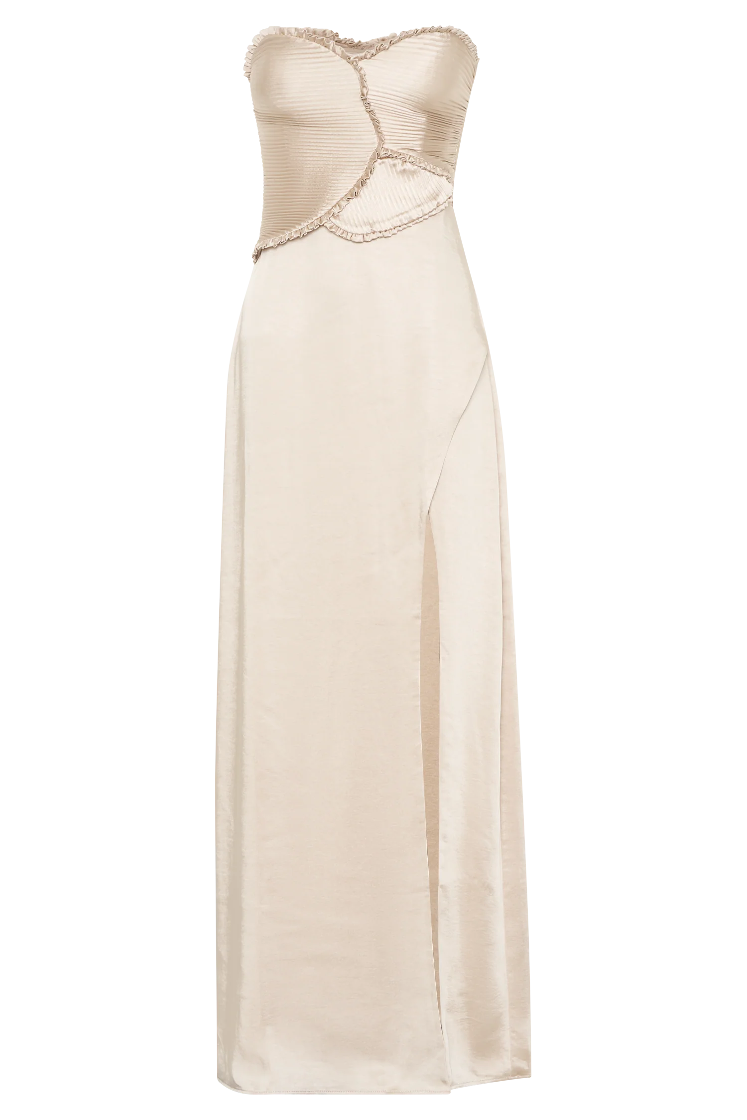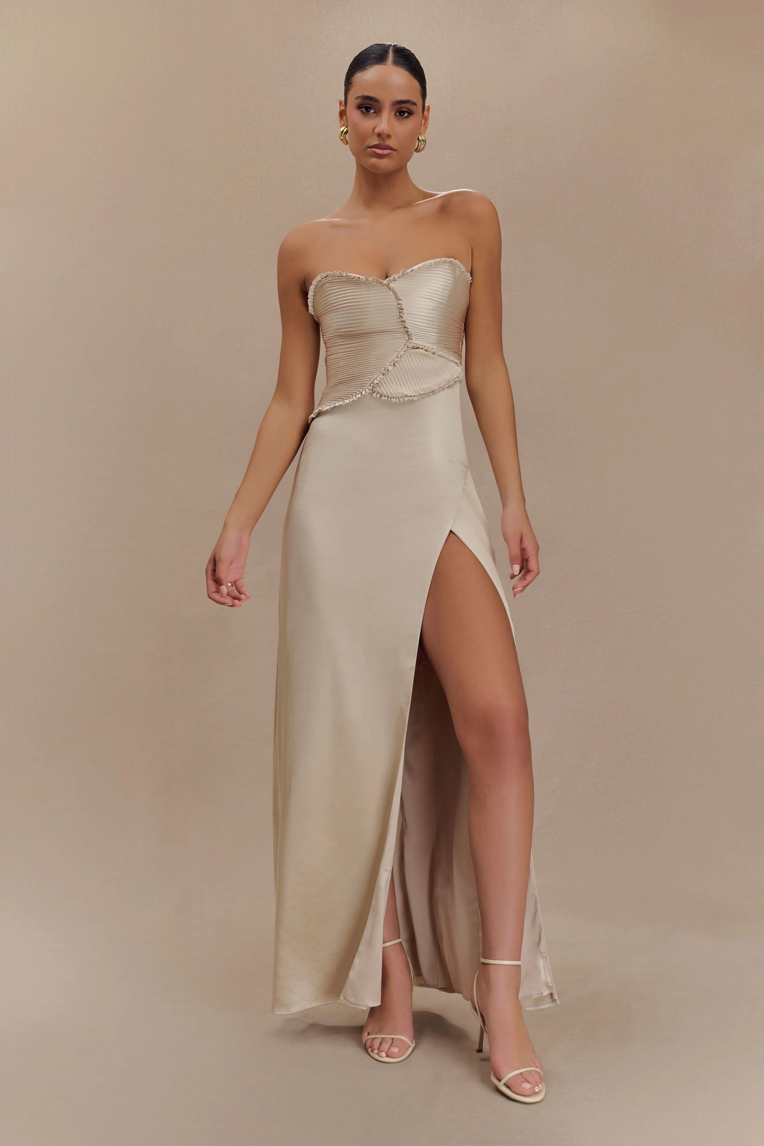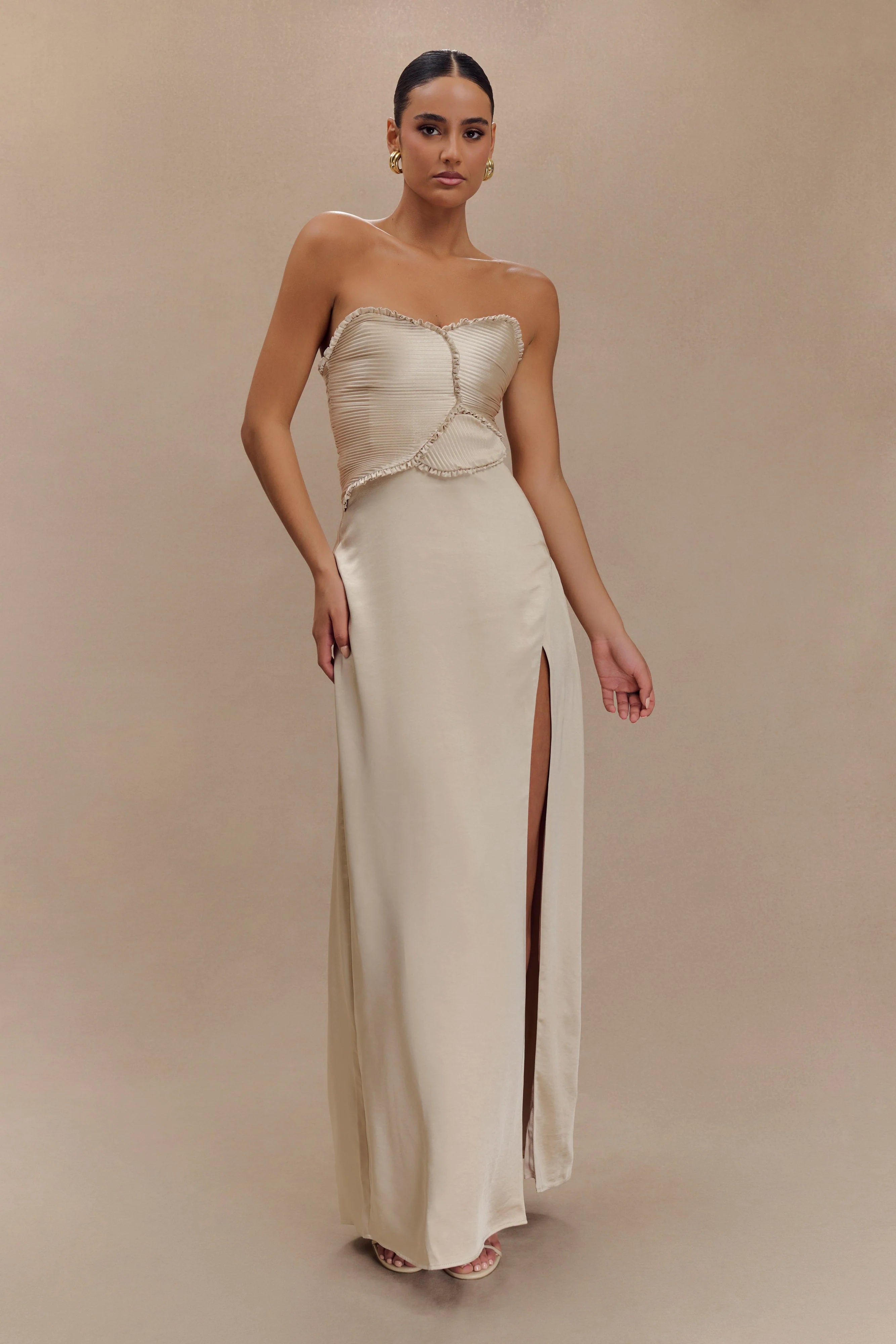 The LARISSA Satin Maxi Dress with Ruched Petals is a breathtaking piece designed to make a statement. Featuring a flattering strapless neckline, this dress showcases rounded pleated panelling details on the bodice, adding a touch of sophistication and texture. The centre back zip closure ensures a secure fit, while the straight skirt shape creates a sleek silhouette. A daring front leg split adds an element of allure, perfect for showing off your favourite heels. Lined for comfort and a luxurious feel, this dress is your go-to choice for special occasions, ensuring you’ll turn heads wherever you go.