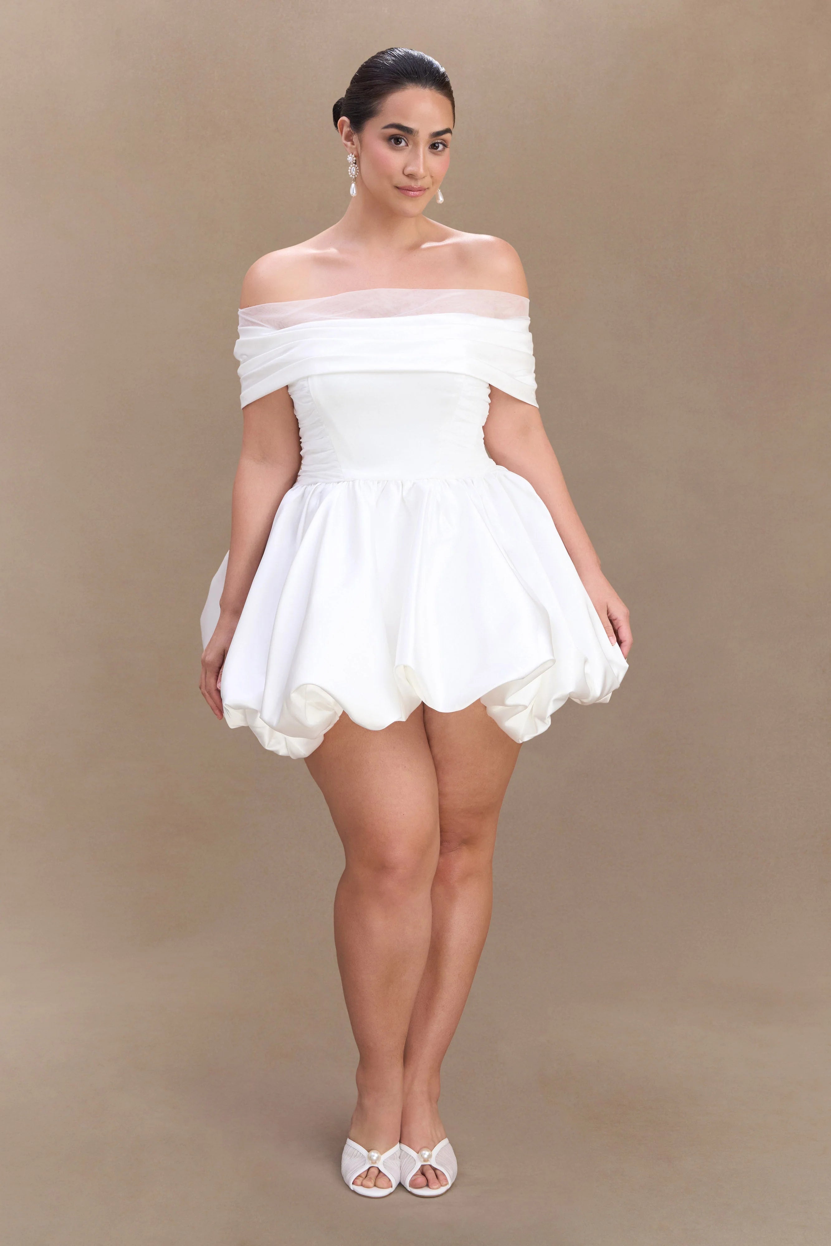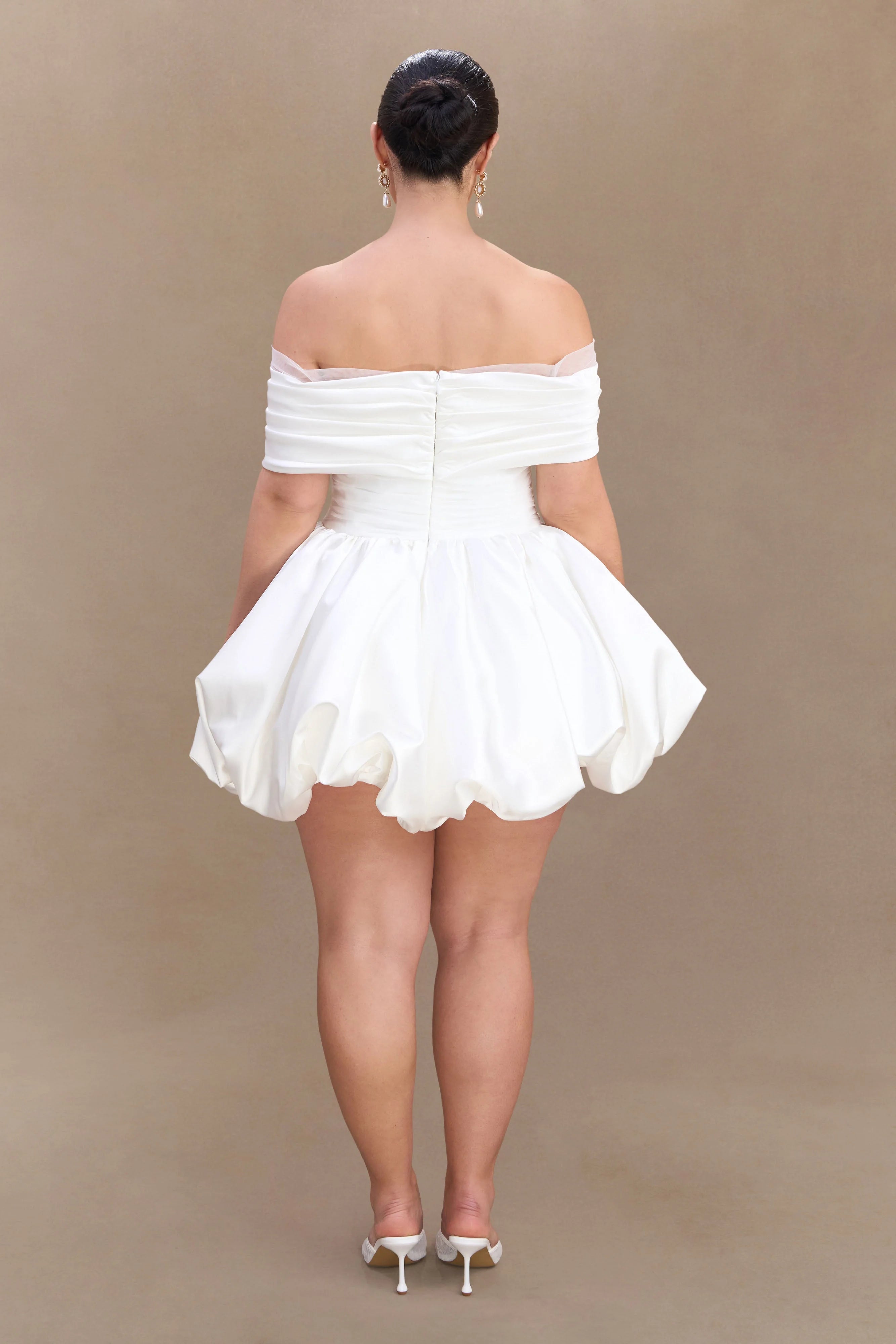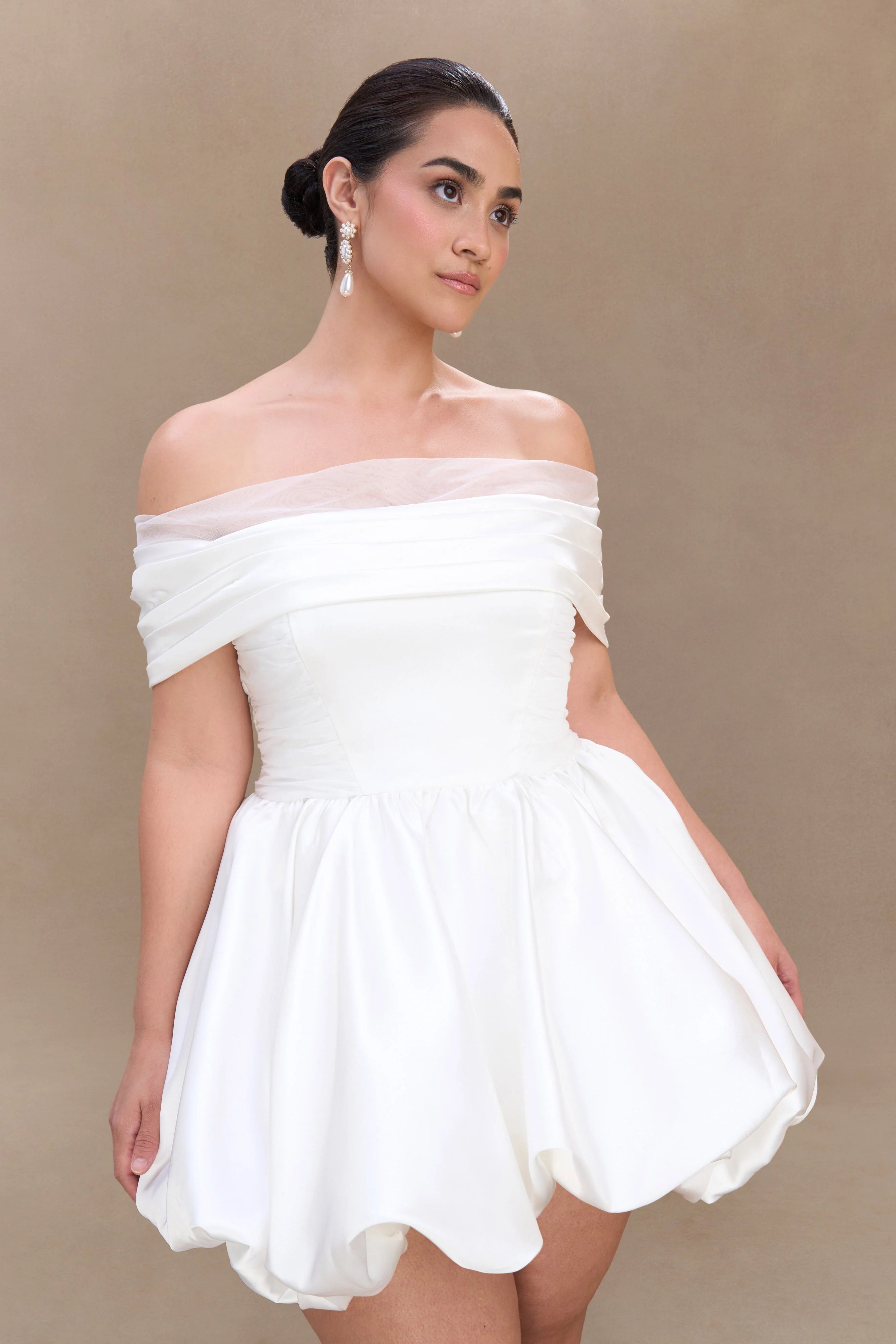 The LAURETTA Off Shoulder Mini Dress is the perfect fusion of romance and statement style. Designed with an elegant off-the-shoulder neckline and a gathered overlay, this dress exudes effortless glamour. The fitted bodice, enhanced by ruched paneling and an internal elastic waist stay, creates a sculpted silhouette that flatters every curve. The voluminous bubble skirt adds a playful touch, balancing structure with movement. Finished with a back zip and hook-and-eye closure for a seamless fit, the Lauretta dress is a show-stopping choice for special occasions, evening events, or unforgettable afterparty moments.