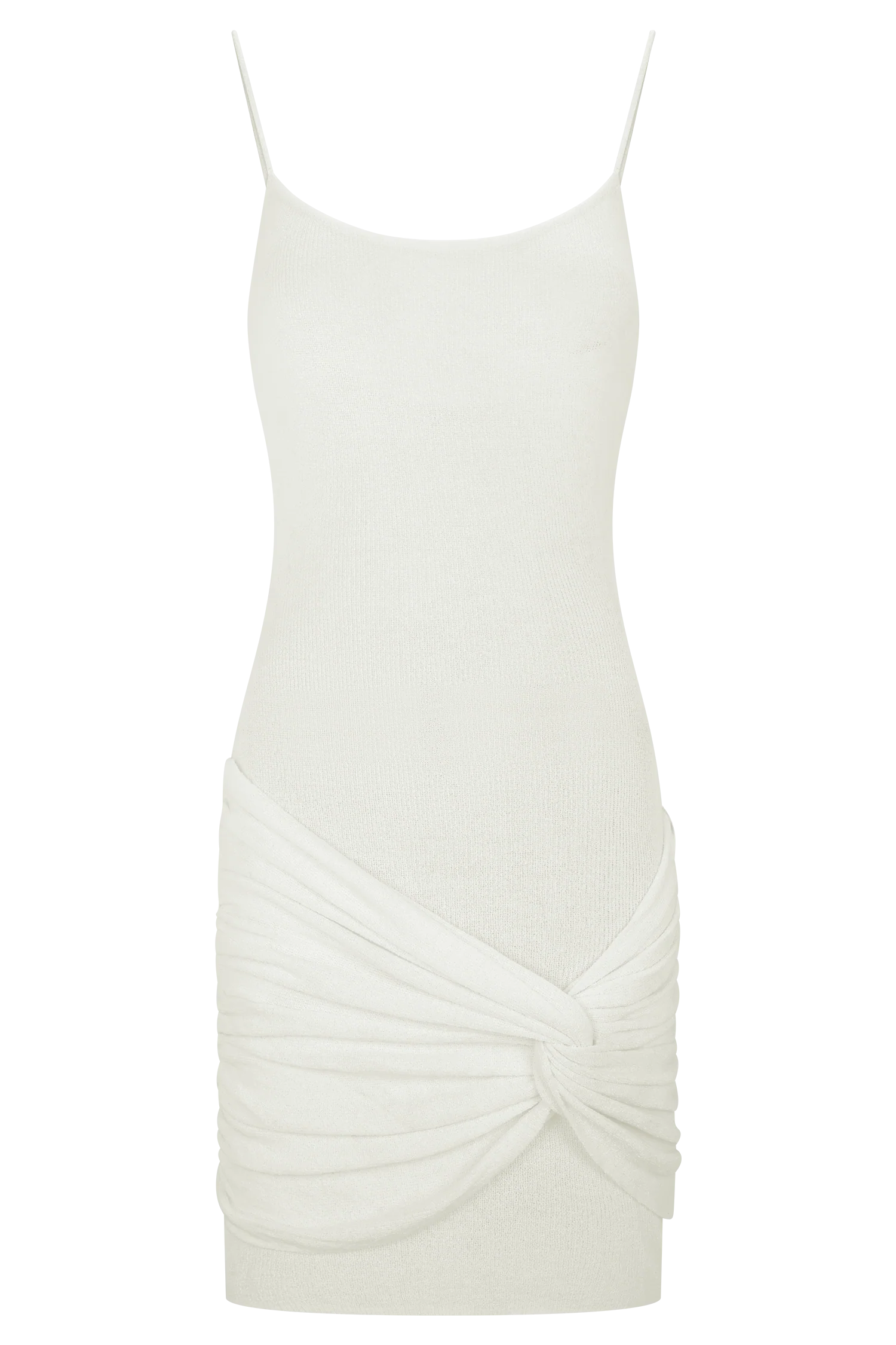 The LAURIE Twist Knit Mini Dress brings a modern, textural twist to your everyday mini. Featuring a scoop neckline and slim straps, this fitted silhouette highlights the body with a semi-sheer knit bodice and a gathered hip overlay finished with a sculptural twist detail. Unlined for a lightweight feel and subtle reveal, this dress is perfect for warm-weather days, coastal getaways, or elevated off-duty styling.
