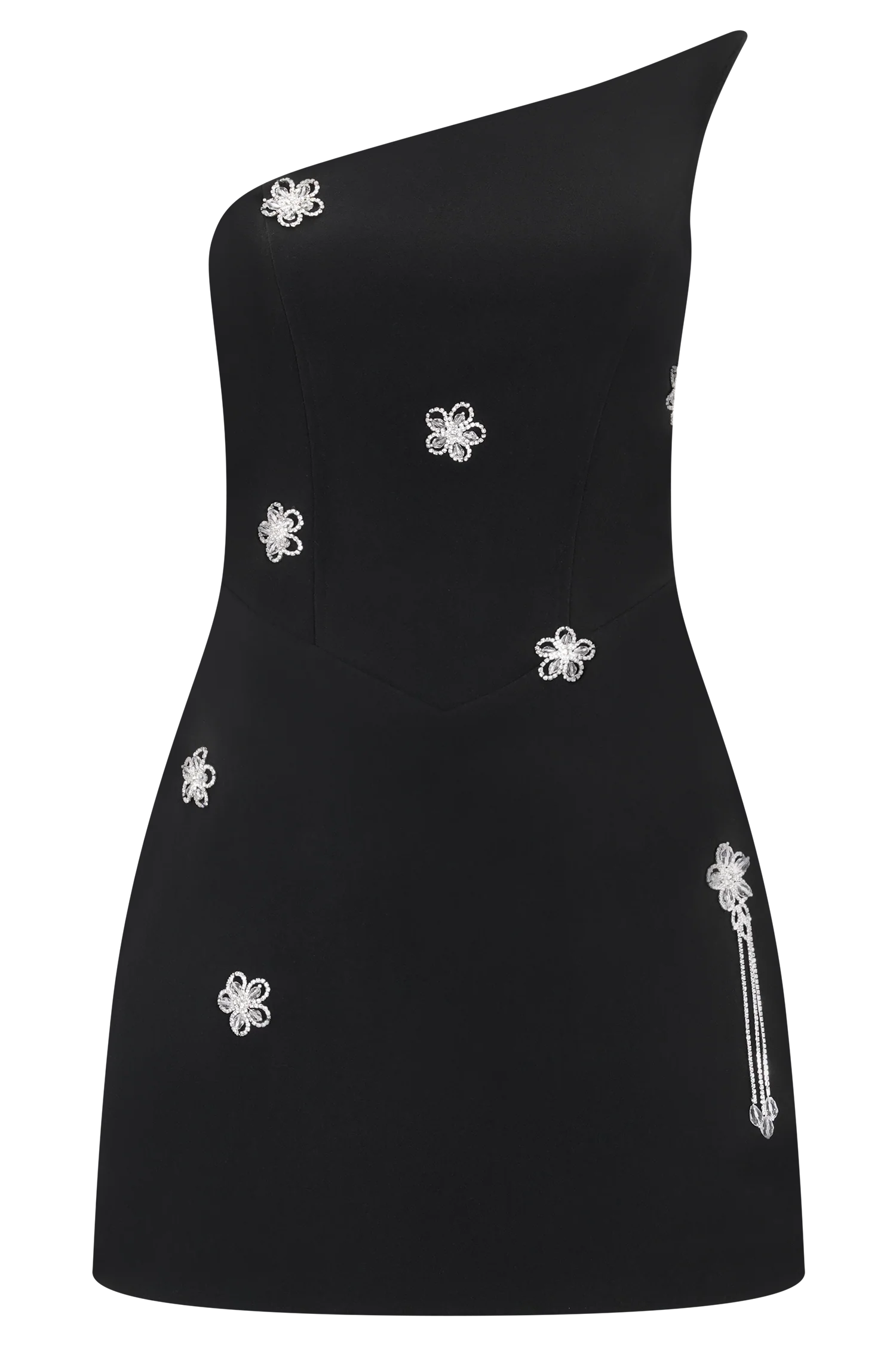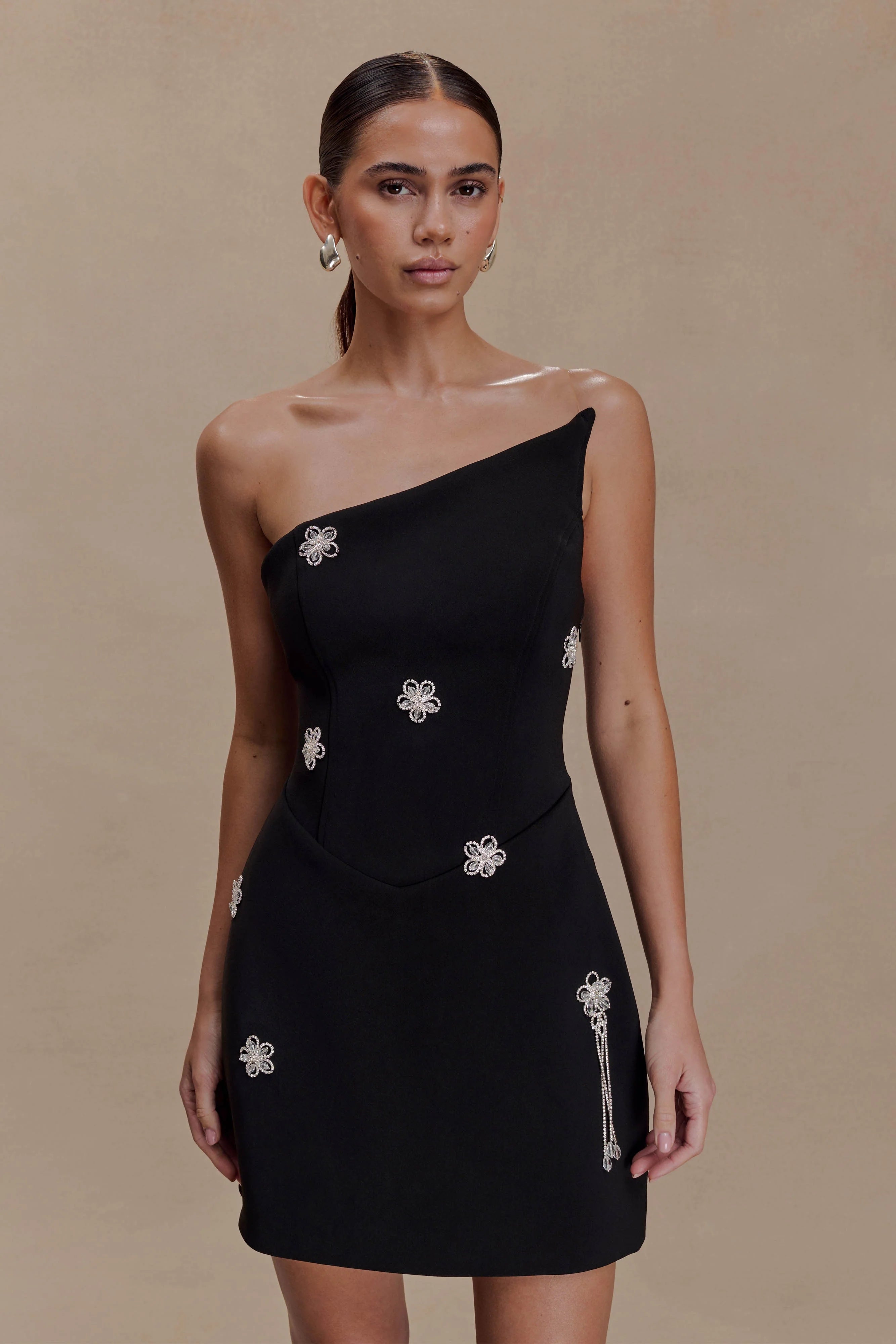 The LIVA Strapless Diamante Floral Trim Mini Dress is a statement piece that fuses playful charm with refined detailing. Designed with an asymmetric strapless neckline, it frames the shoulders beautifully while creating a clean, modern shape. Beaded floral trims cascade along the front, catching the light for subtle sparkle. Fully lined and finished with an invisible zip for a smooth fit, this dress falls to a mini length — perfect for evening occasions that call for effortless glamour.