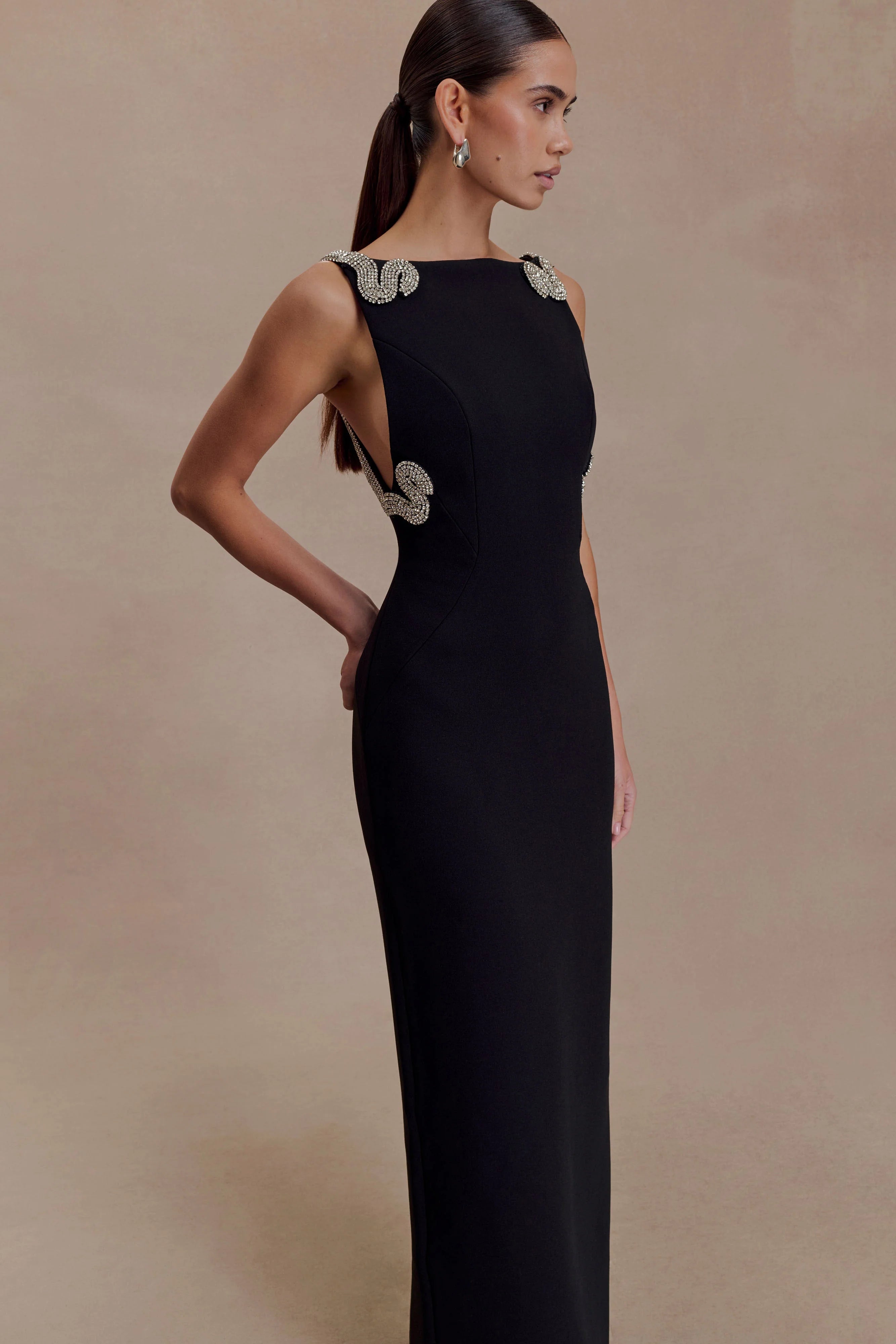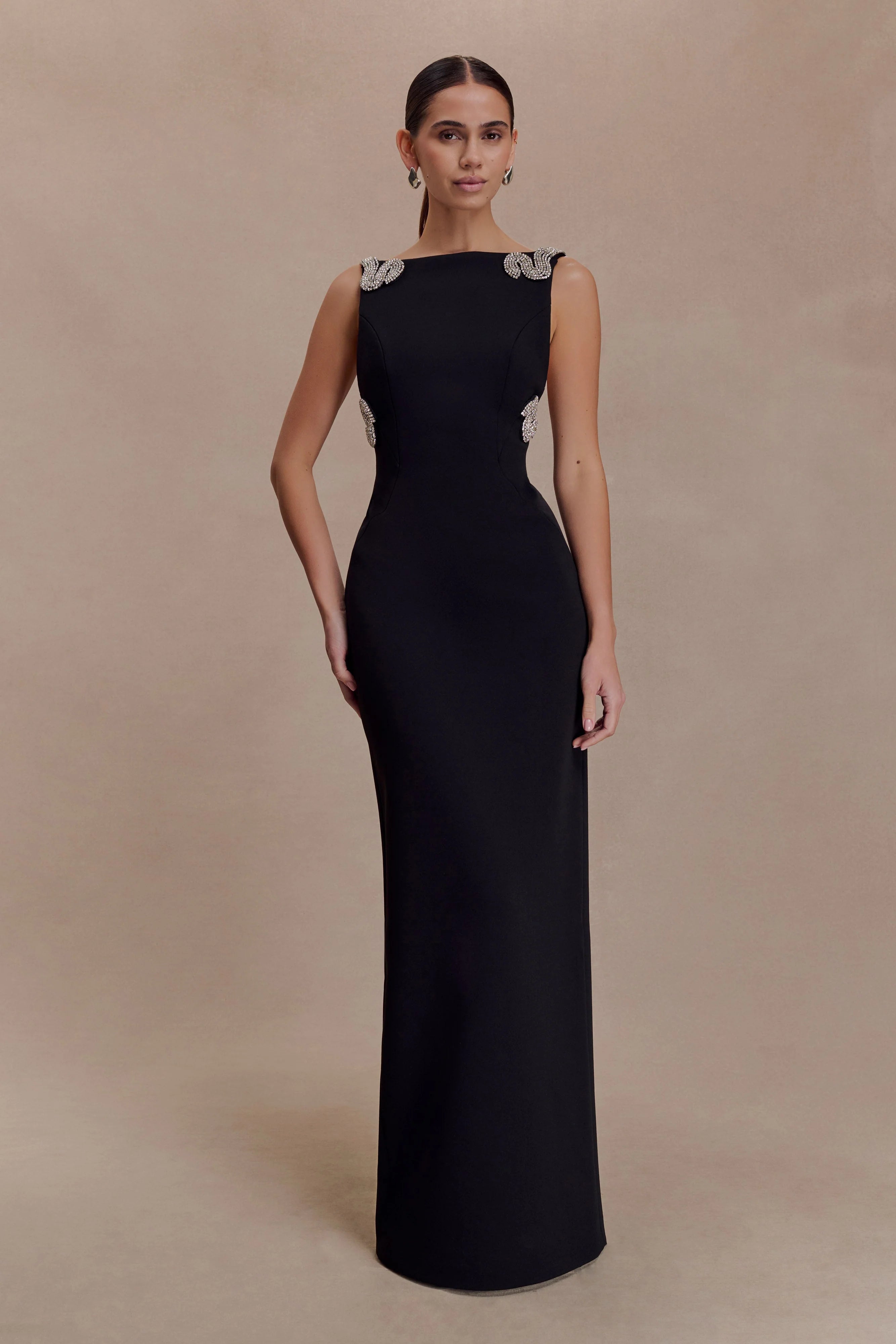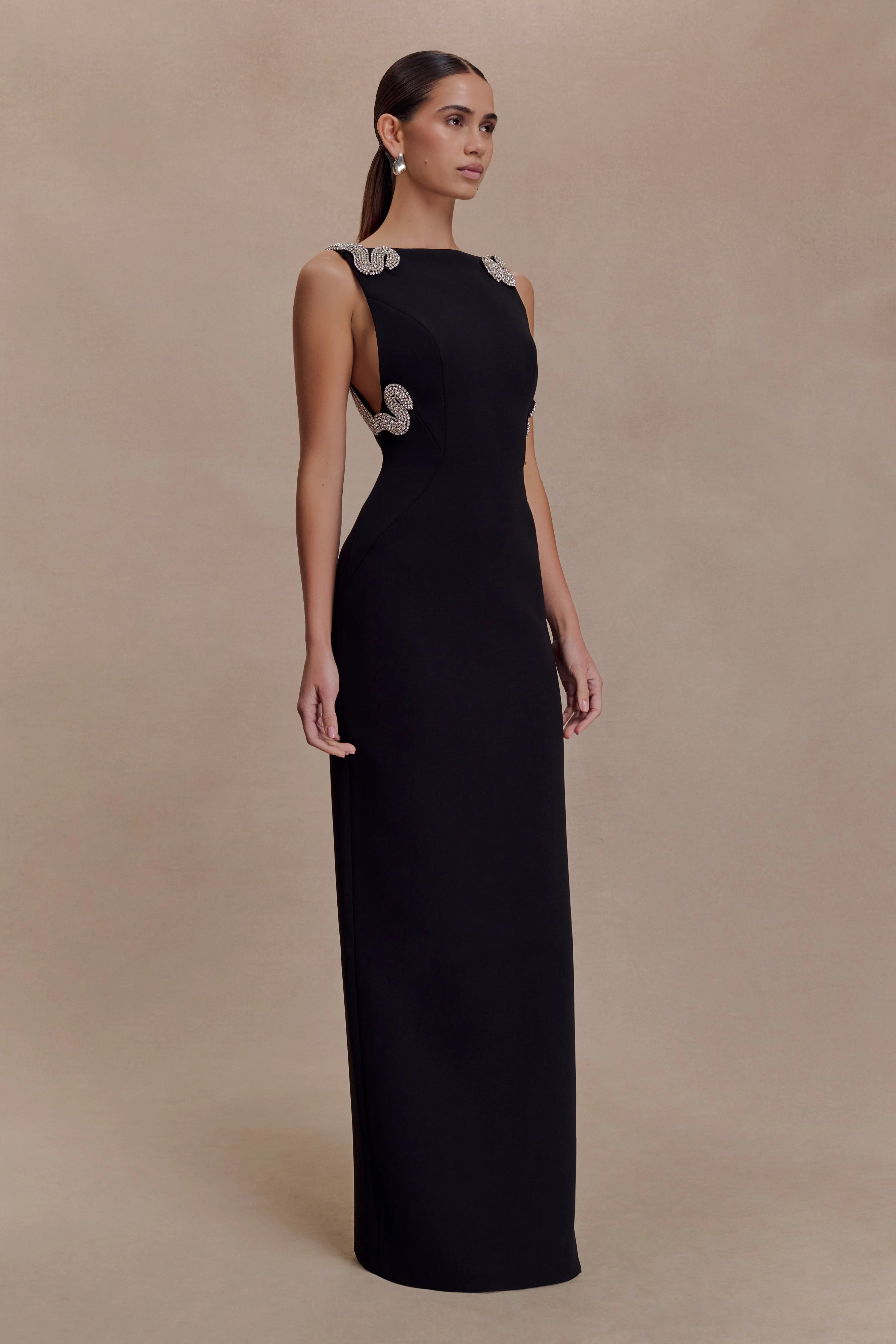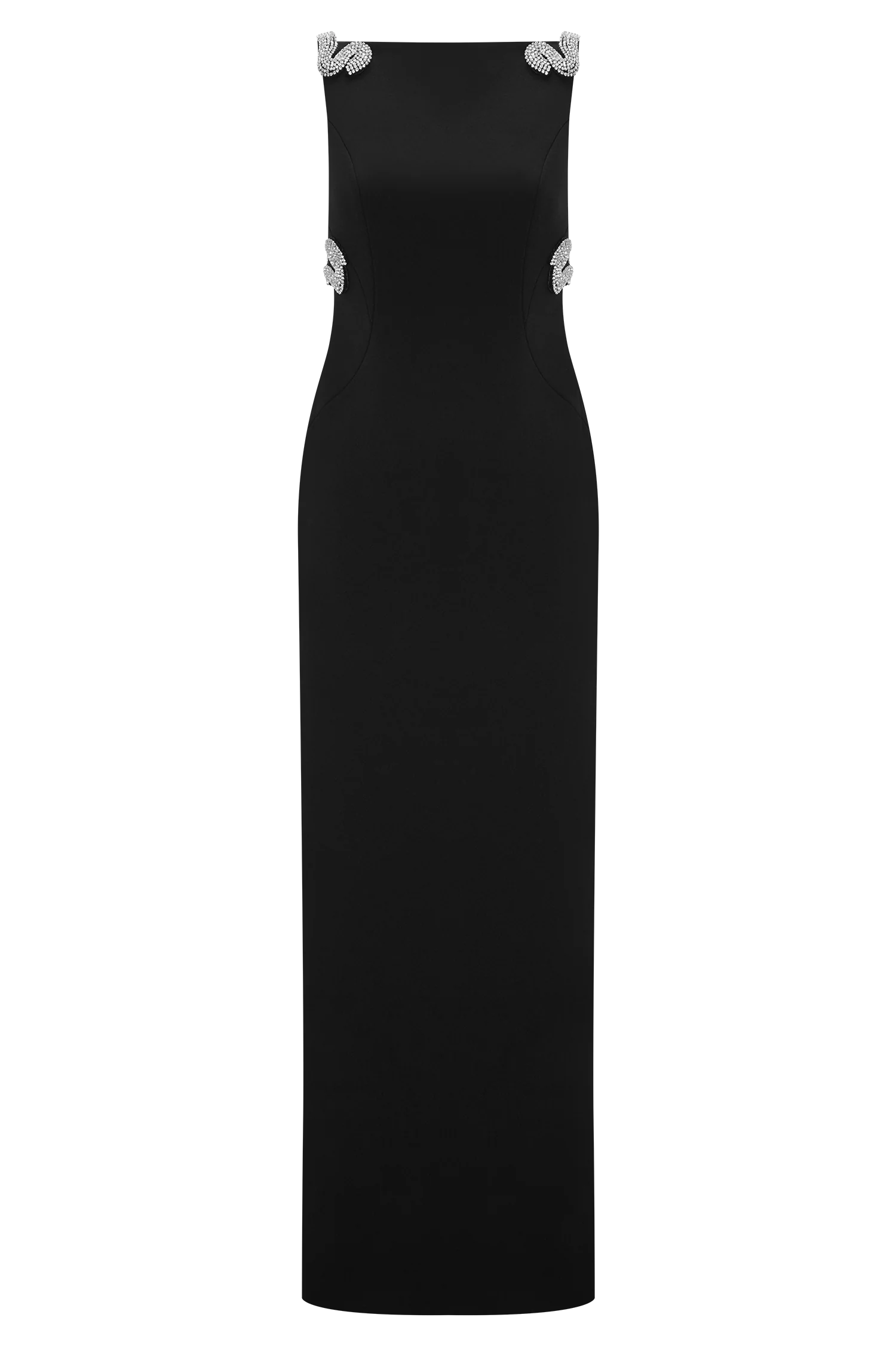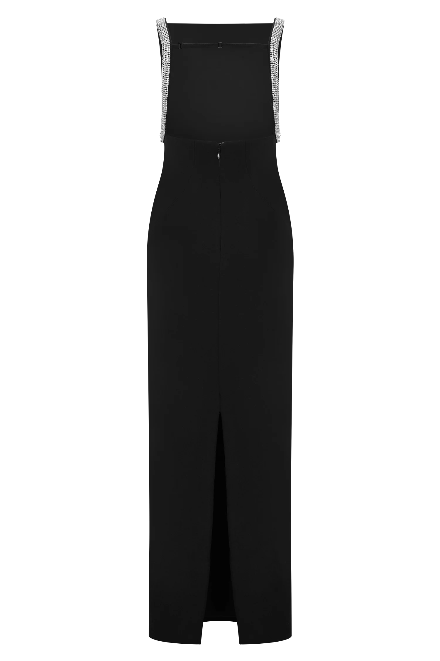 The LORDE Embellished Crepe Maxi Dress redefines minimal glamour with architectural precision and luminous detail. Designed with a high, straight neckline, it features an embellished strap that curves elegantly across the front body — a statement focal point that catches the light with subtle sophistication. The open back is secured by an adjustable strap for a confident fit, while the fully bonded crepe fabrication sculpts the silhouette to perfection. Fully lined in stretch matte fabric for comfort and movement, this bodycon design is finished with a centre back split and invisible zip for ease and refinement.