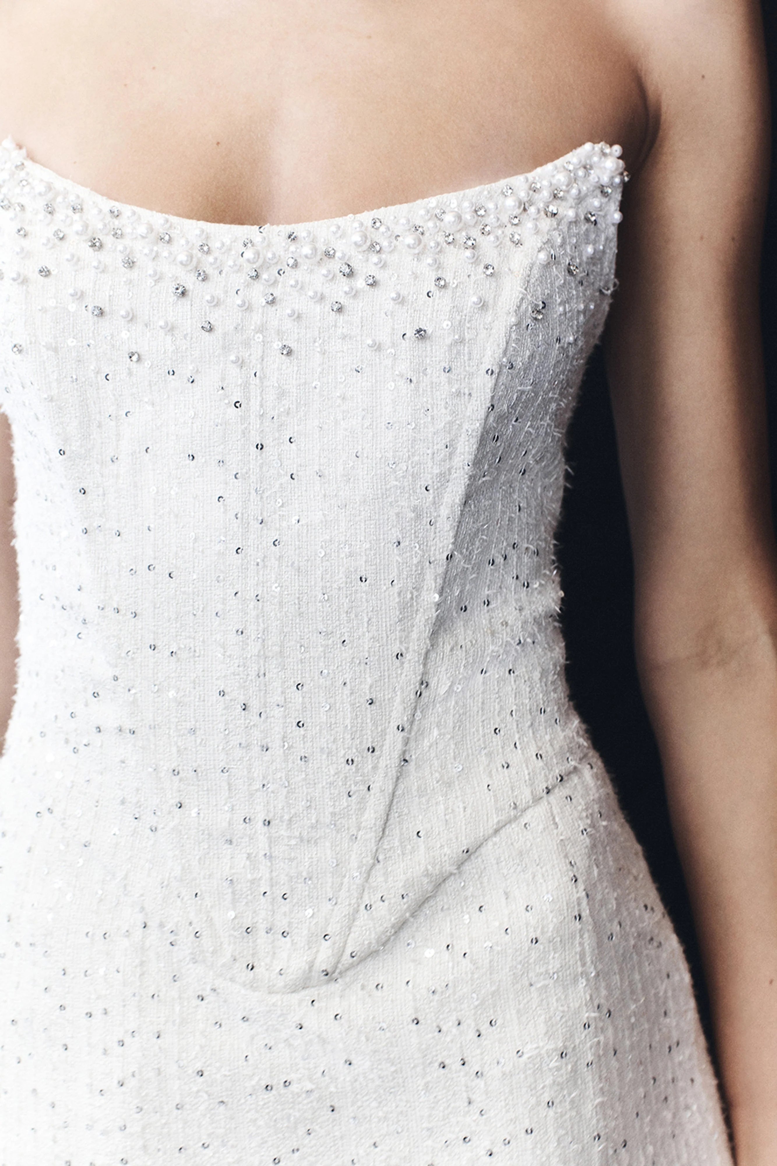 The LORRIE Tweed Corset Mini Dress is a stunning fusion of classic sophistication and modern allure. Featuring a strapless scooped neckline, this dress highlights the décolletage with elegance, while intricate hand-beaded detailing adds a touch of luxury. The corseted bodice, complete with boning and an internal waist stay, sculpts and supports for a flawless fit. Crafted from shimmering sequin tweed, the structured mini skirt balances refined tailoring with a bold, fashion-forward edge. Fully lined for comfort and finished with a back zip and hook-and-eye closure, the Lorrie dress is the perfect statement piece for glamorous evenings, celebratory moments, and unforgettable nights.
