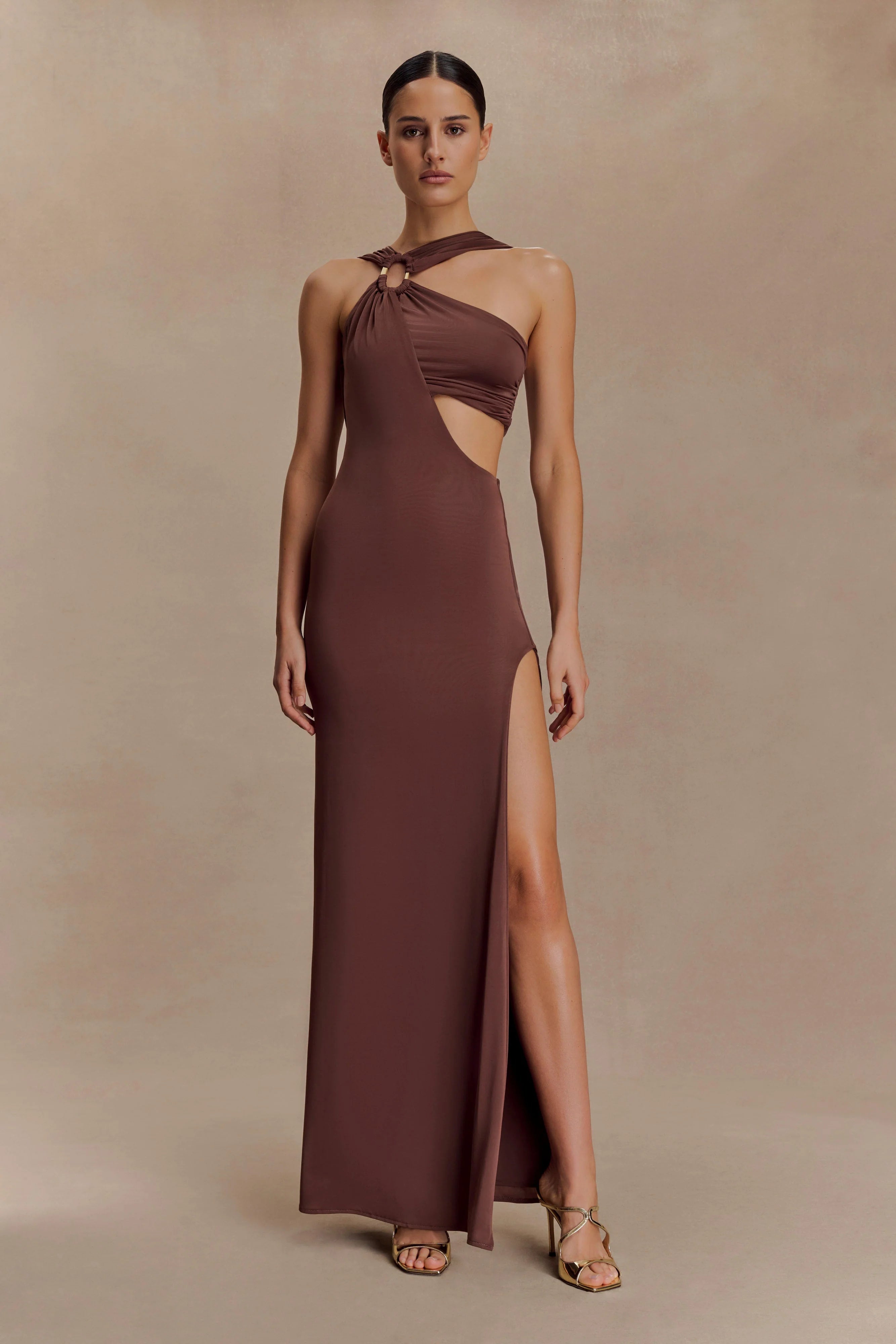 The LOTTIE Slinky Maxi Dress With Split is a modern statement in asymmetry. Designed with a gathered neckline and sculptural hardware detail, LOTTIE flatters the frame with subtle waist cut-outs and a fluid side seam split. The partially lined silhouette clings in all the right places, offering just enough coverage while keeping the look sleek and sultry. Perfect for nights that call for confidence and impact.