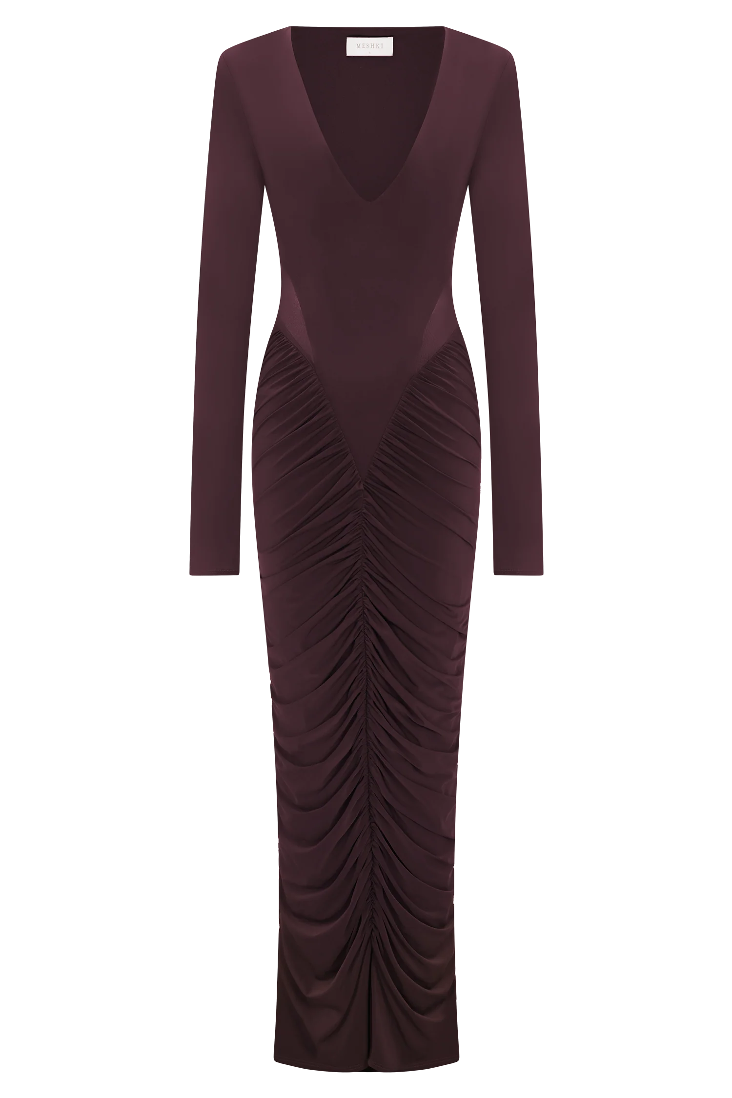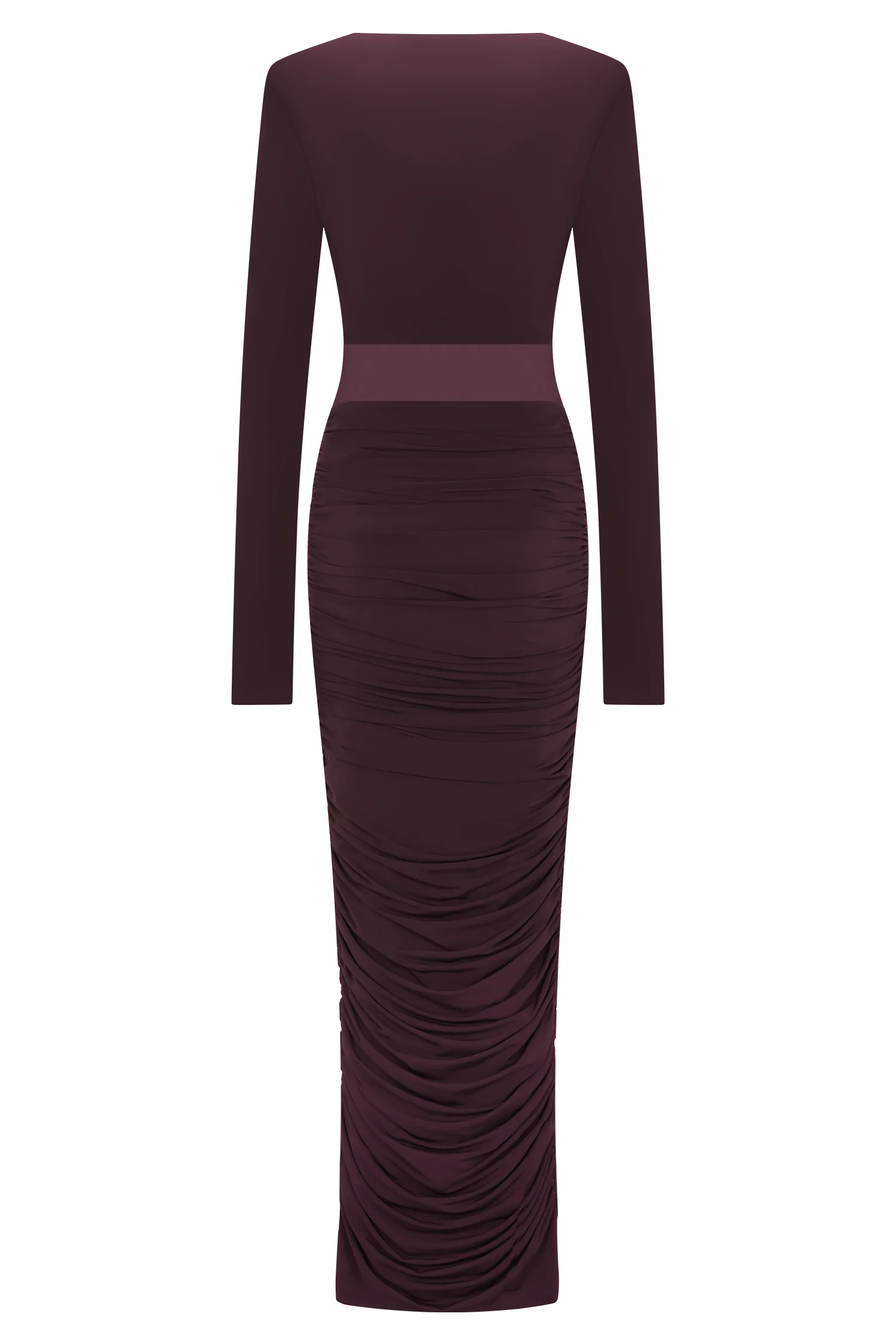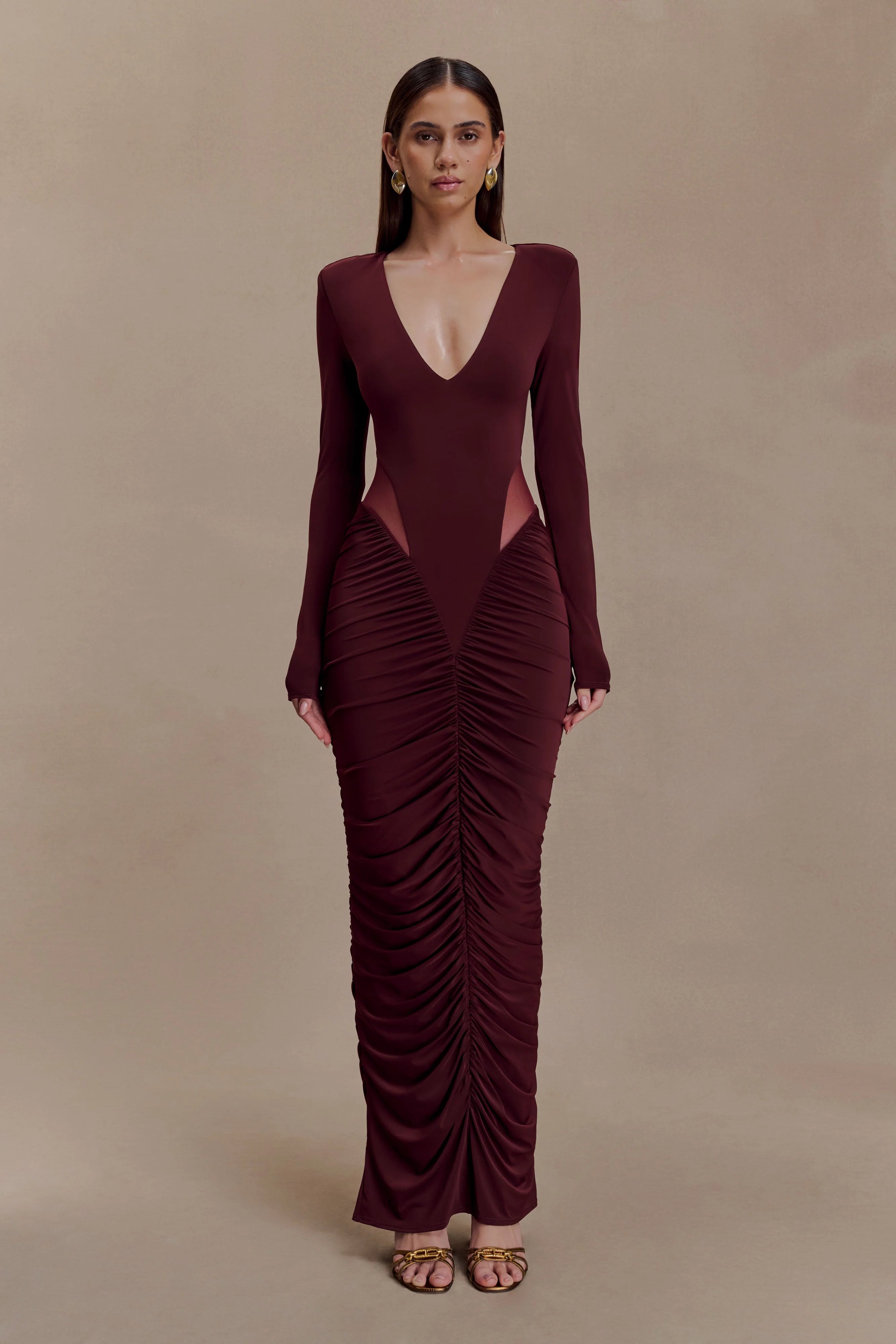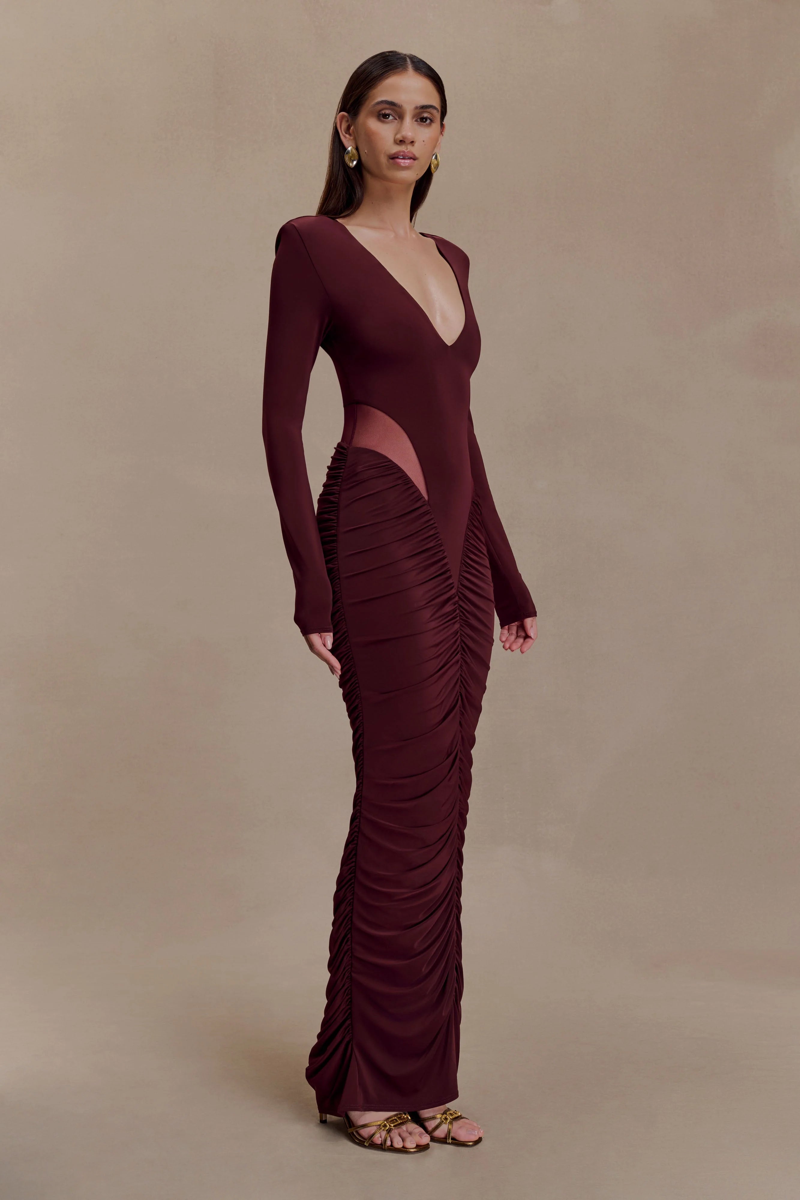 The LOUANNE Slinky Long Sleeve Maxi Dress is a striking silhouette designed with directional detail. A plunging V neckline is balanced by long sleeves, while a centre cut-out adds bold allure. Gathered accents shape the skirt, enhancing the fitted bodycon design with fluid dimension. Complete with detachable shoulder pads for a structured option, and cut to a maxi length, this dress blends versatility with after-dark sophistication.