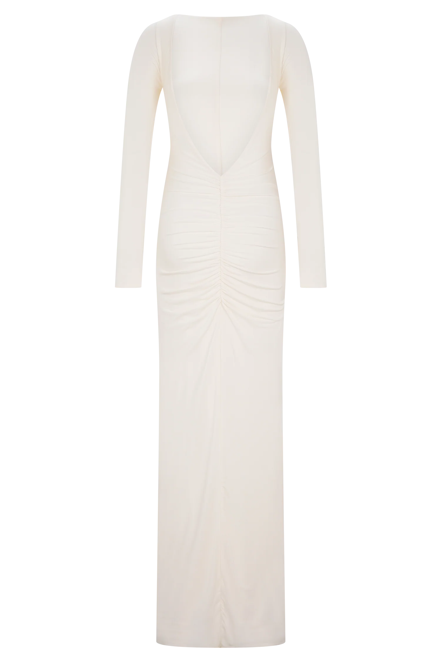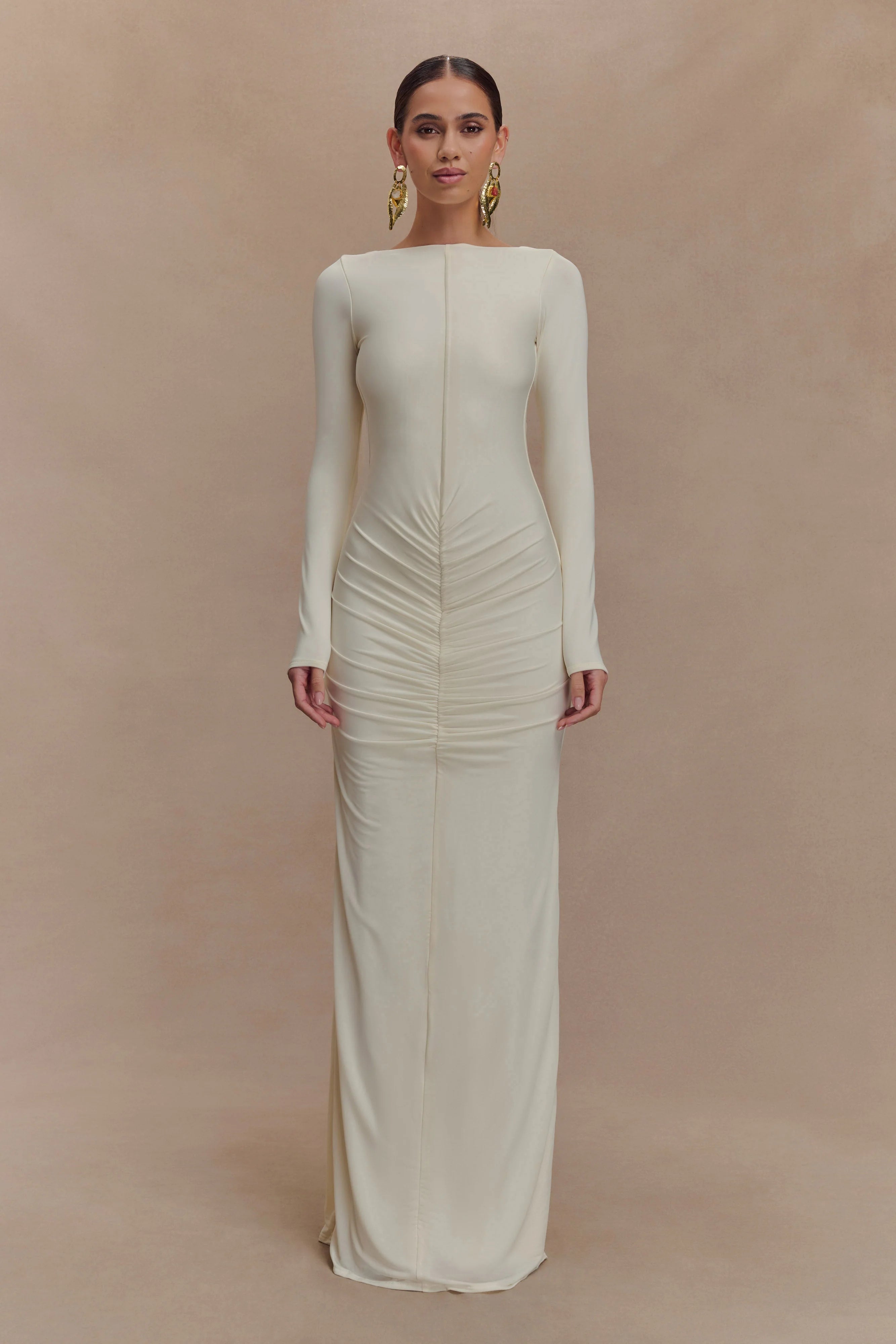 The LOUISA Long Sleeve Slinky Maxi Dress is an elegant statement in modern minimalism. Designed with a graceful boat neckline and a dramatic low V-back, this fully lined silhouette hugs the body with a sleek, fitted shape. Long sleeves and gathered shoulder details add soft volume, while a ruched hip brings subtle texture and movement. Finished in a floor-grazing maxi length, this dress is made for evenings that call for quiet drama and effortless sophistication.