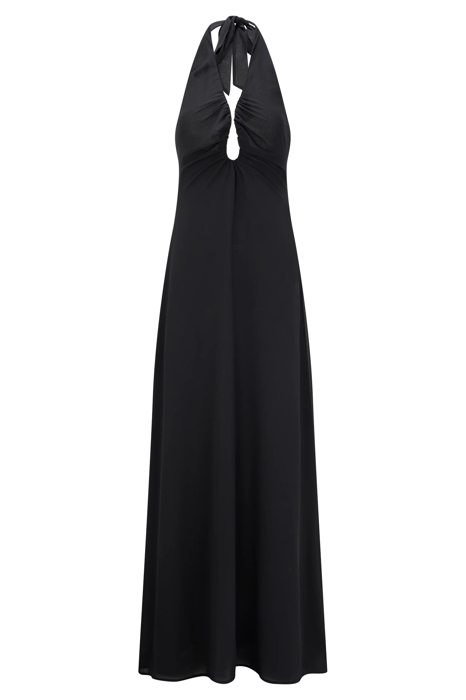 The MALAKHAI Chiffon Halter Maxi Dress is your go-to for effortless glamour, from sunlit lunches to evening soirees. Featuring a deep V halter neckline with subtle front gathering and a structured wire insert to hold its shape, this silhouette flatters with a bodycon fit through the bodice and a soft A-line flare at the hips. A side seam invisible zipper keeps the finish clean, while the sleek hardware neck closure adds a refined edge. Fully lined and designed without padding for a natural, easy fit, this dress is made to move with you from day to night.
