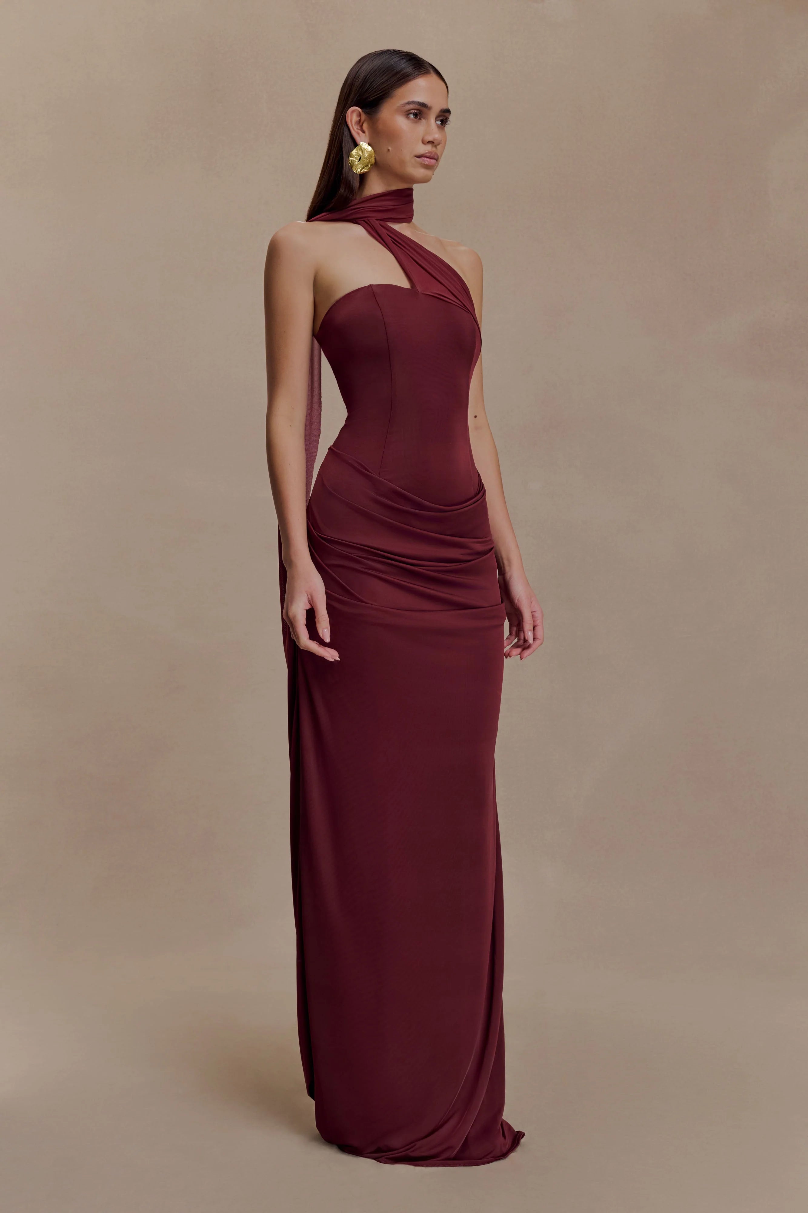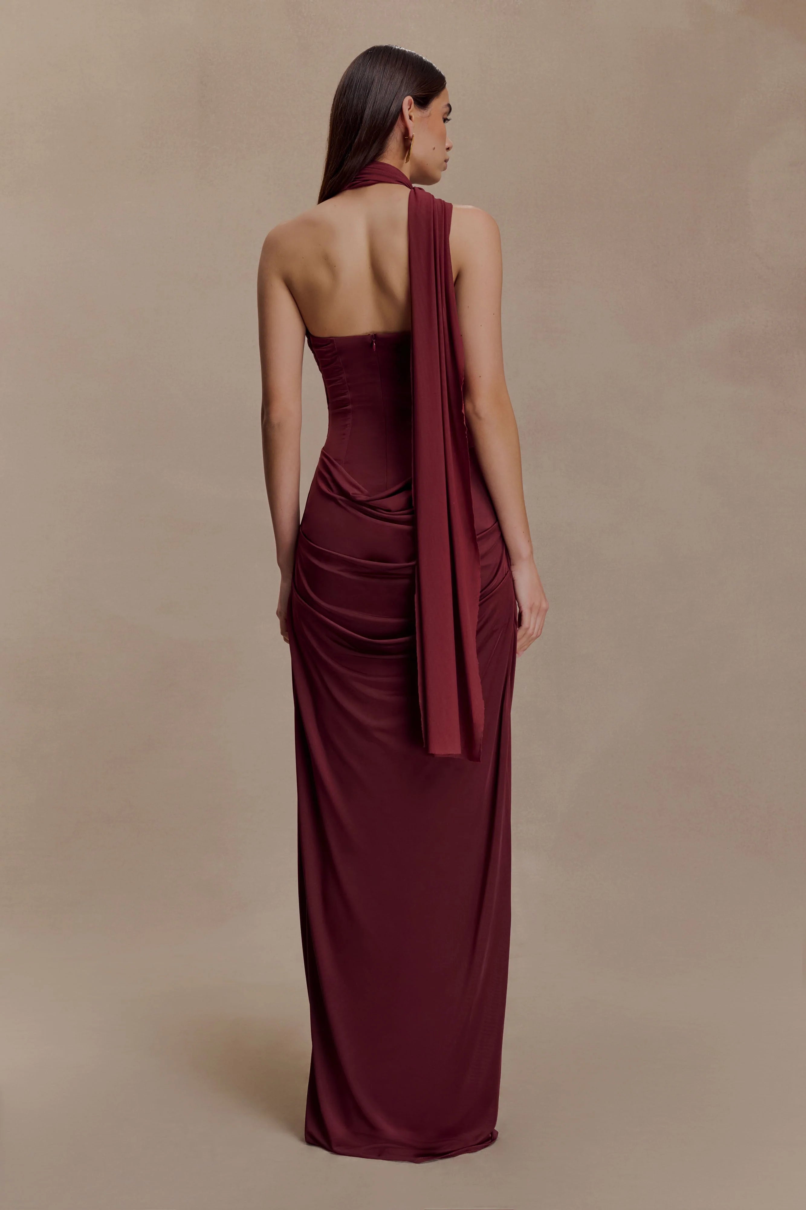 The MATTEA Slinky And Mesh Maxi Dress With Scarf is a directional piece designed with modern elegance in mind. Featuring a strapless sweetheart neckline, it’s structured with a corset-style bodice that sculpts the frame. A draped overlay skirt with pleats at the side seams adds movement to the fitted silhouette, while the maxi length creates an elongating finish. The attached scarf, draped from the underarm, offers a versatile styling accent, elevating this dress into a statement of sophistication. Fully lined and finished with an invisible zip, it’s a piece designed for confident after-dark dressing.