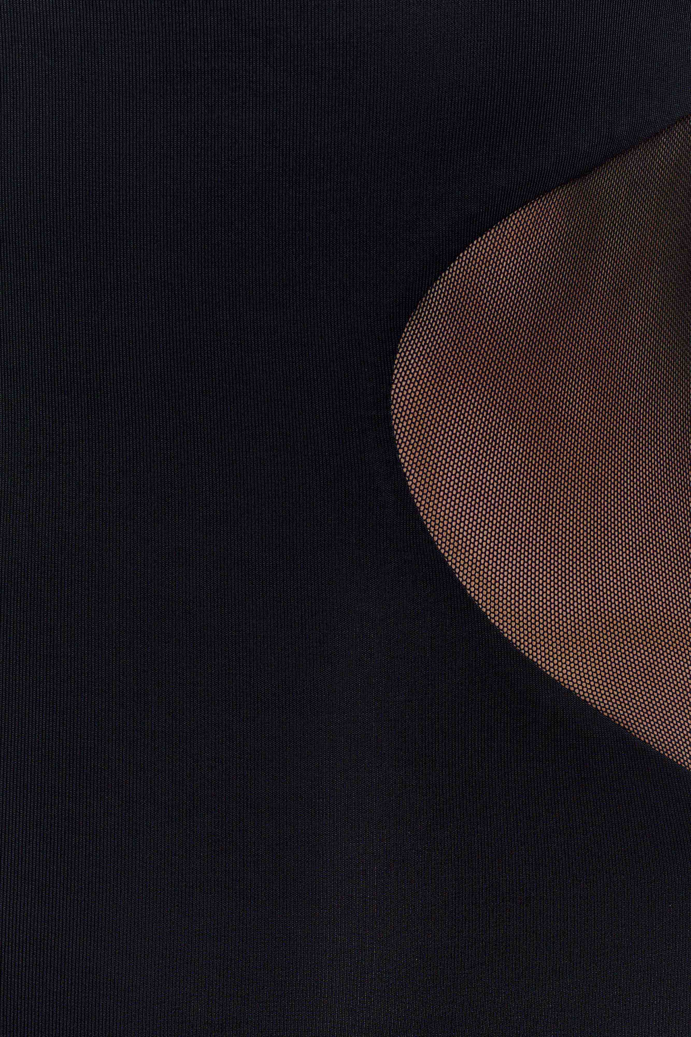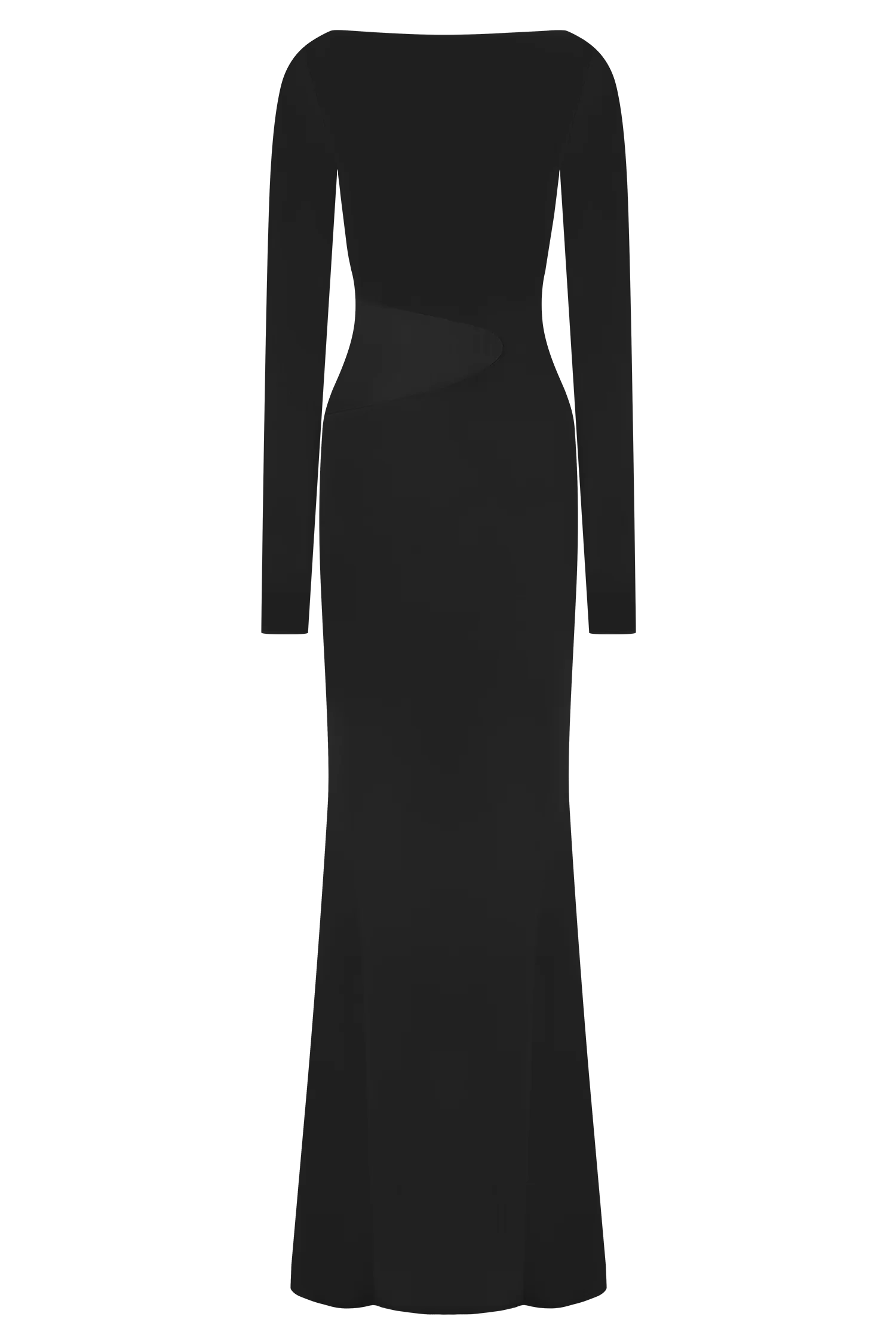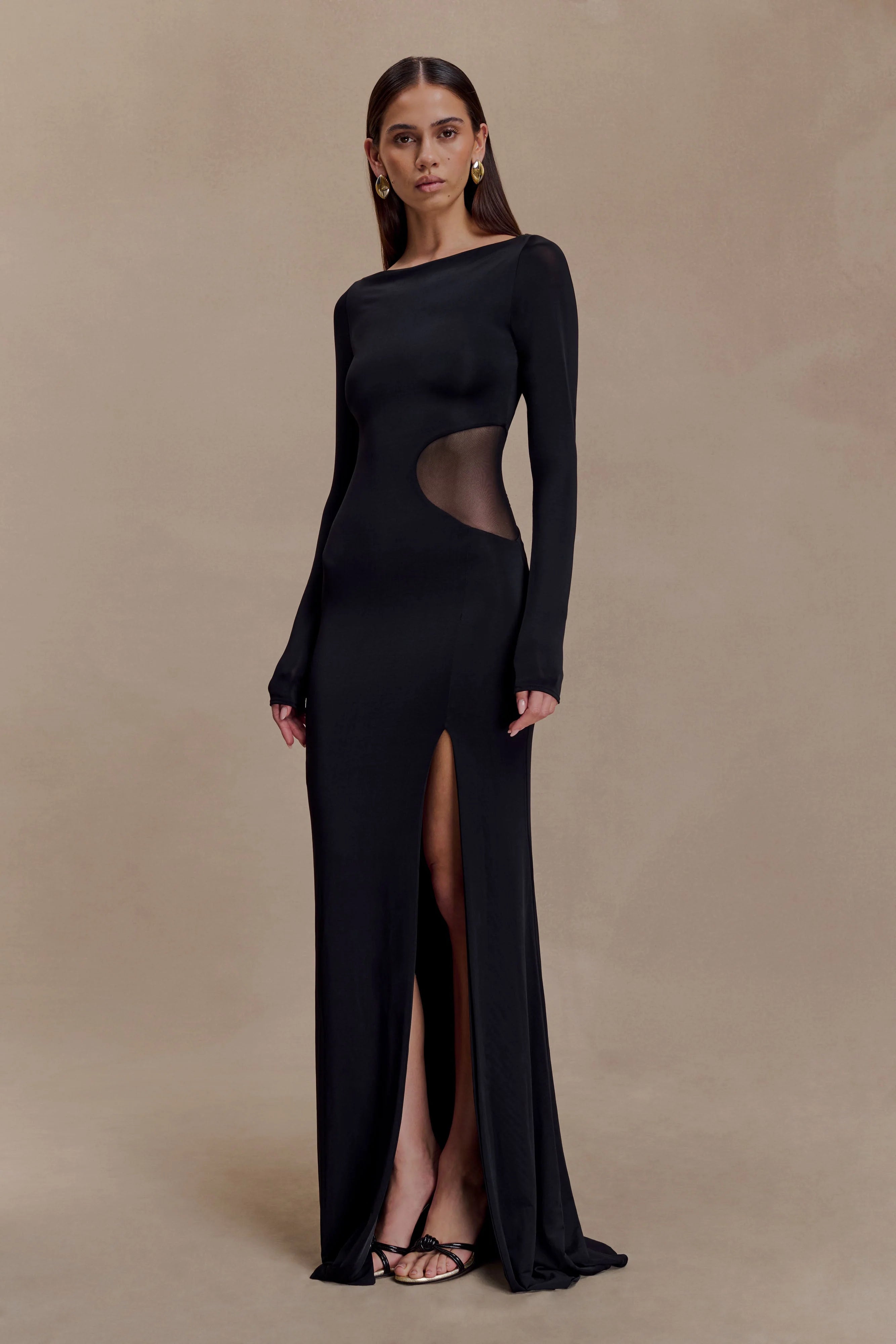 The MEGAN Slinky And Mesh Maxi Dress is designed to command attention with its sculpted fit and directional detailing. Featuring a clean boat neckline and long sleeves, it’s balanced by side waist cut-outs and a thigh-grazing front split that reveal just enough. Crafted in a slinky fabrication with mesh panels, it’s partially lined to offer both coverage and contrast. Falling to a maxi length in a bodycon silhouette, this dress is the ultimate after-dark statement.