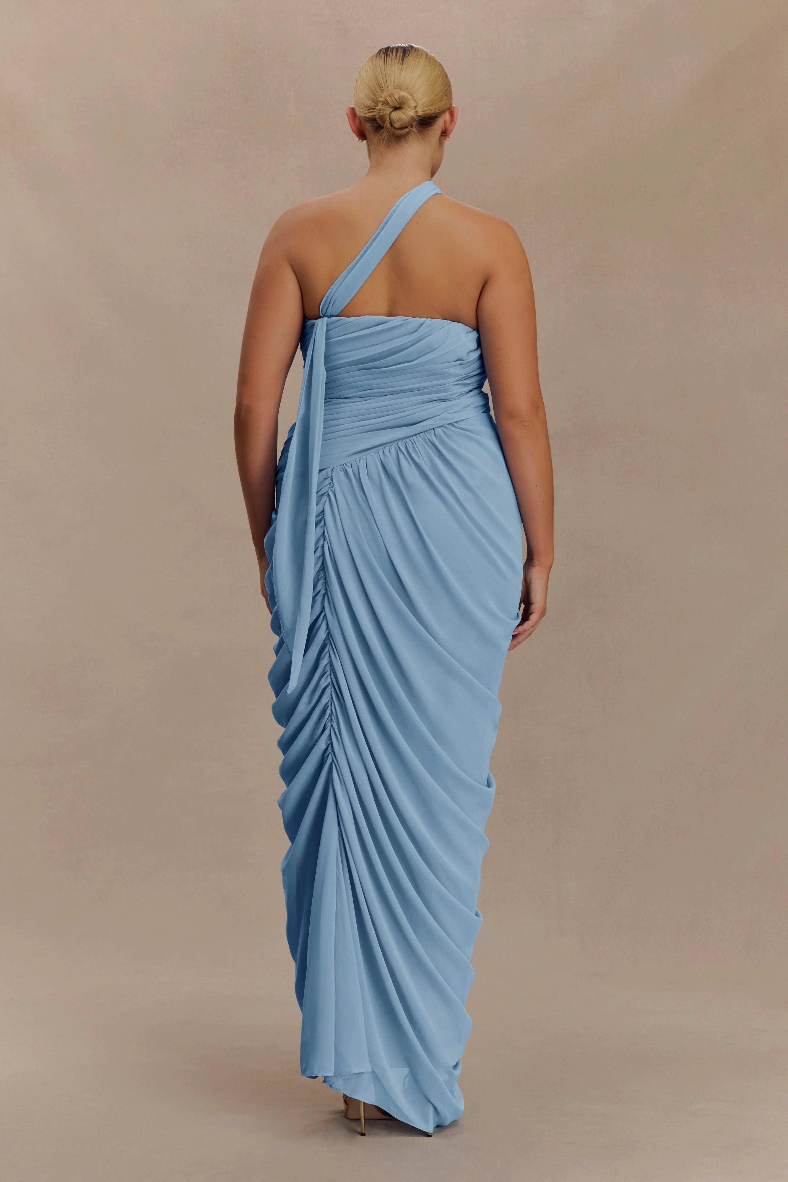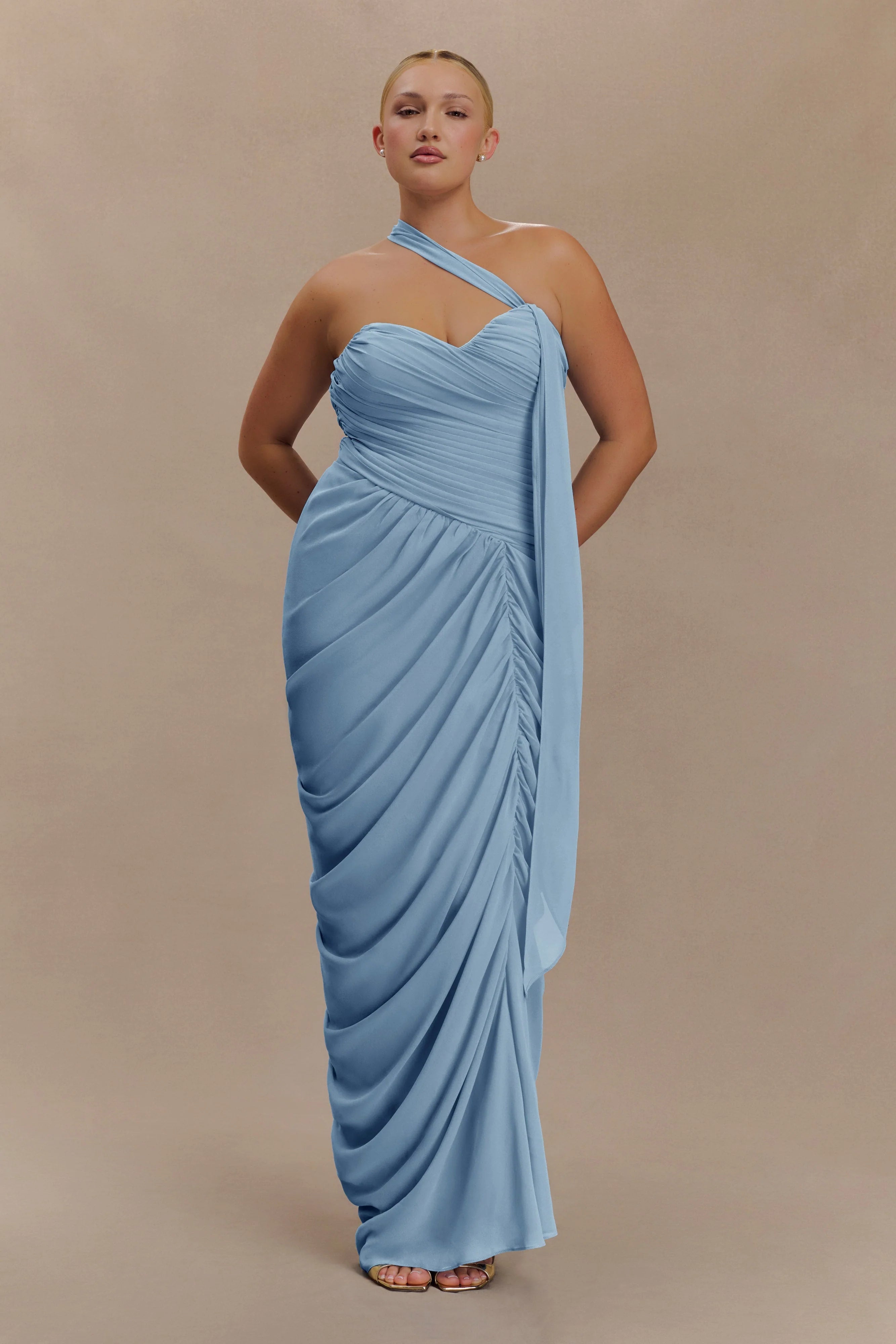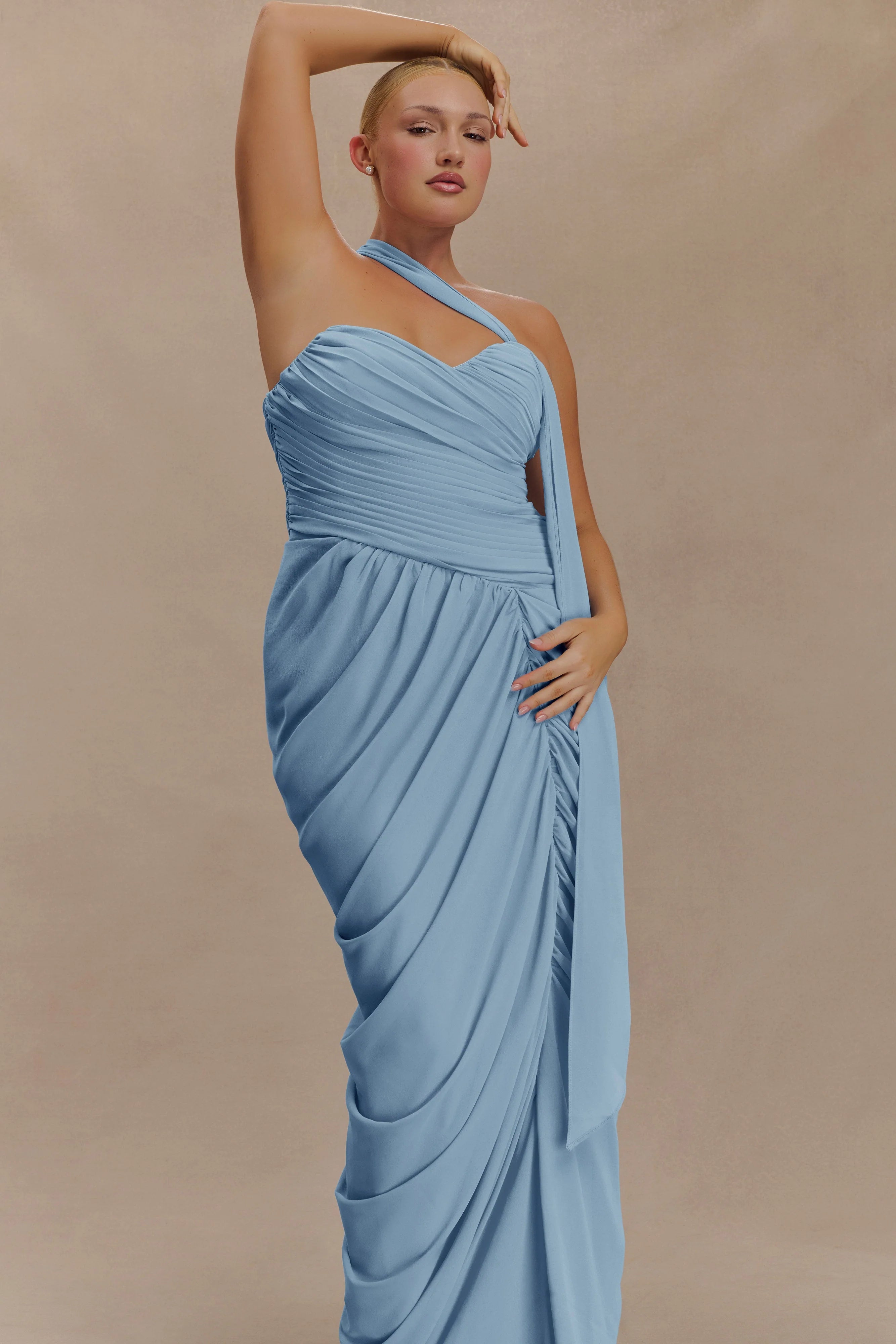 The MICAELA Chiffon Gathered Maxi Dress blends fluid chiffon with structured design for an elegant, hourglass effect. Featuring a sweetheart strapless neckline, it’s enhanced with a fully removable asymmetric strap that can also be styled as a neck scarf for versatile wear. An internal waist stay ensures a secure fit, while the invisible side zip keeps the finish sleek. Fully lined for comfort and cut to a maxi length, this dress moves effortlessly between romantic moments and elevated occasions.