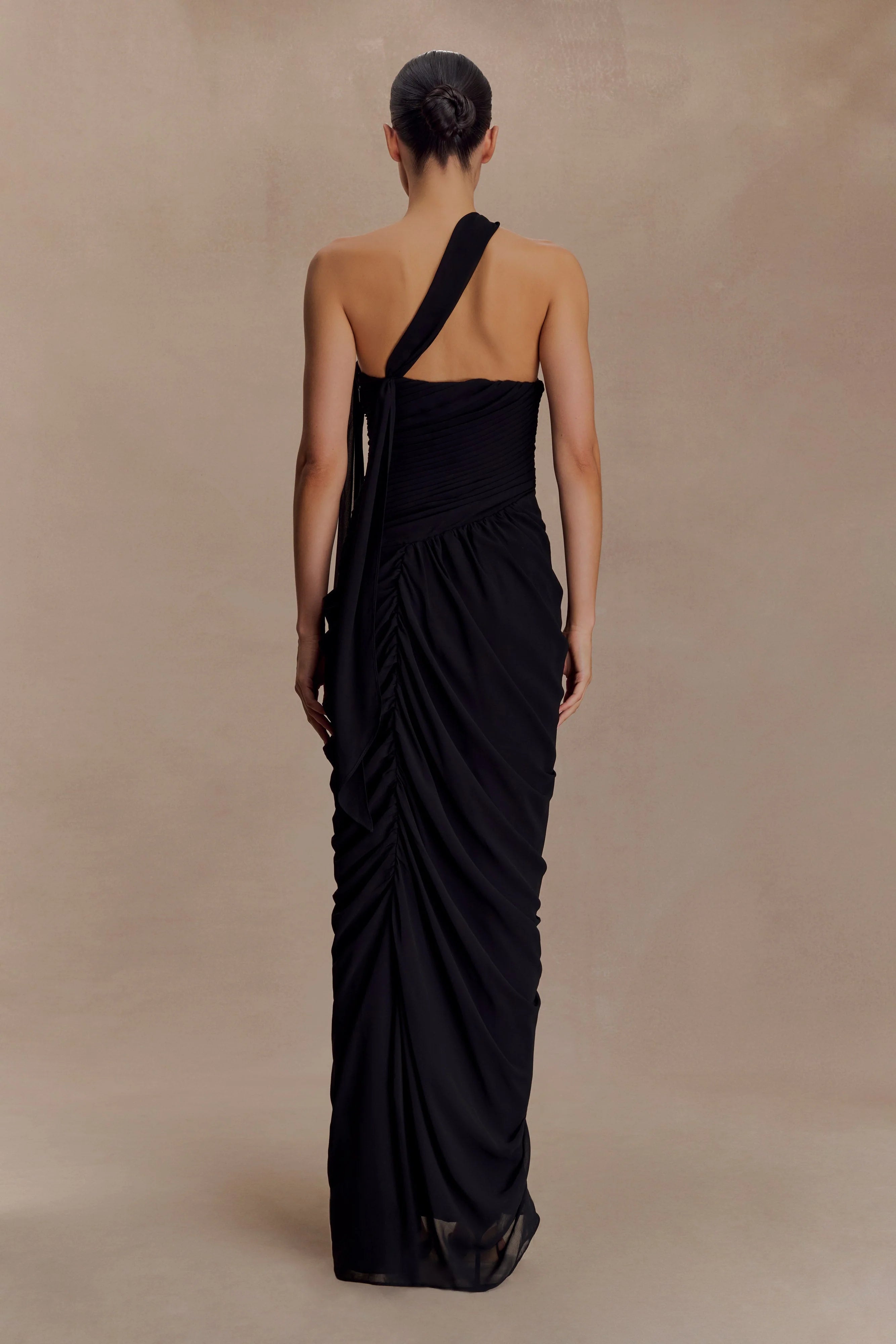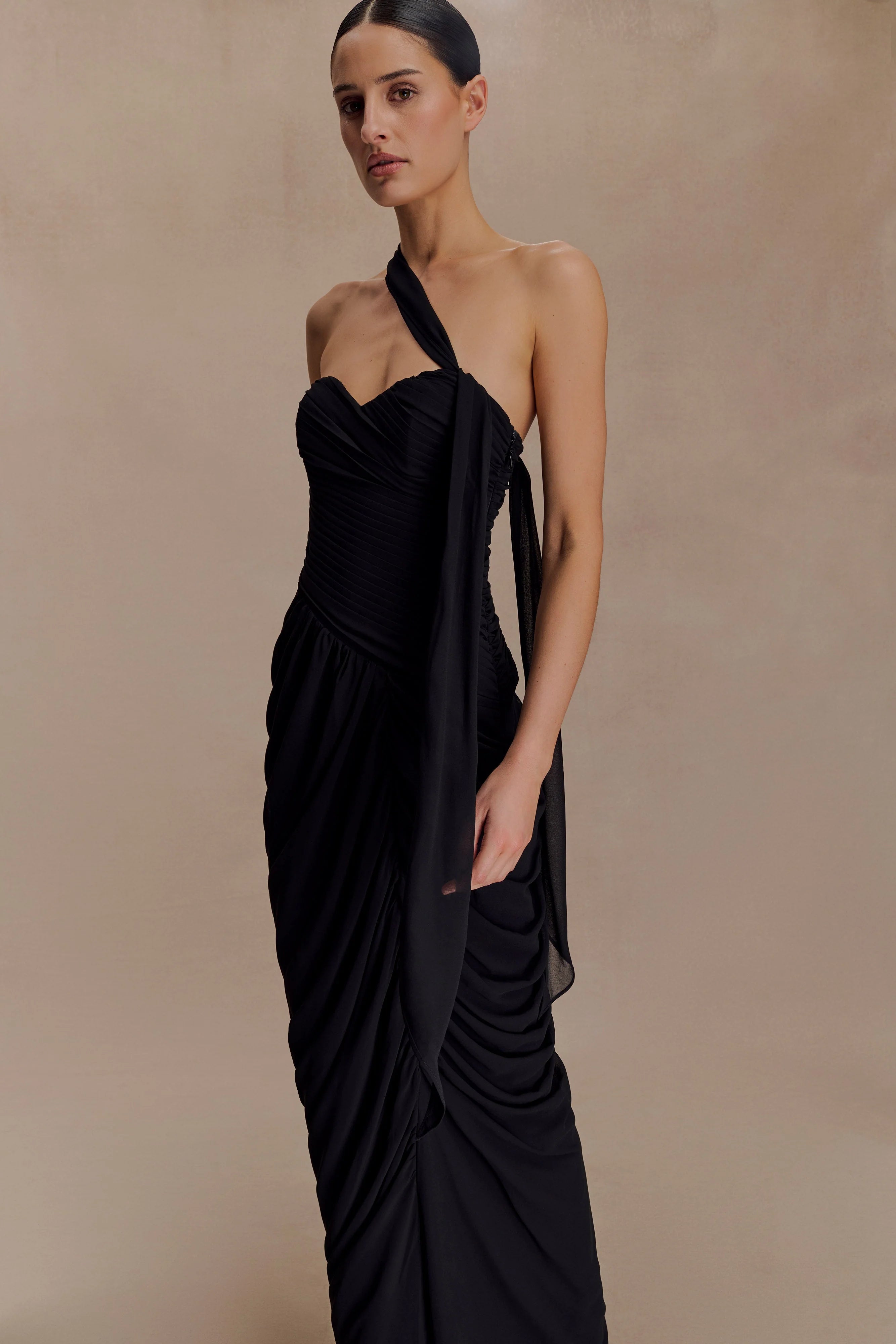 The MICAELA Chiffon Gathered Maxi Dress blends fluid chiffon with structured design for an elegant, hourglass effect. Featuring a sweetheart strapless neckline, it’s enhanced with a fully removable asymmetric strap that can also be styled as a neck scarf for versatile wear. An internal waist stay ensures a secure fit, while the invisible side zip keeps the finish sleek. Fully lined for comfort and cut to a maxi length, this dress moves effortlessly between romantic moments and elevated occasions.