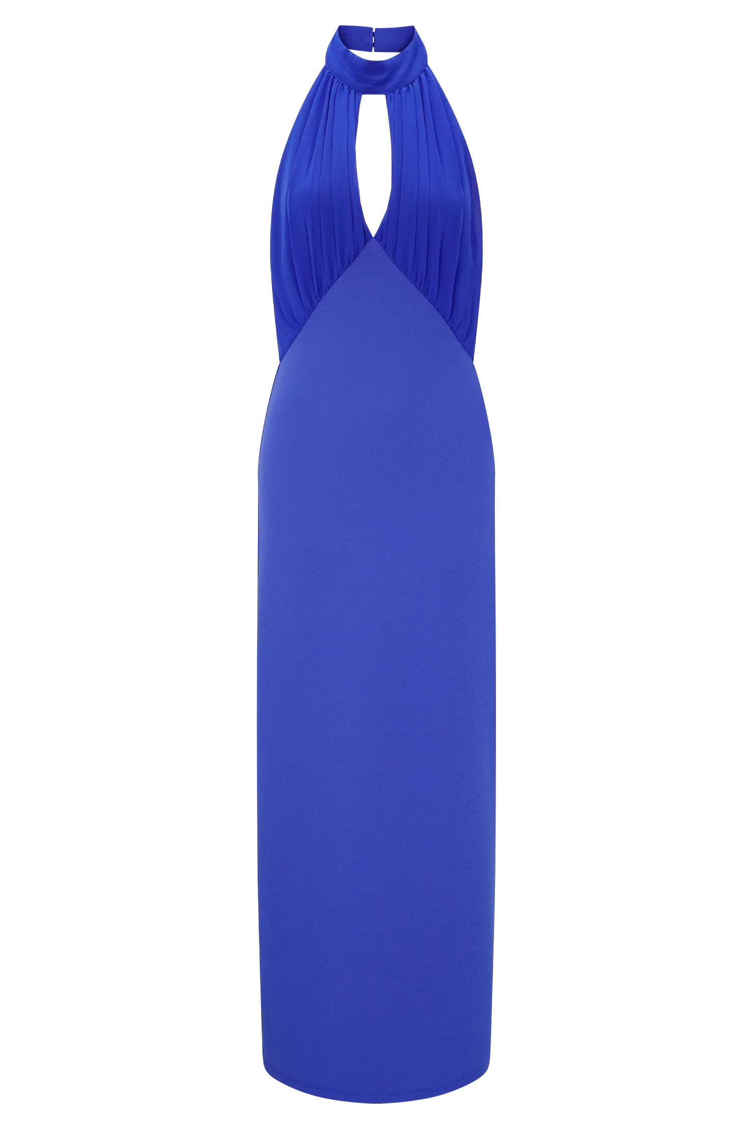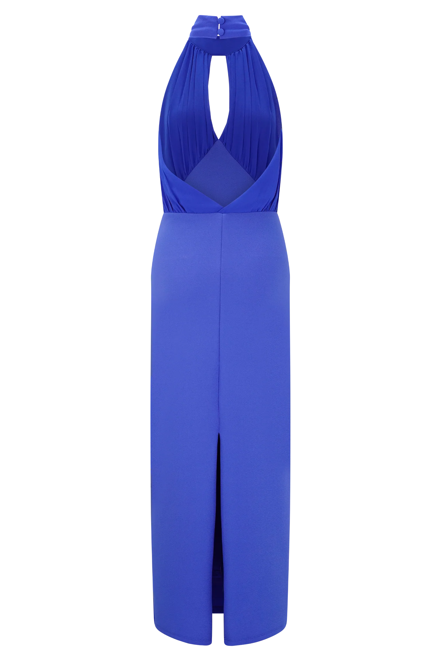 Make an unforgettable entrance in the MIERAH Halter Midi Dress, a statement silhouette with striking detail. Featuring an asymmetrical twisted neckline and cross-over back straps, this design highlights the décolletage while revealing a softly draped cowl back for a touch of allure. The fitted shape skims the body before flaring into a fishtail hem, creating graceful movement with every step. Fully lined for comfort and structure, this dress is your go-to for elevated evenings and special moments.