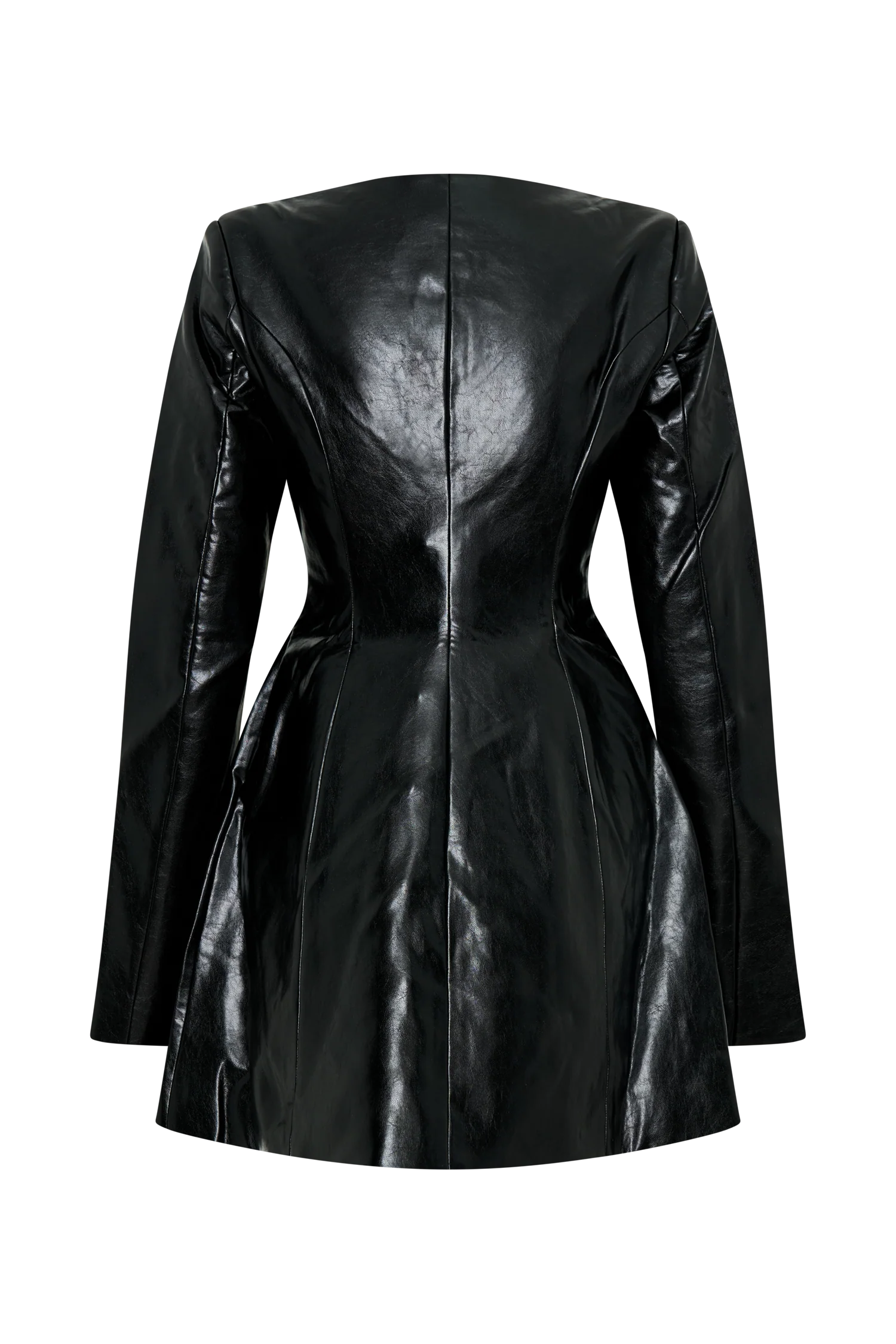 Make a striking statement with the NANCY Faux Leather Mini Dress, a perfect blend of edgy style and sophisticated design. Featuring a chic boat neckline that elegantly frames your décolletage, structured shoulders add a bold, confident touch. The long sleeves provide a sleek contrast to the mini length, making it ideal for any occasion. With a central front button closure, this dress offers a polished finish, while the structured skirt shape creates a flattering silhouette that accentuates your figure. Non-functional pockets enhance the modern aesthetic without sacrificing style.
