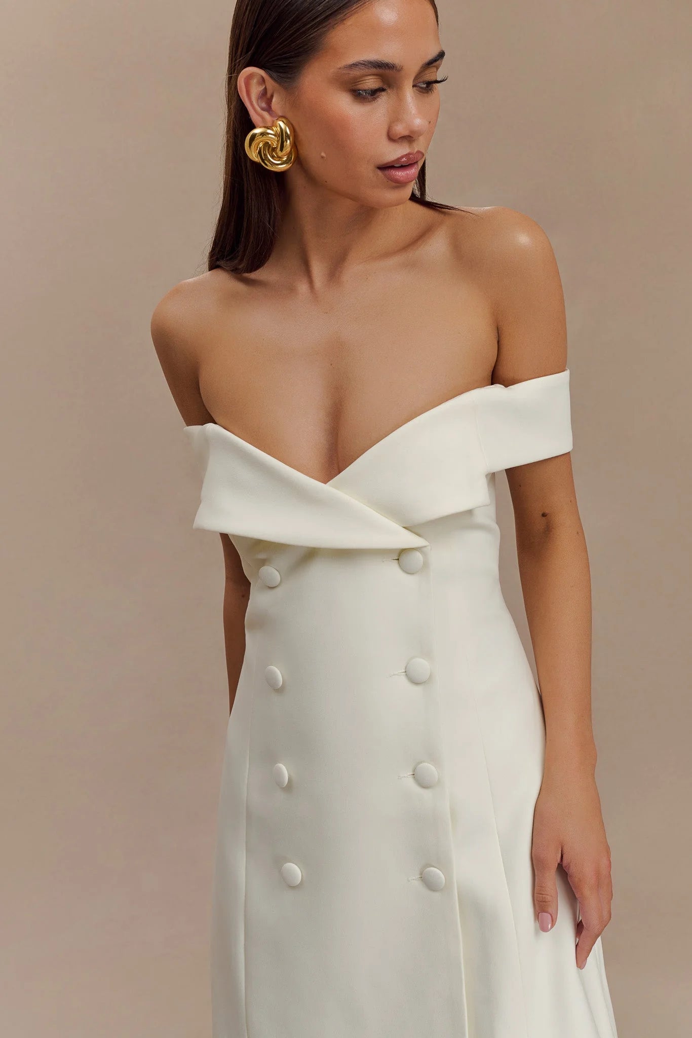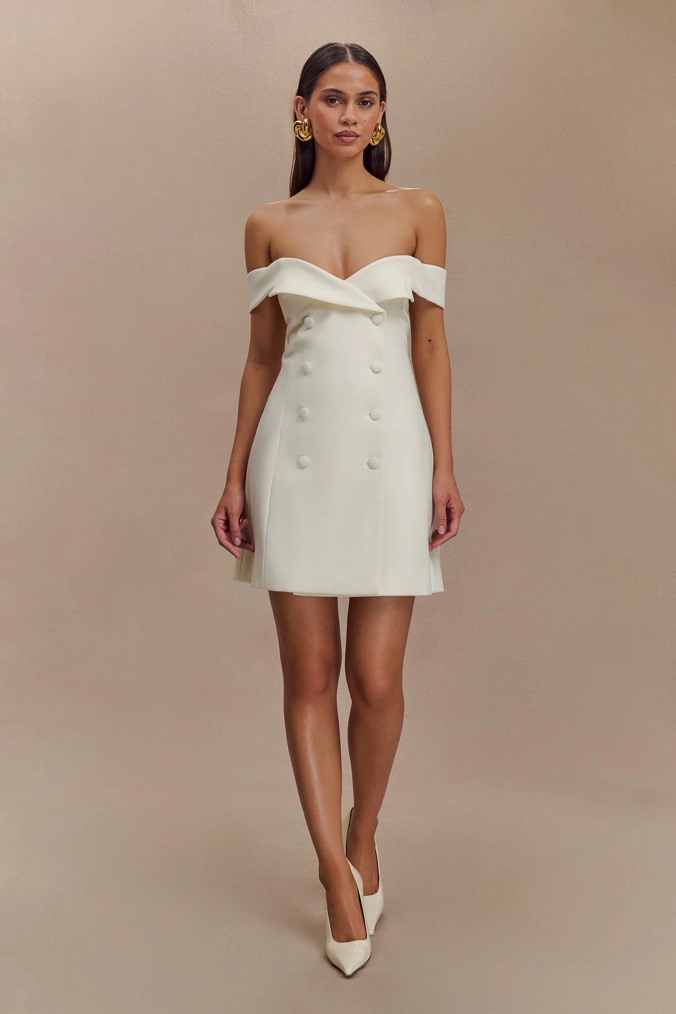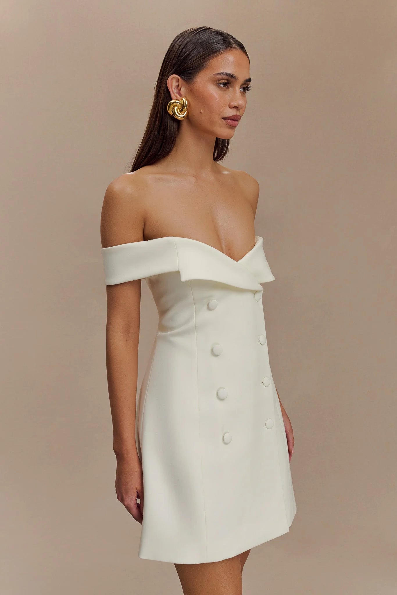 The NOELLE Off Shoulder Suiting Mini Dress is a captivating blend of sophistication and modern style. Featuring a Bardot neckline with a chic off-shoulder design and lapel detail, this mini dress exudes elegance and confidence. The functional front flap closure adds a touch of classic tailoring, while the fit-and-flare shape creates a flattering silhouette that enhances your figure. With its mini length, the Noelle Dress is perfect for making a statement at any event or evening out, effortlessly combining formal elegance with contemporary flair.