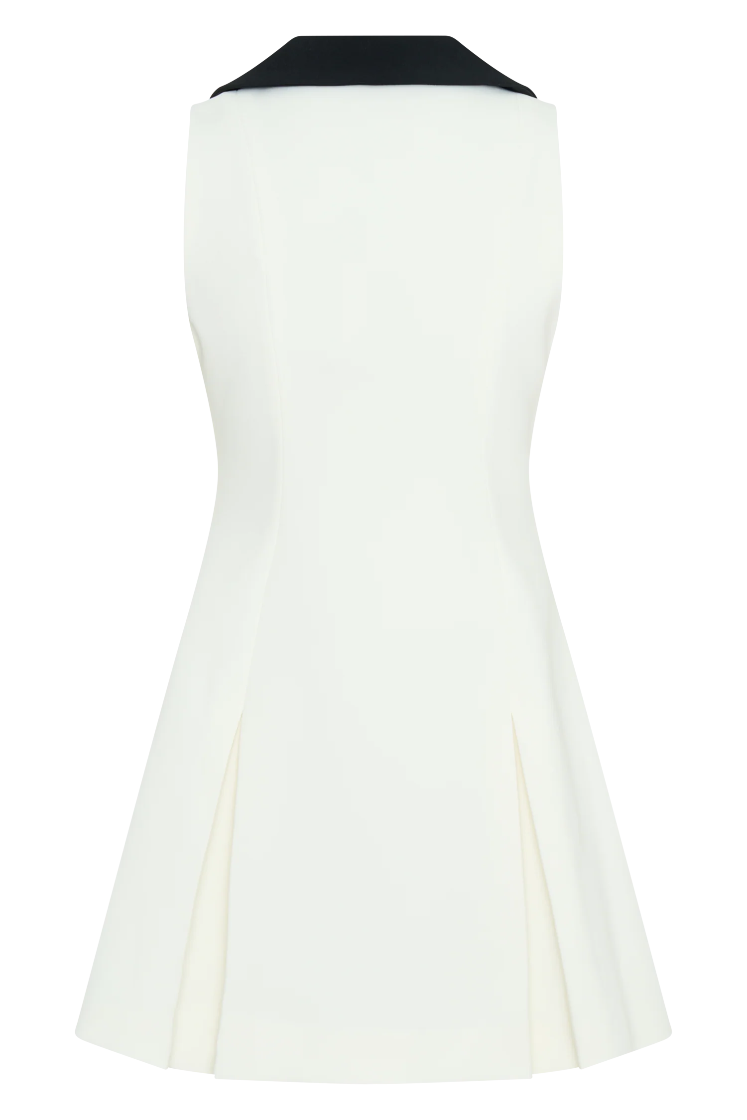 Step out in style with the OLI Sleeveless Contrast Mini Dress, a chic blend of timeless elegance and modern flair. Featuring a sharp collared neckline and button-front detail, this dress exudes polished charm. The flared pleated skirt adds movement and a playful touch, while the mini length keeps the look youthful and fresh. Decorative buttons and a striking black-and-white colorway with a contrasting collar elevate the design, making it perfect for any occasion. Whether for a daytime event or an evening out, this dress ensures you’ll always stand out in style.