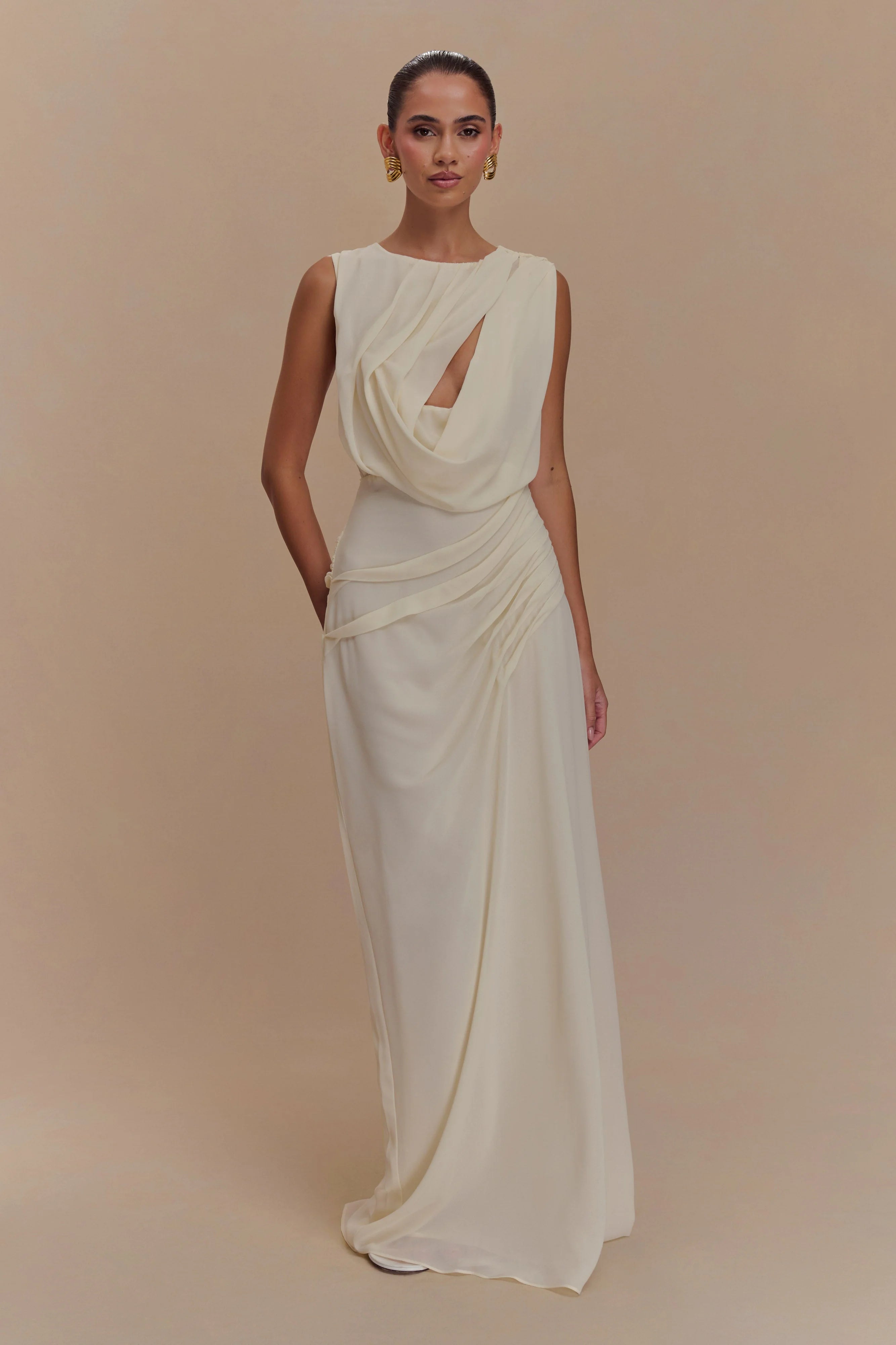 Make a statement in the ORIA Chiffon Maxi Dress, where ethereal design meets modern allure. This elegant piece features an asymmetrical neckline with a bold cutout and a draped neckline and waist detail that flatters your silhouette. The open back, secured by a delicate back neck tie, adds a touch of drama, while the flowing chiffon maxi skirt creates a graceful finish. Perfect for formal occasions or evening soirées, this dress ensures you captivate from every angle.