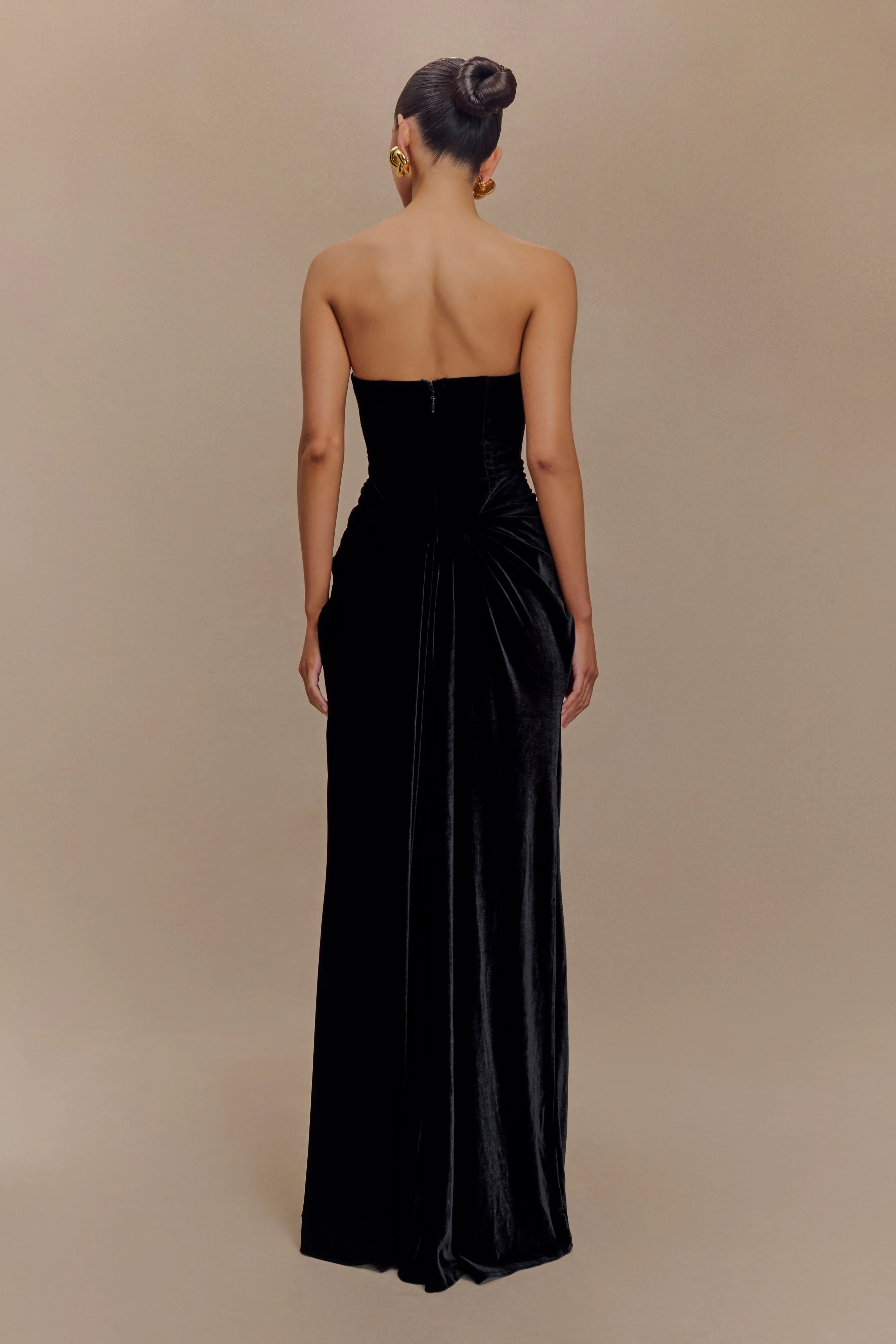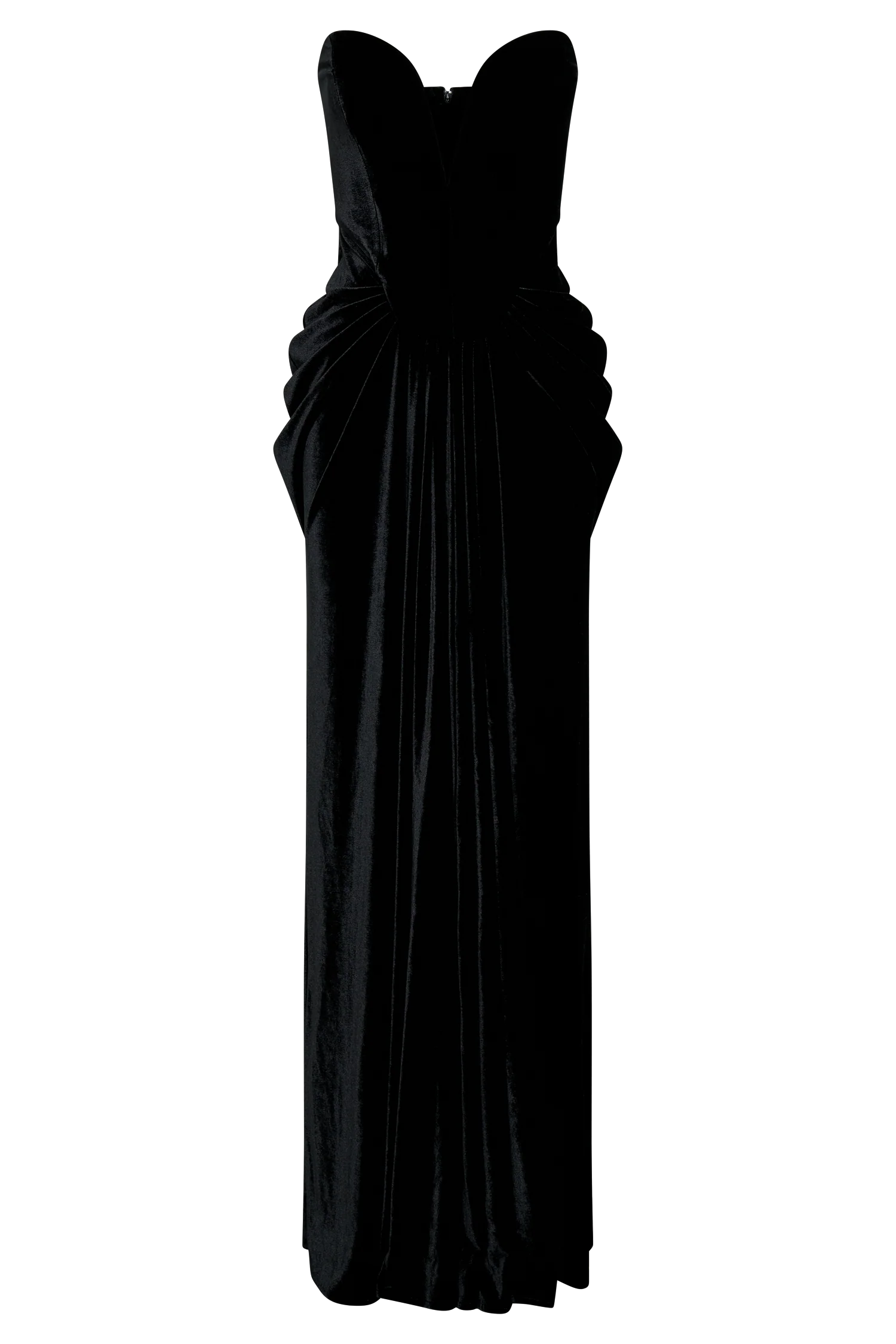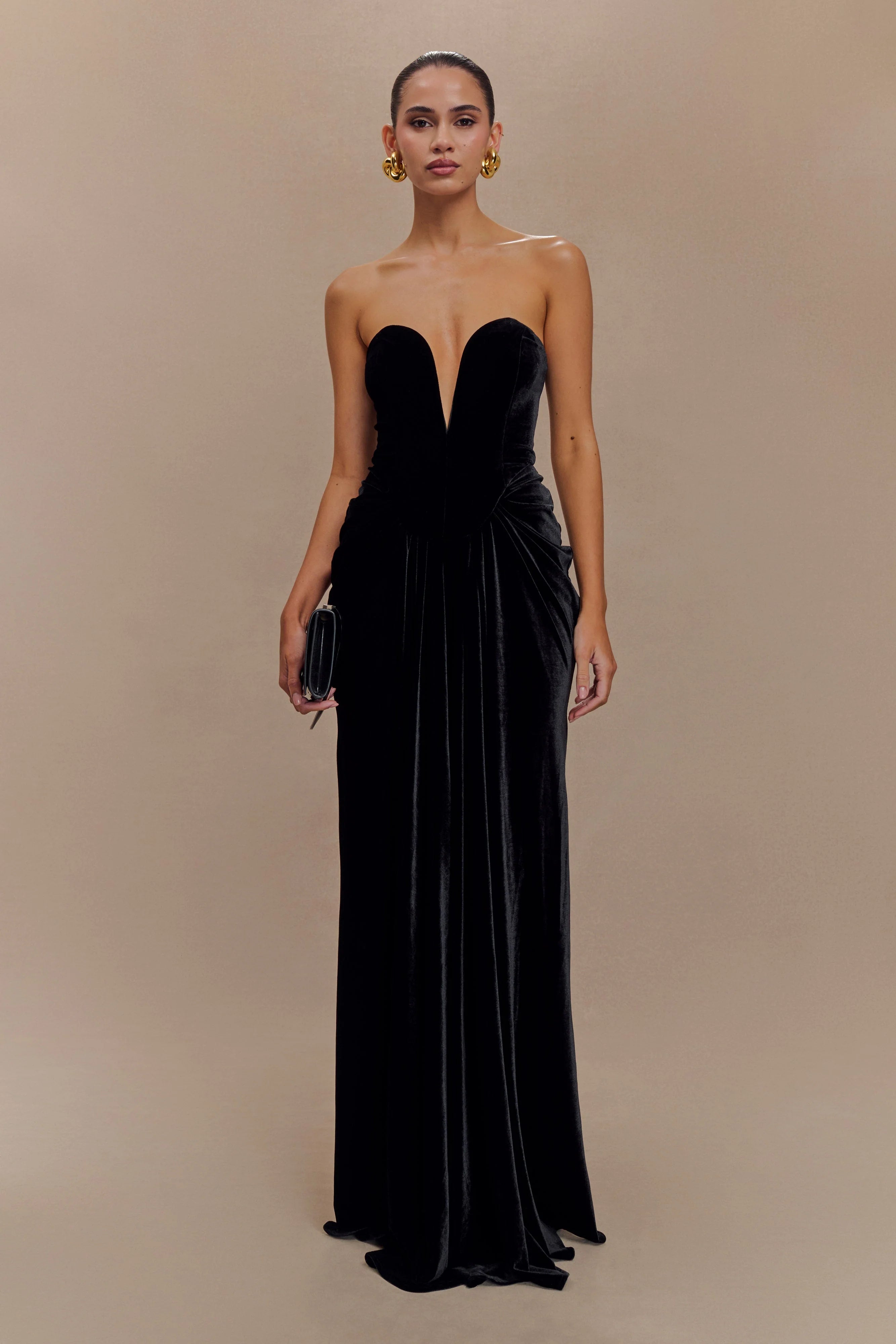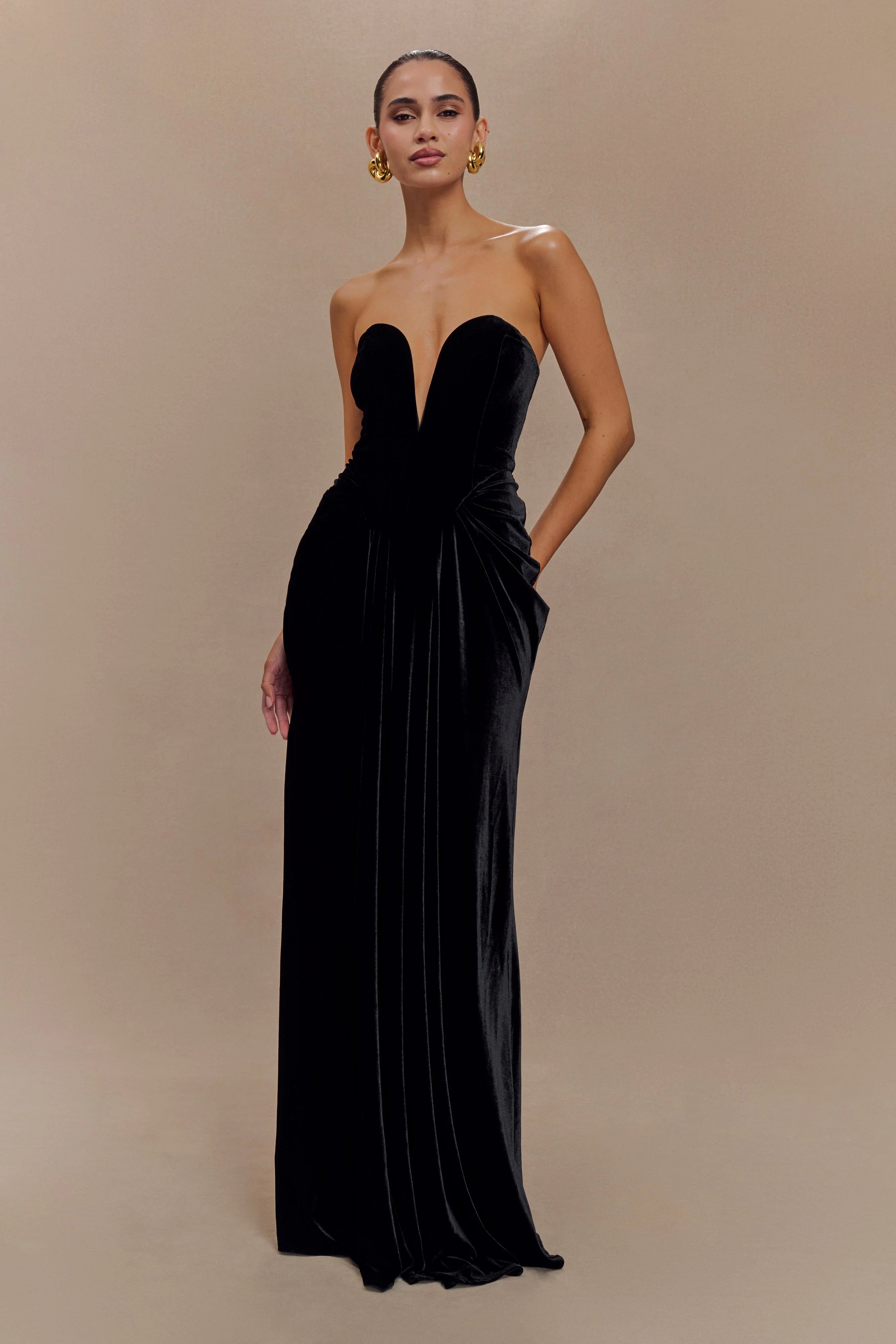 The PAIGE Strapless Velvet Maxi Dress combines elegance with sultry sophistication. Featuring a strapless design and a deep plunge neckline, it beautifully accentuates the décolletage. The corset waist shapes and defines your figure, while gathering at the hips adds movement and volume, creating a flattering silhouette. Crafted from rich velvet, the dress has a luxurious finish that catches the light with every step. With a centre-back zip for a secure fit, the maxi length offers a dramatic and graceful finish.