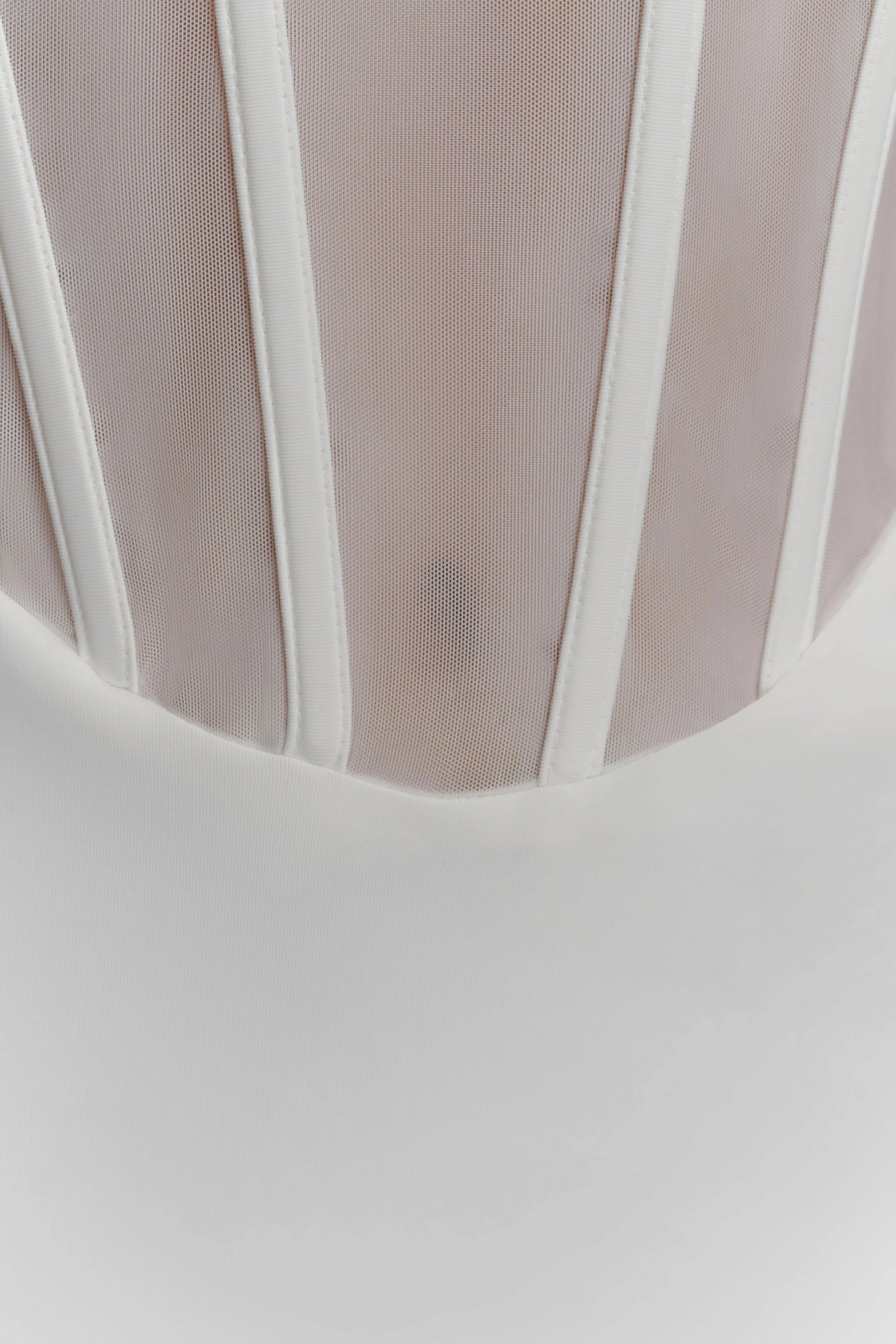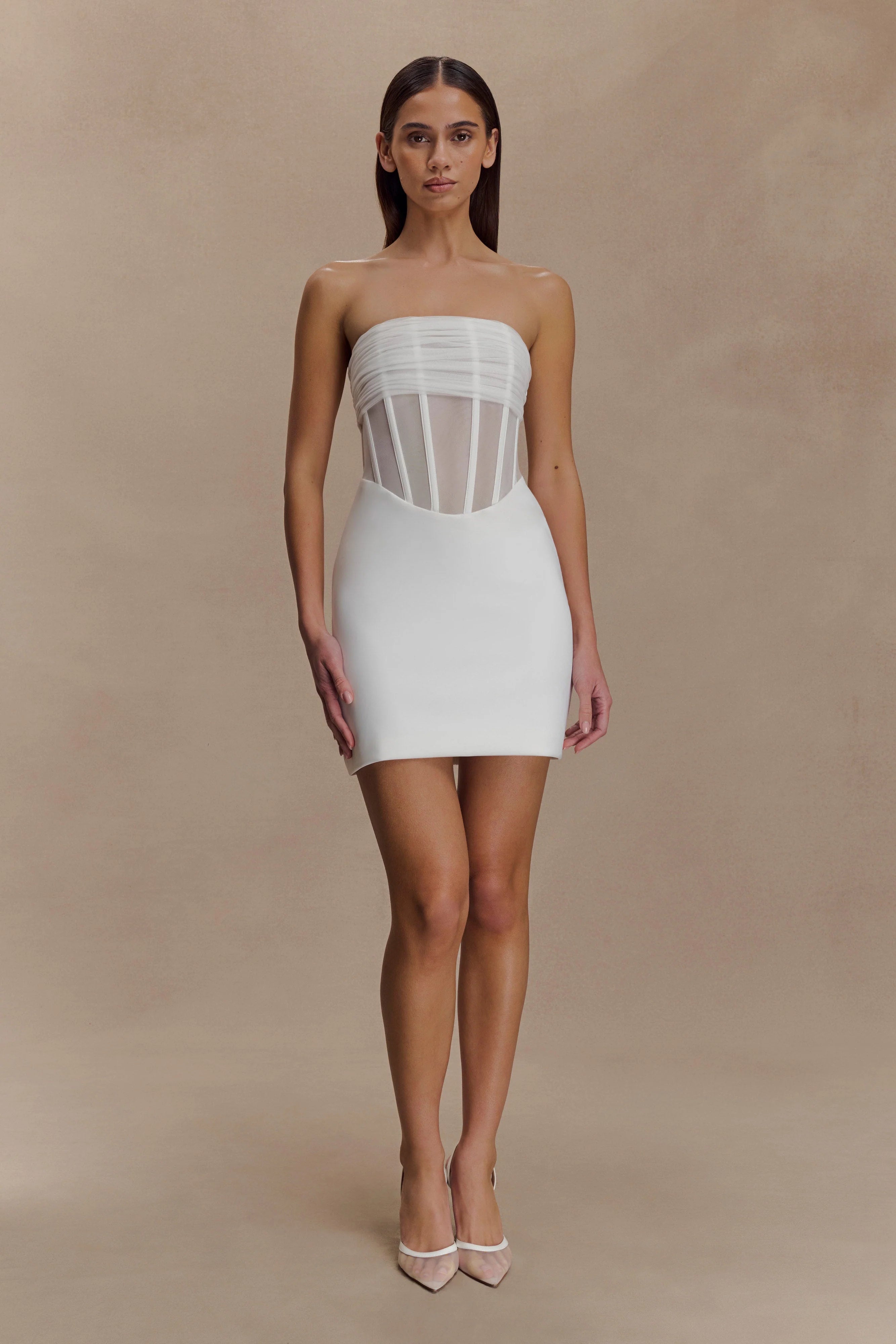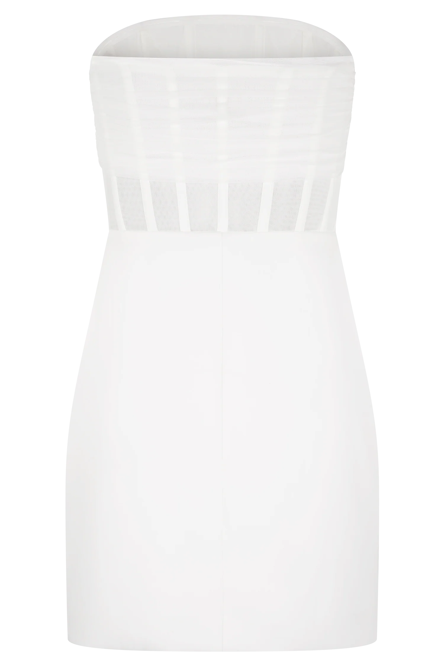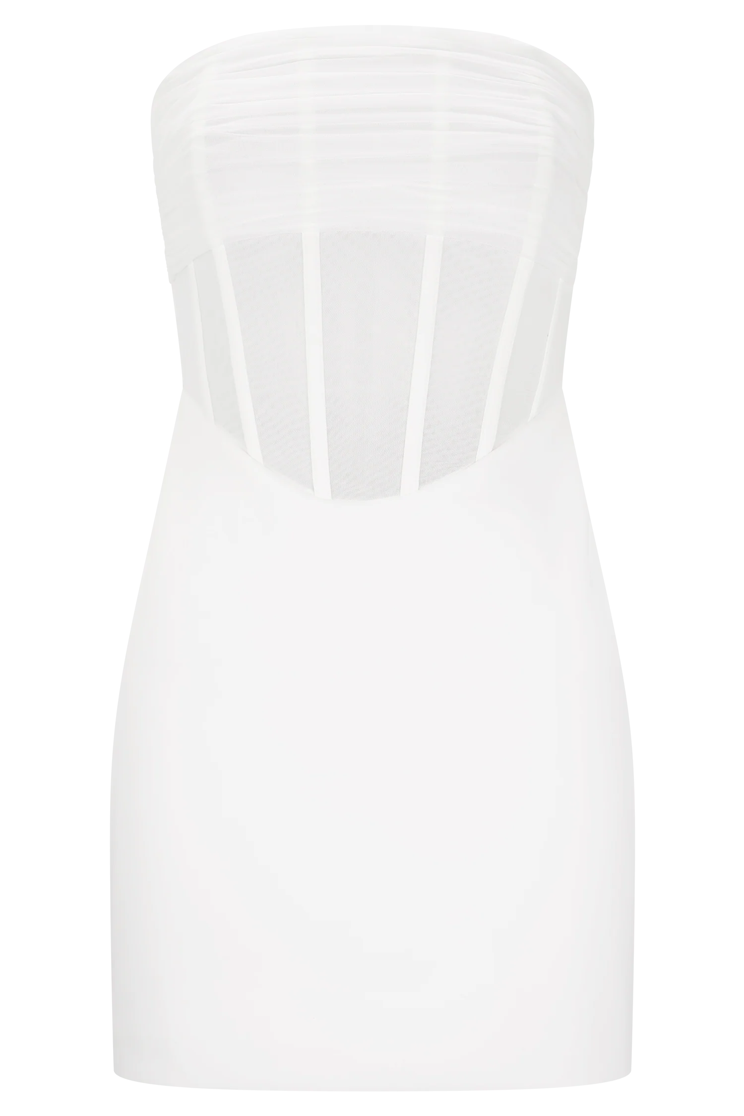 The PALMER Mesh Corset Mini Dress is designed to sculpt and accentuate. Featuring a strapless neckline and a mesh bodice, it’s detailed with a gathered bust overlay for soft texture. The boned waist shapes the silhouette, flowing into a fitted skirt that sits perfectly on the frame. Fully lined and finished with a sleek side zip, this dress blends modern structure with an alluring edge—made for moments where confidence is key.