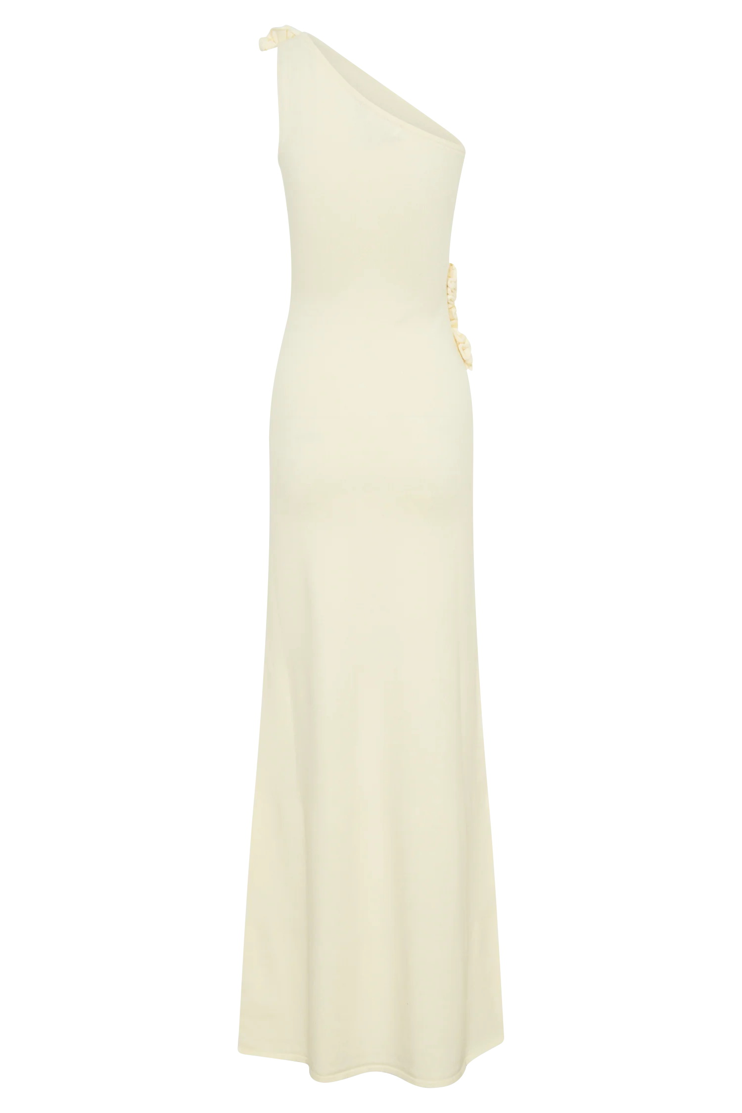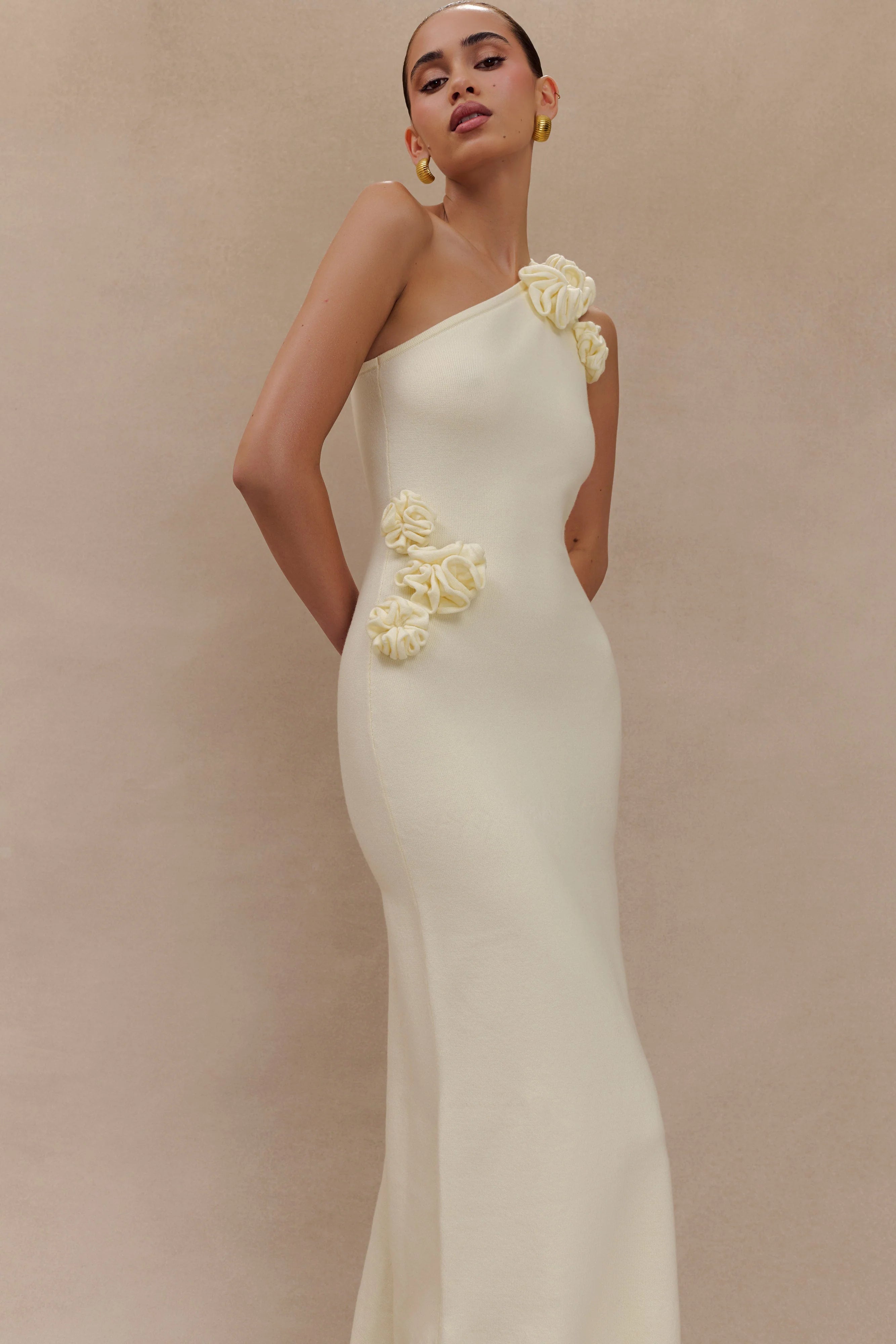 Make a statement in the PALOMA One Shoulder Knit Maxi Dress with Flowers, where elegance meets modern design. This stunning piece features an asymmetrical neckline that beautifully highlights the shoulder while offering a distinctive silhouette. Delicate flower details at the shoulder and hip add a feminine touch, ensuring you turn heads at any event. The flowing maxi length and flattering fishtail hem create graceful movement, enhancing your natural curves. Crafted from soft, unlined knit fabrication, this dress promises both comfort and style, making it an essential addition to your wardrobe.