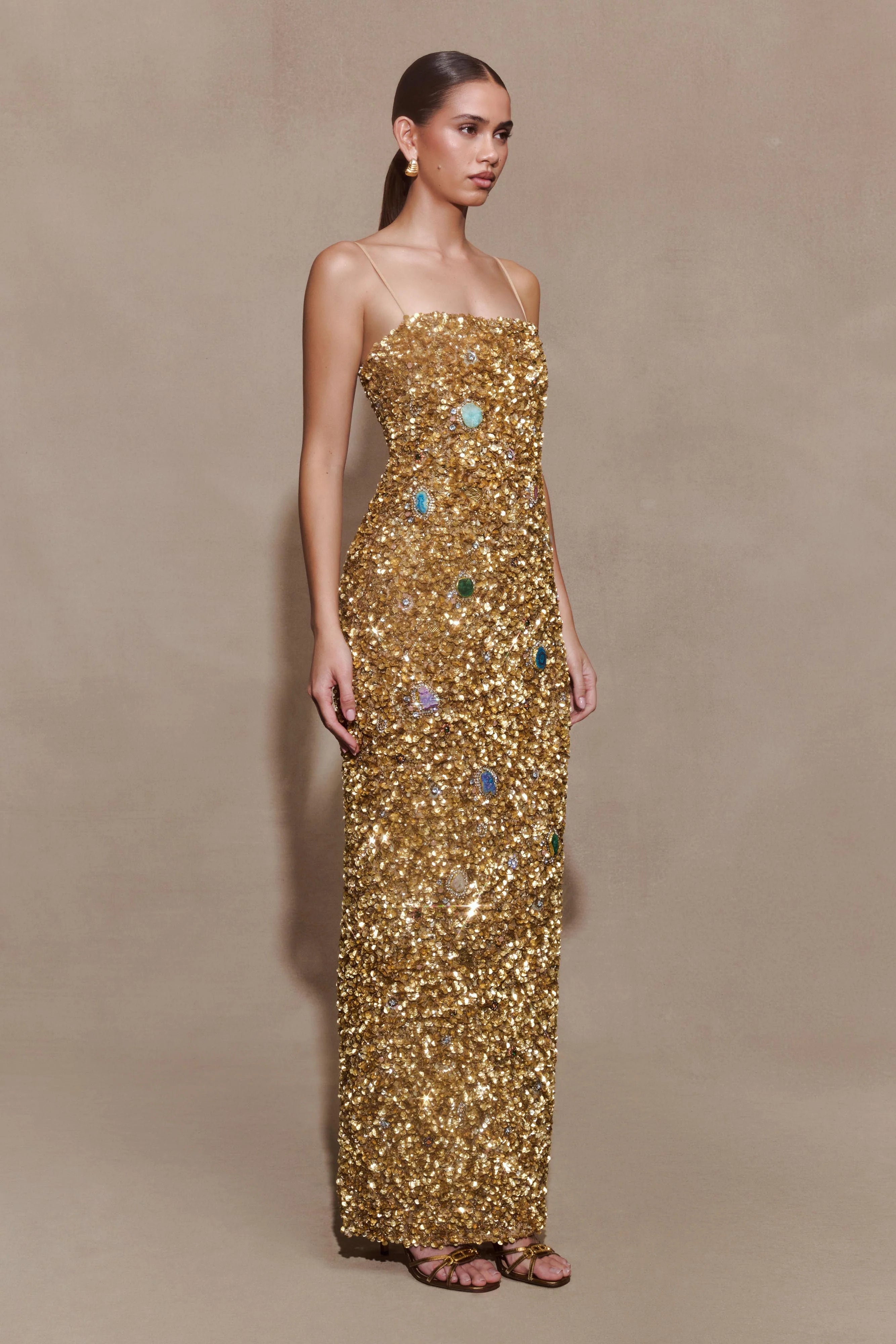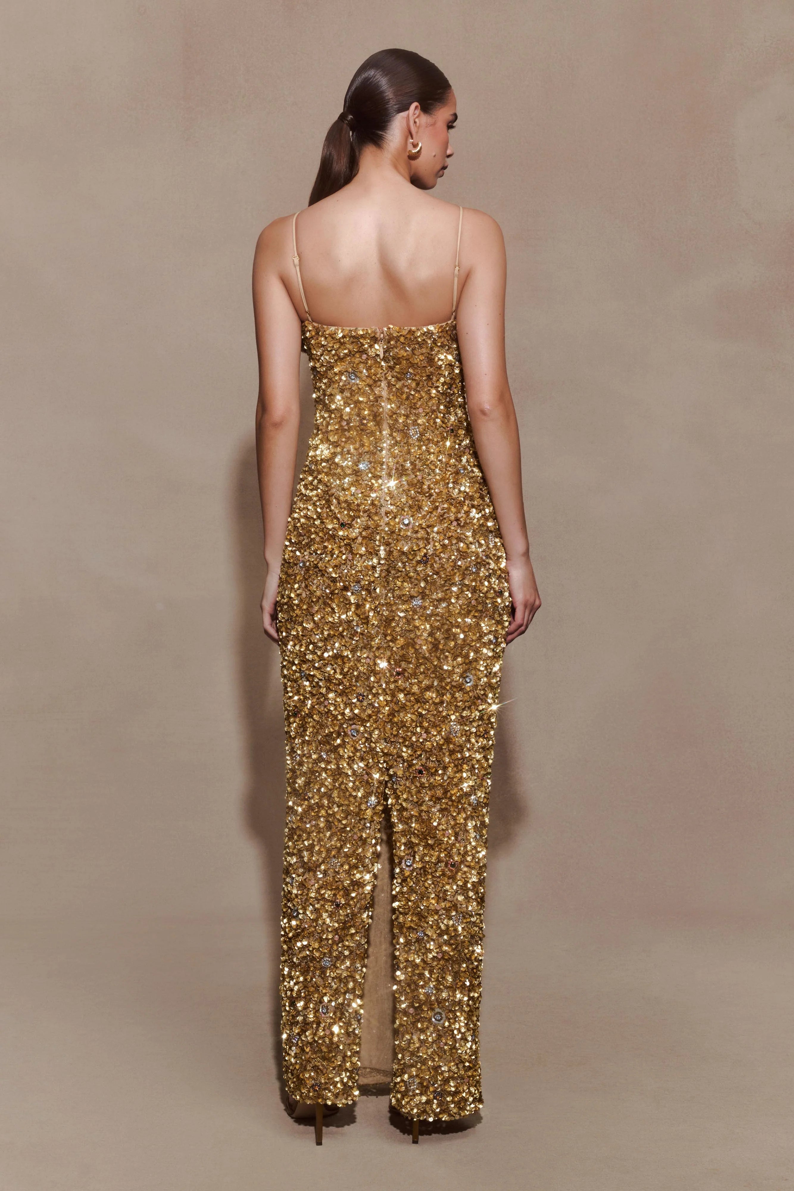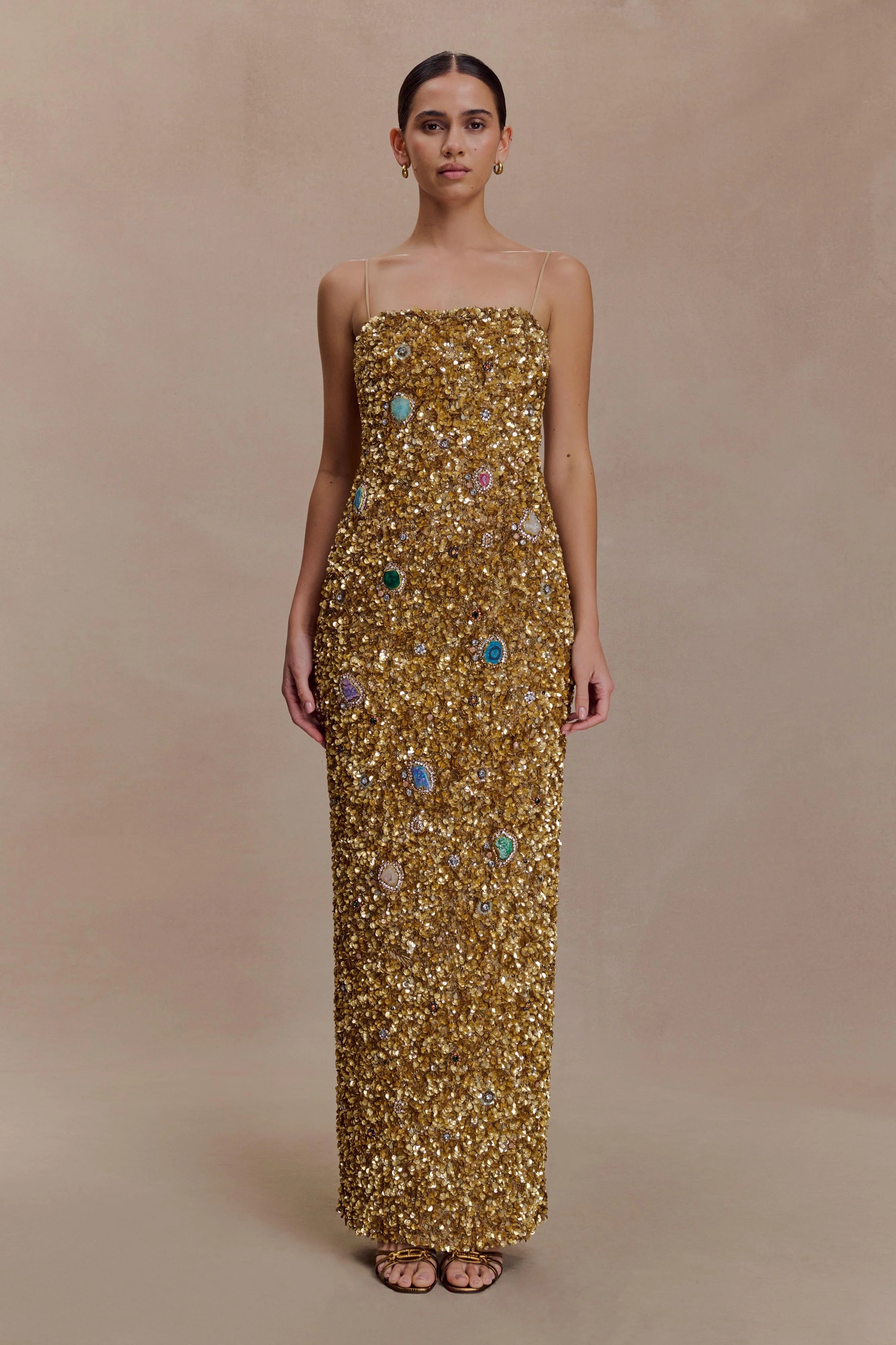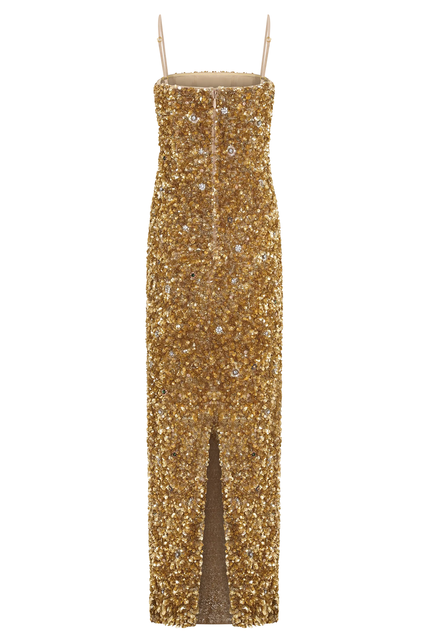 The PORTER Hand Beaded Midi Dress is a statement of craftsmanship and refined glamour. Featuring a straight neckline and adjustable straps, it’s designed with an internal corset that shapes and supports the silhouette. Fully embellished with embedded stones and crystals, it catches the light from every angle, while the relaxed bodycon fit ensures comfort through movement. Finished with a centre back split and invisible zip closure, this dress is fully lined in mesh for a smooth fit and cut to a midi length — an elegant fusion of structure, sparkle, and sophistication.