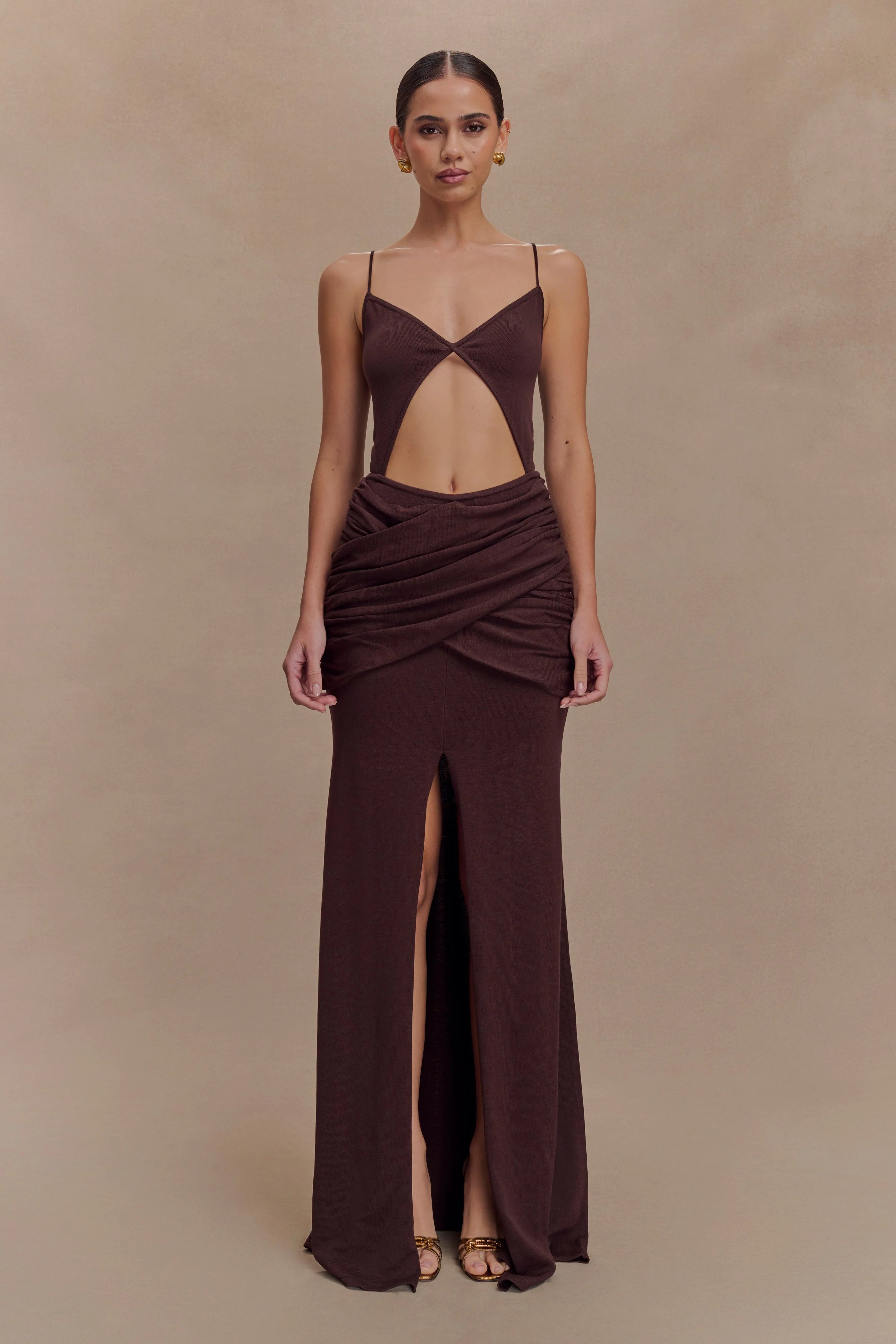 The REAMA Wrap Over Knit Maxi Dress is your elevated go-to for warm city days and romantic evenings alike. Designed with a flattering V neckline and twist front detail, this maxi silhouette features bold front and back waist cutouts that highlight the figure. A gathered overlay panel adds texture and dimension, while a front skirt split creates soft movement with every step. Crafted from a lightweight knit and unlined for a breathable, second-skin feel, this dress effortlessly balances structure and fluidity.