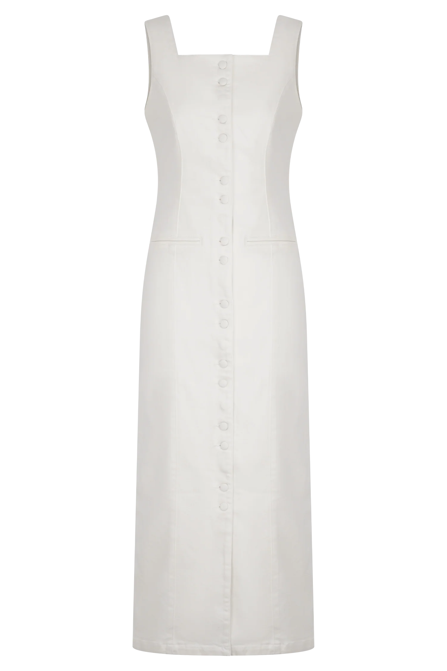 The REYNA Denim Midi Dress blends classic charm with a modern silhouette. Featuring a square front and back neckline, this dress is designed with a functional button front for versatile styling. Non-functional front pockets add a touch of detail while shaping panelling enhances the fitted, figure-flattering design. With its midi length, this dress is perfect for both casual days and elevated outings, offering effortless style in every step.