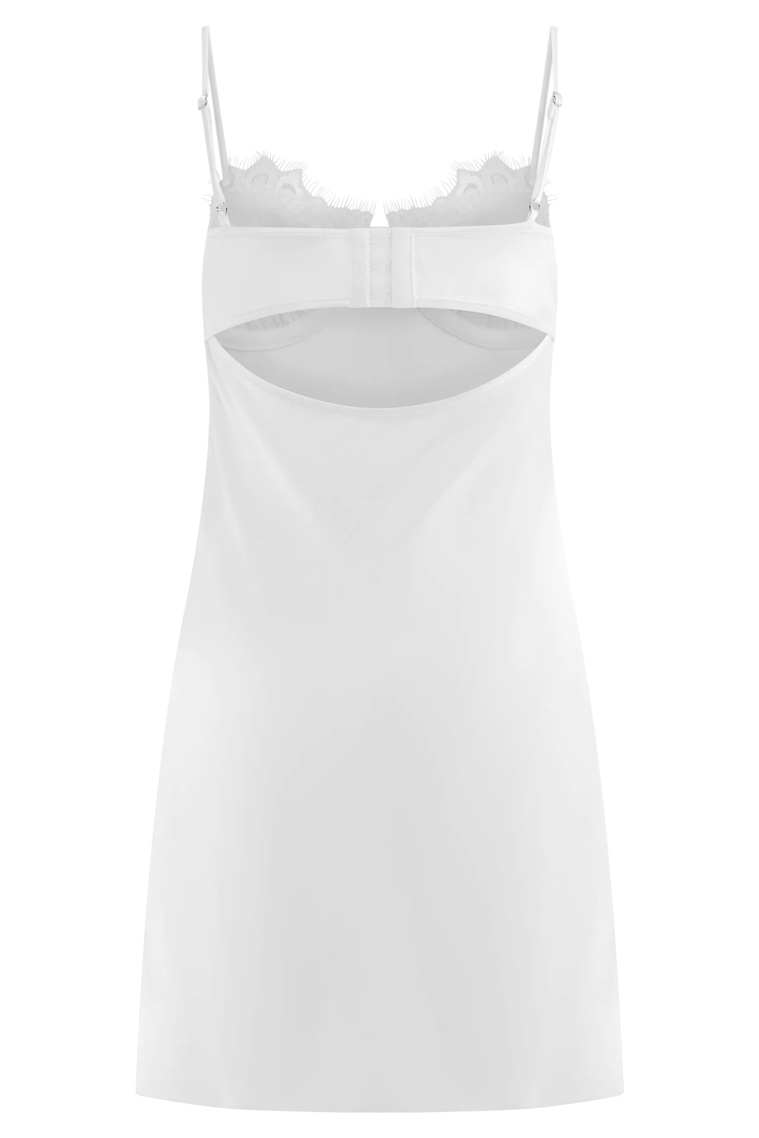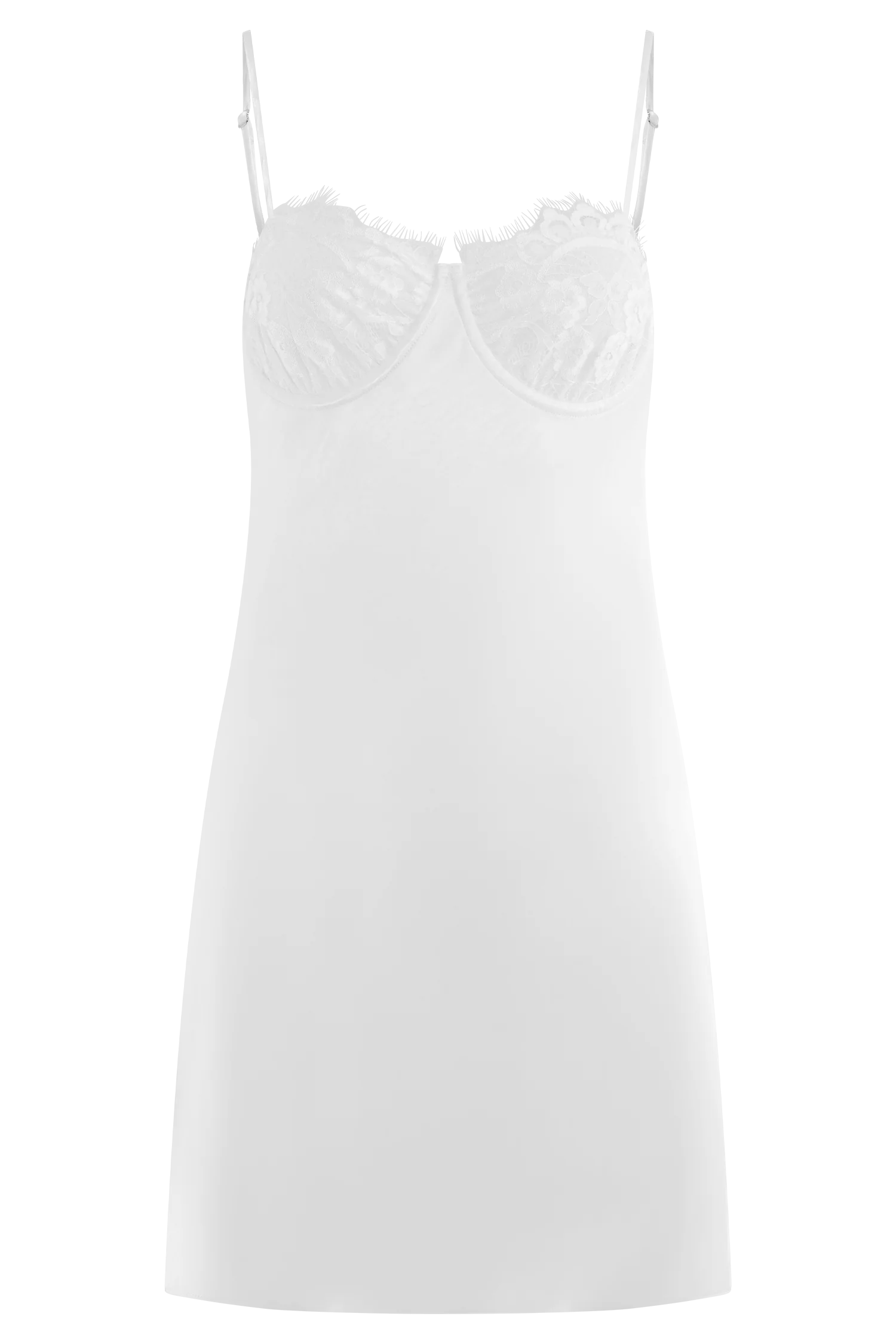 The SCARLETT Satin Slip Mini Dress is the perfect balance of allure and elegance. Featuring delicate lace bust cups with underwire support and mesh lining, this mini dress offers a structured yet feminine fit. The scalloped neckline edging adds a touch of romance, while adjustable straps and an open-back design enhance its sultry appeal. Crafted in a flattering A-line silhouette and finished with a hook-and-eye back closure, this dress is unlined for a lightweight, effortless feel—ideal for date nights, special occasions, or modern bridal moments.