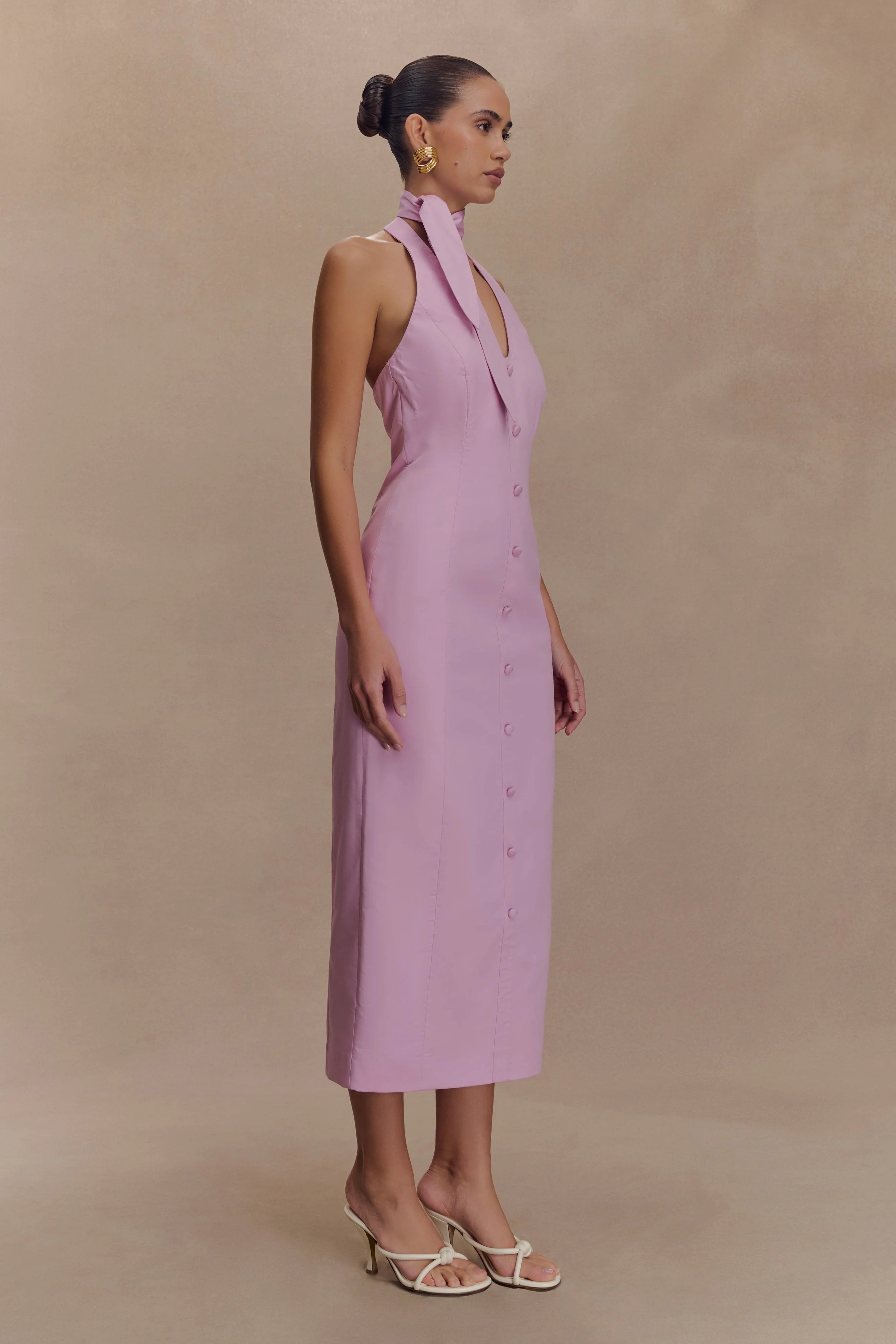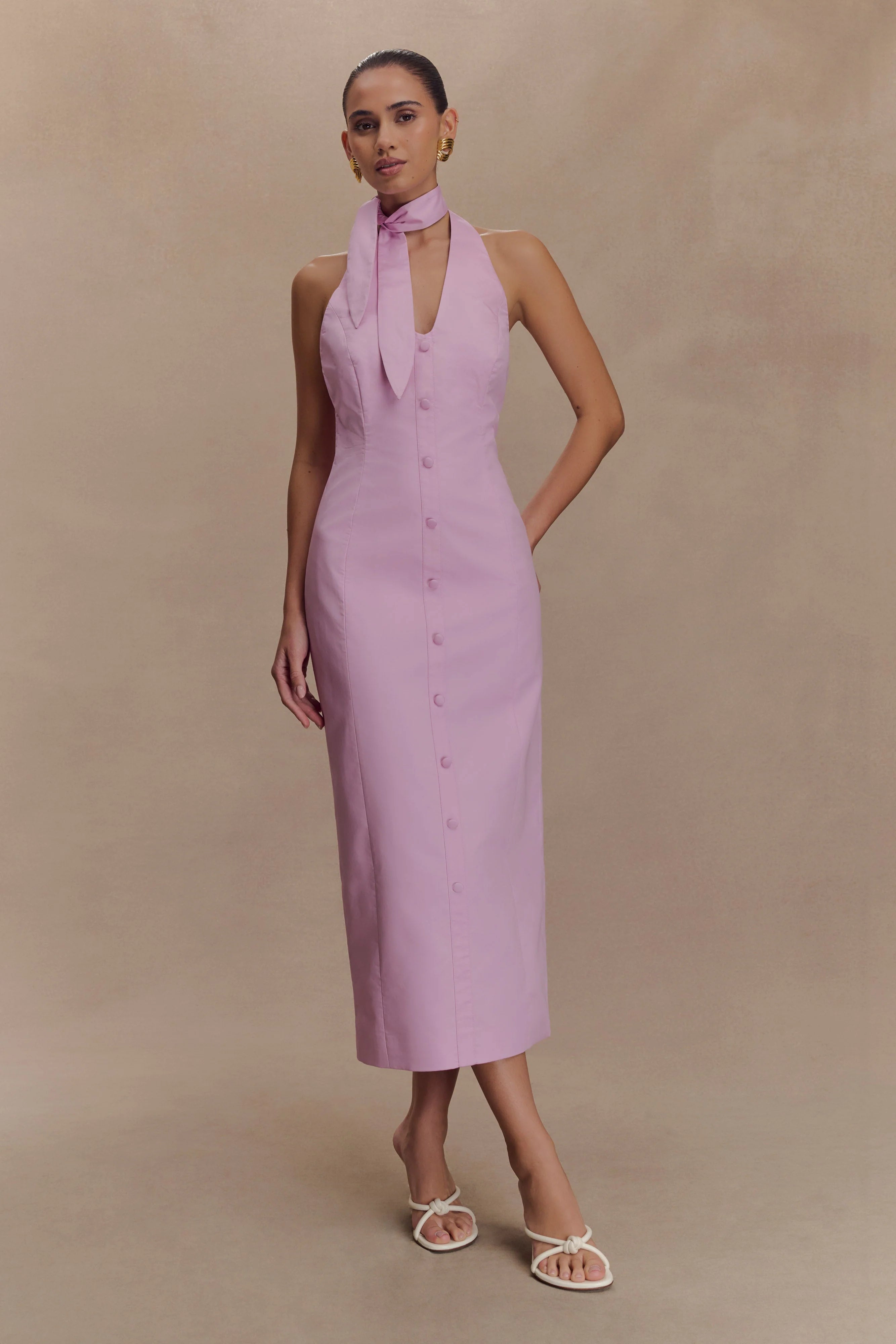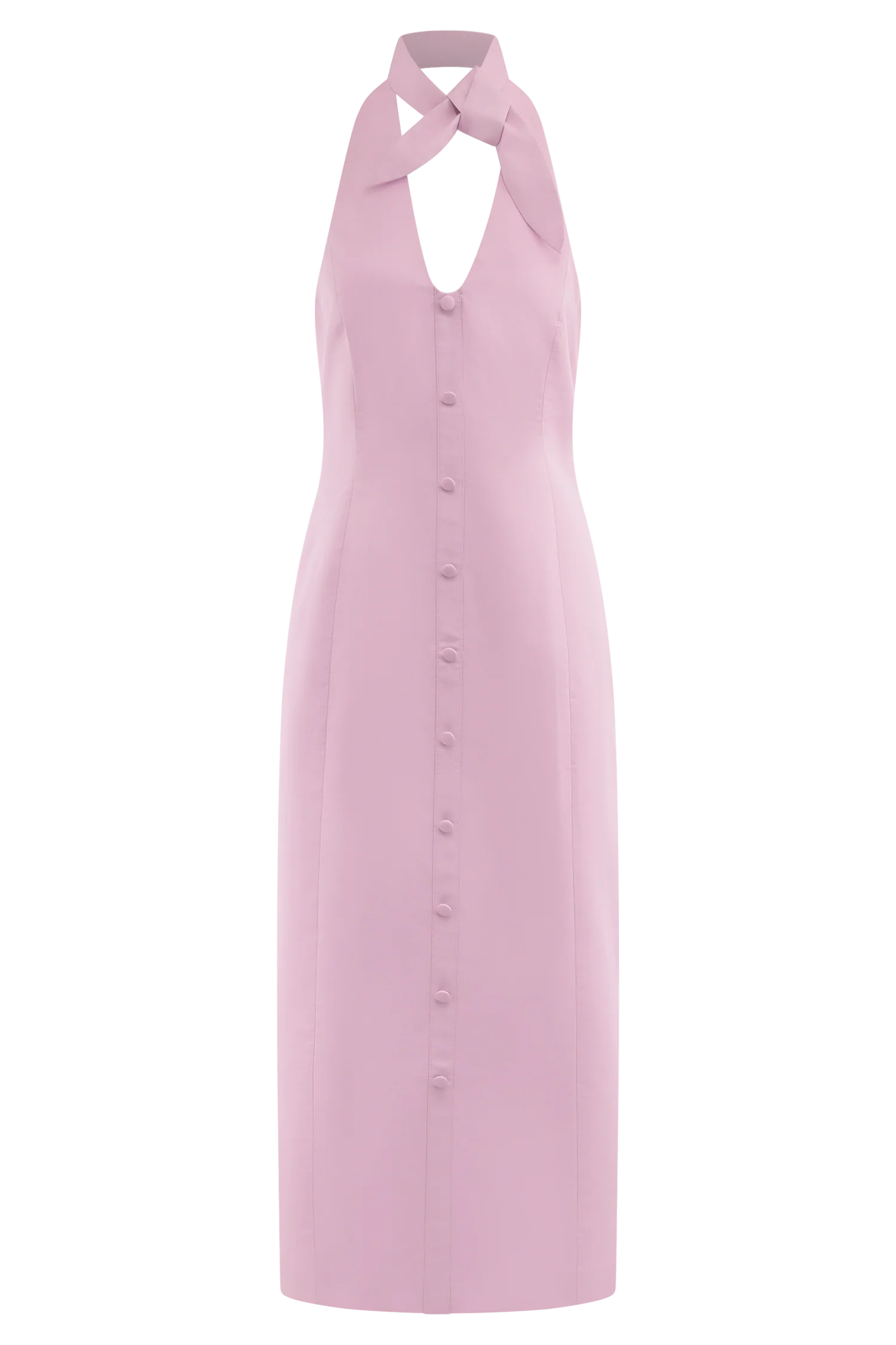 The SIMONA Halter Neck Midi Dress is an elegant essential, designed to flatter with ease. Featuring a halter neck tie and plunging V neckline, this midi dress is detailed with non-functional centre front buttons for a touch of vintage charm. Tailored through front and back side seams, it skims the body before finishing with a back split for ease of movement. Secured with an invisible centre back zip, this dress is your go-to for elevated days and effortless evenings.
