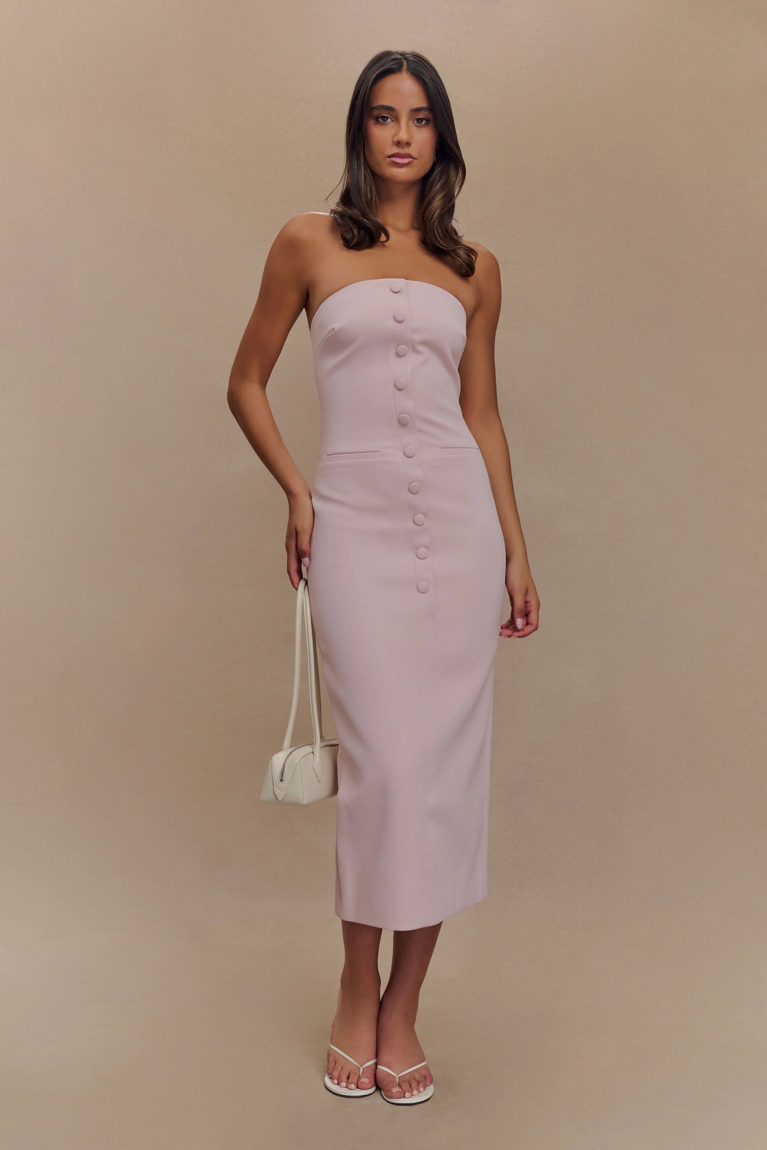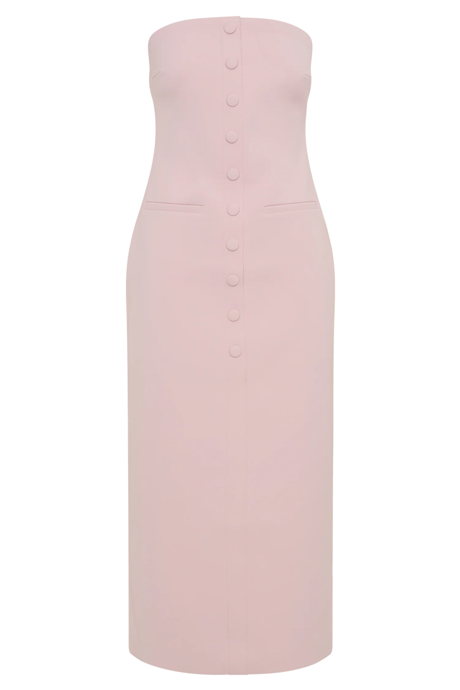 The SUSSAN Strapless Midi Dress combines effortless elegance with subtle, modern details. Designed with a strapless neckline, this dress features a non-functional button front detail that adds a touch of sophistication. The front welt pockets offer a sleek and streamlined look, while the back vent ensures ease of movement. With its midi length and clean, flattering silhouette, the dress is perfect for both daytime and evening occasions. Lined for comfort and featuring a back invisible zip, this dress is an essential addition to your wardrobe for a polished, chic style.