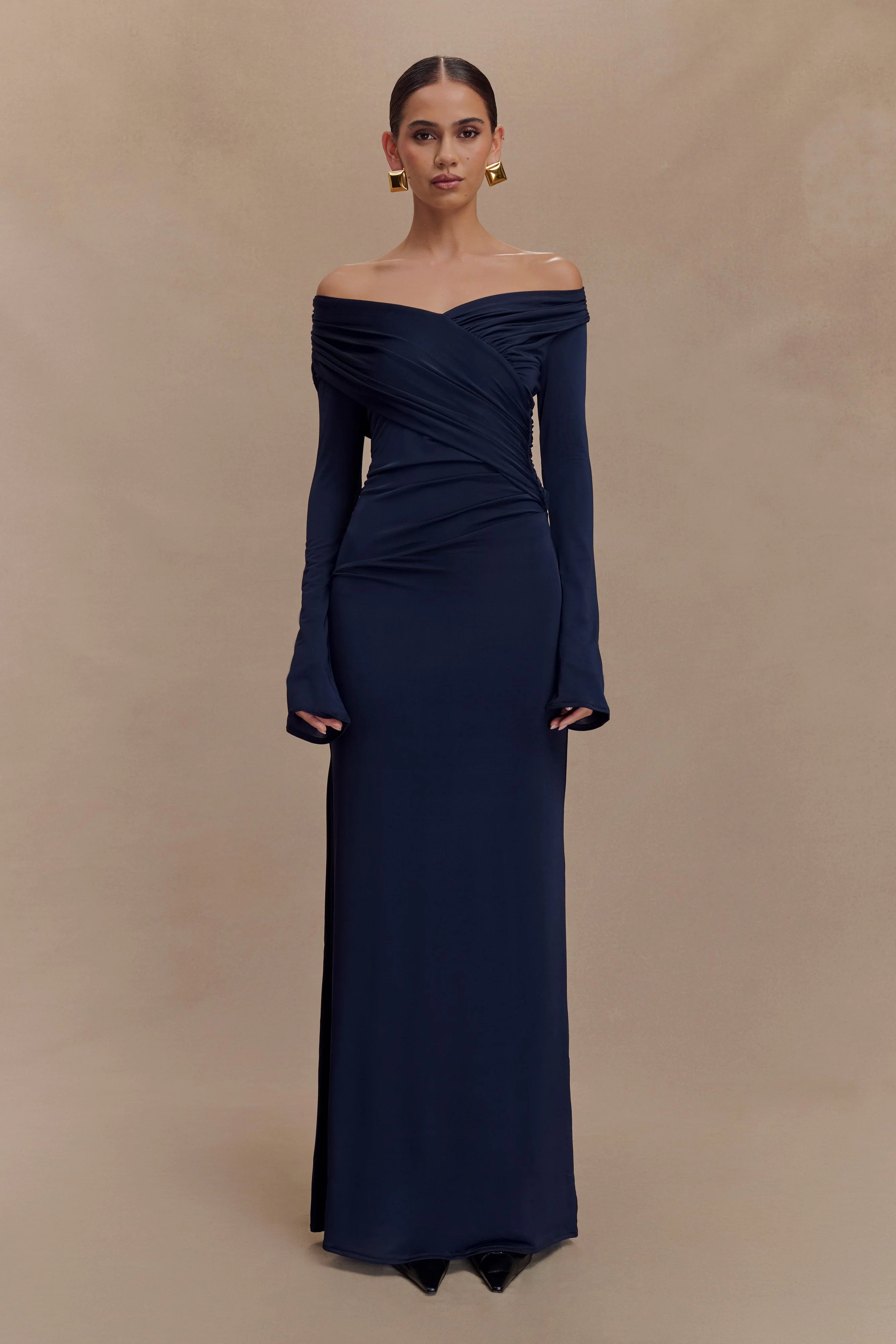 The THERESE Off Shoulder Ruched Maxi Dress is a refined take on modern glamour. Designed with a flattering off-shoulder neckline and long sleeves, this fully lined maxi dress hugs the body with a sleek, fitted silhouette. Delicate ruched detailing along the shoulders adds texture and softness, creating a look that’s both romantic and confident. Perfect for evening occasions, formal events, or celebrations that call for effortless sophistication.