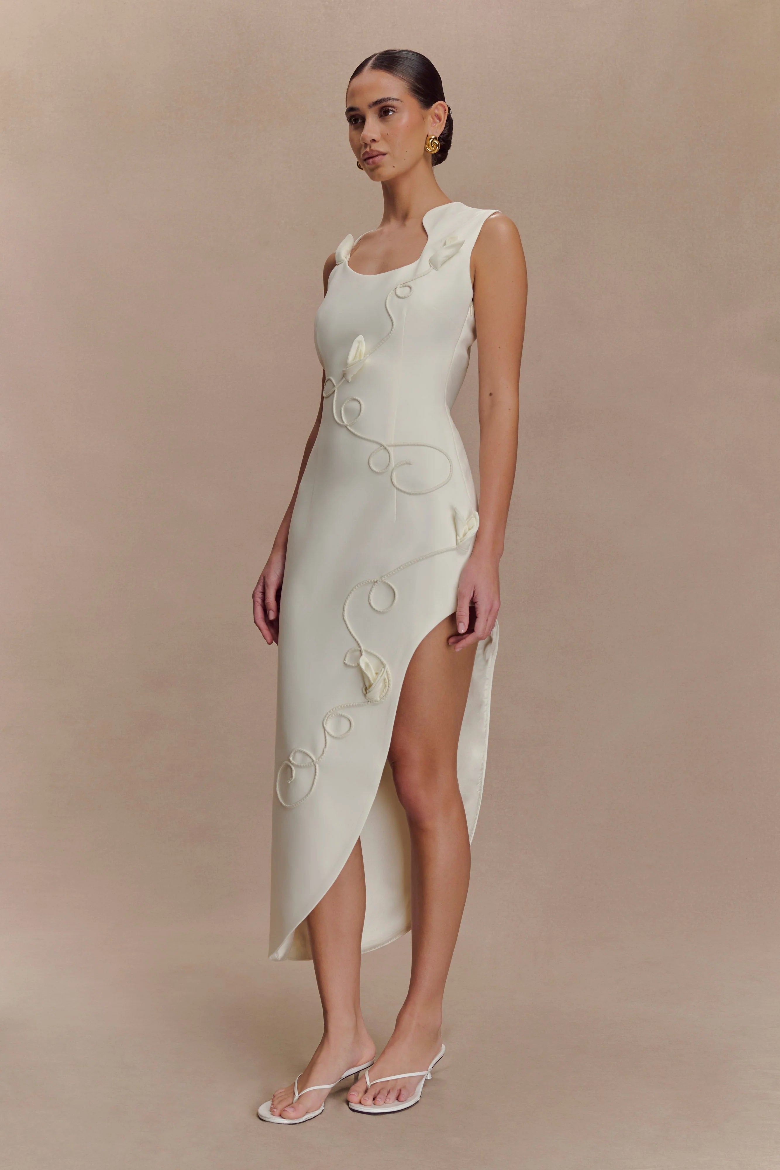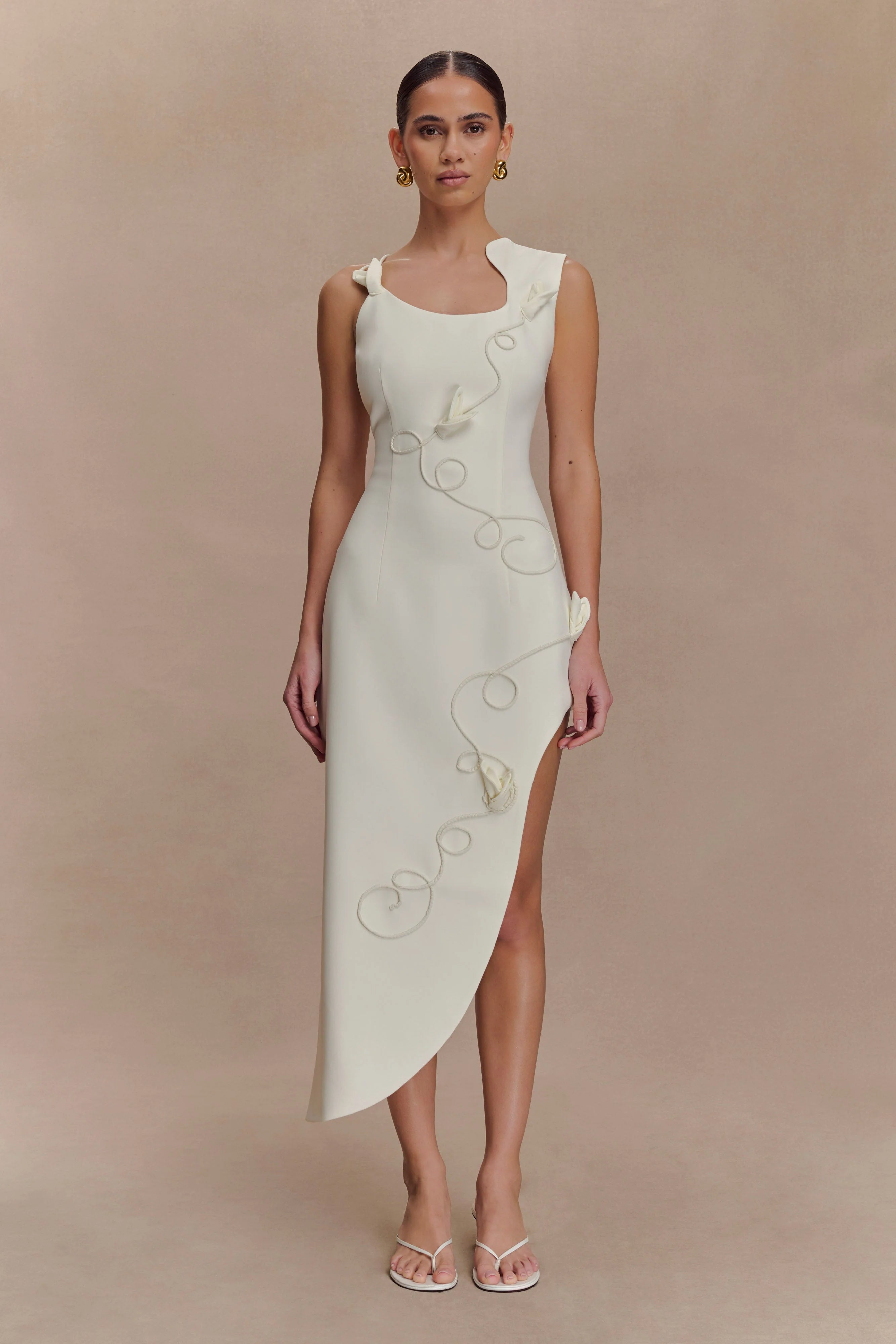 The VIRGINIA Suiting Embroidered Midi Dress blends strong structure with soft detailing for an effortlessly refined statement. Designed with an asymmetric neckline and hemline, this tailored silhouette features an intricate corded floral design that adds dimension and elegance. The midi length offers timeless appeal, while the invisible zip ensures a sleek finish. Fully lined for comfort, this dress is ideal for moments that call for modern sophistication with a romantic edge.