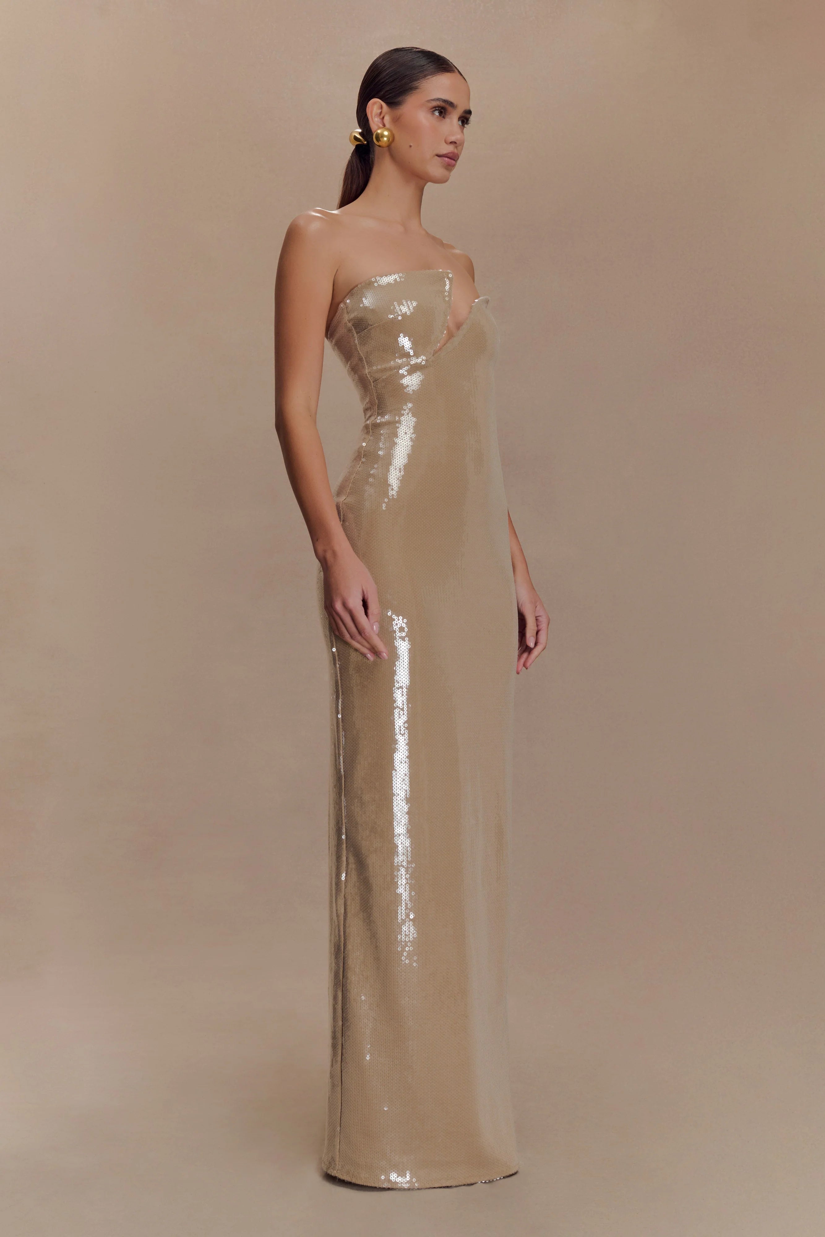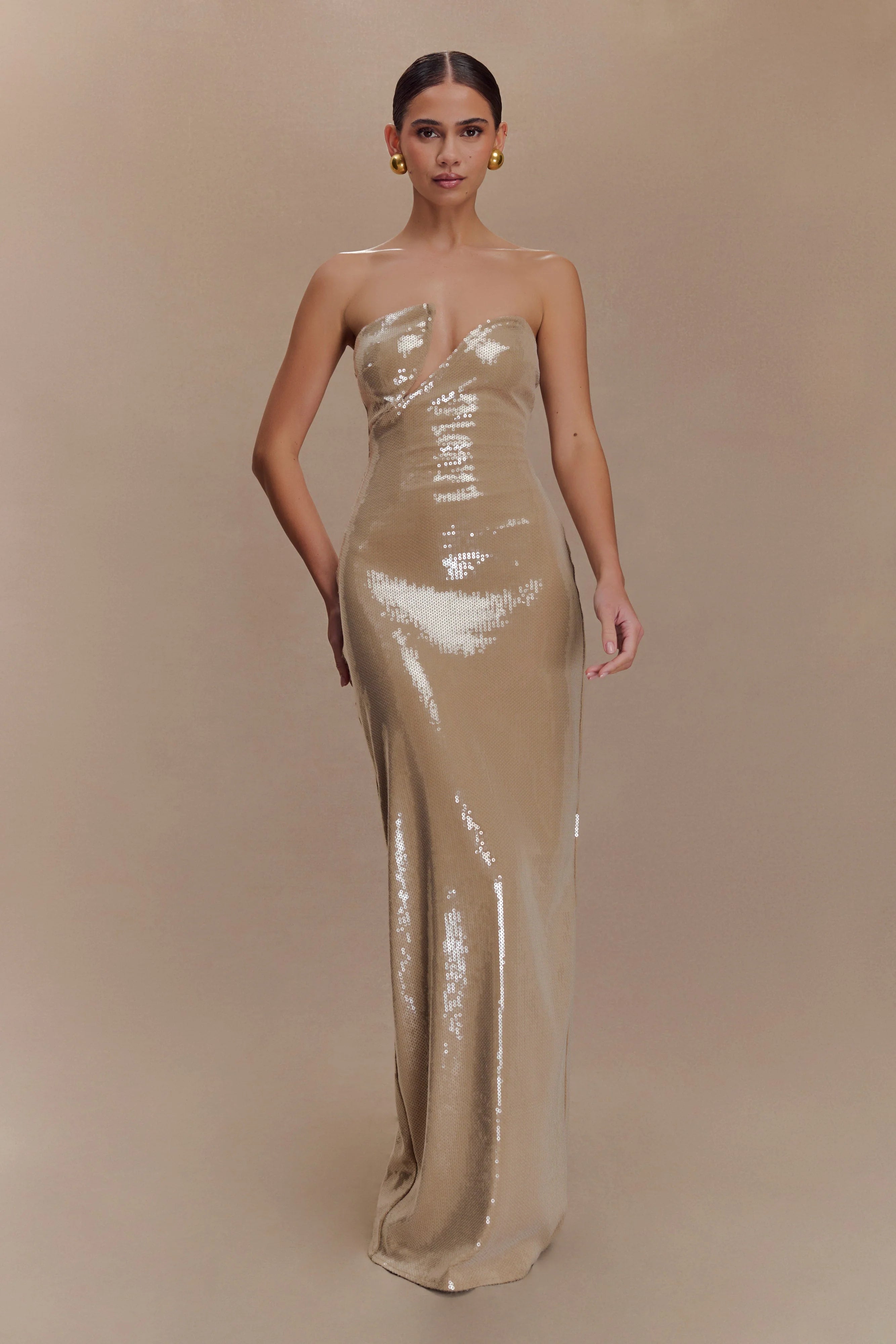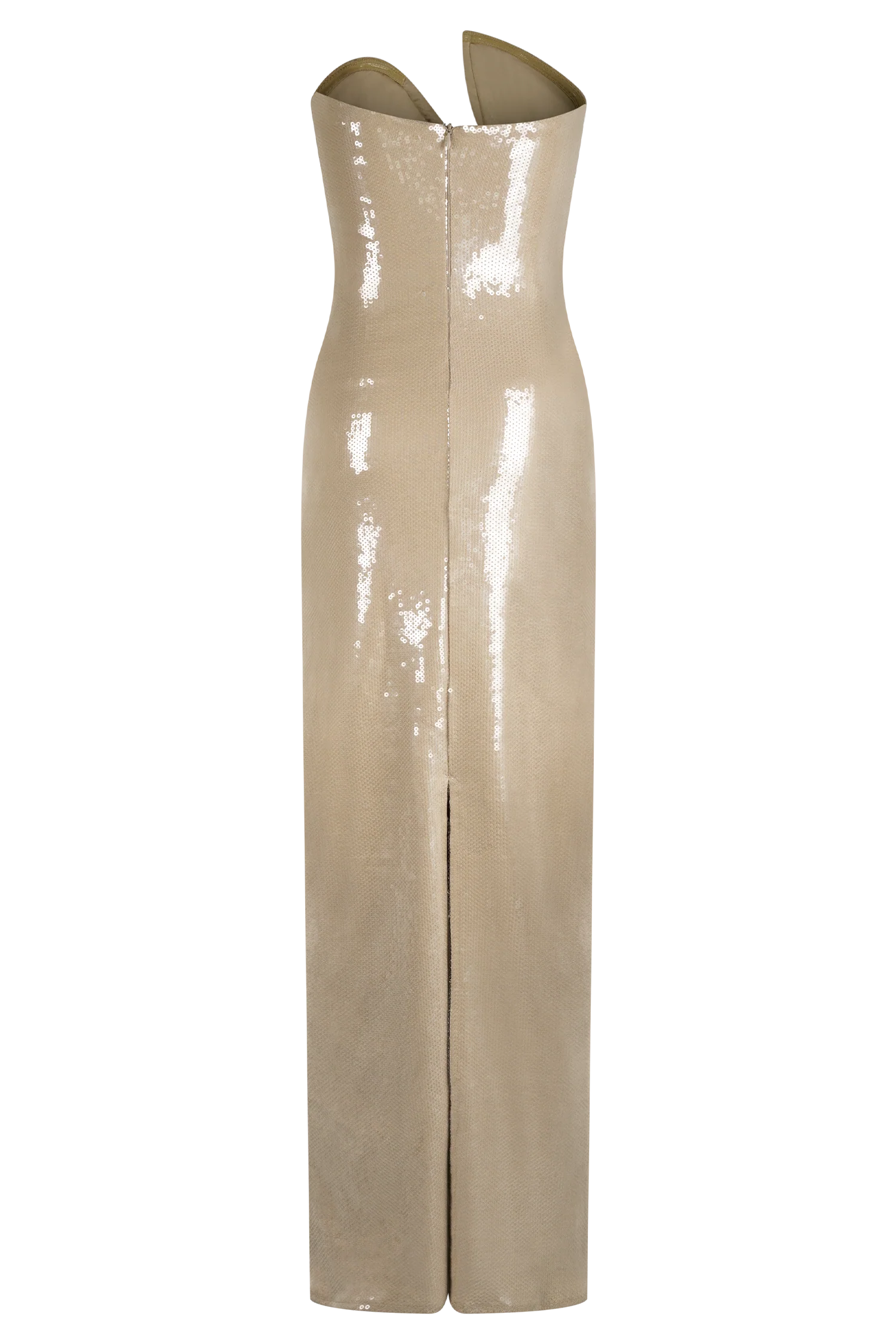 The WINSTON Strapless Sequin Maxi Dress is your ultimate showstopper. Crafted from dazzling metallic silver sequin fabric, this statement piece features an asymmetrical sculpted neckline that highlights the décolletage with modern elegance. The strapless, fitted silhouette hugs your curves before falling to a sleek maxi length, while the straight open back and invisible zipper keep the finish clean and refined. Perfect for after-dark moments when only shimmer will do.