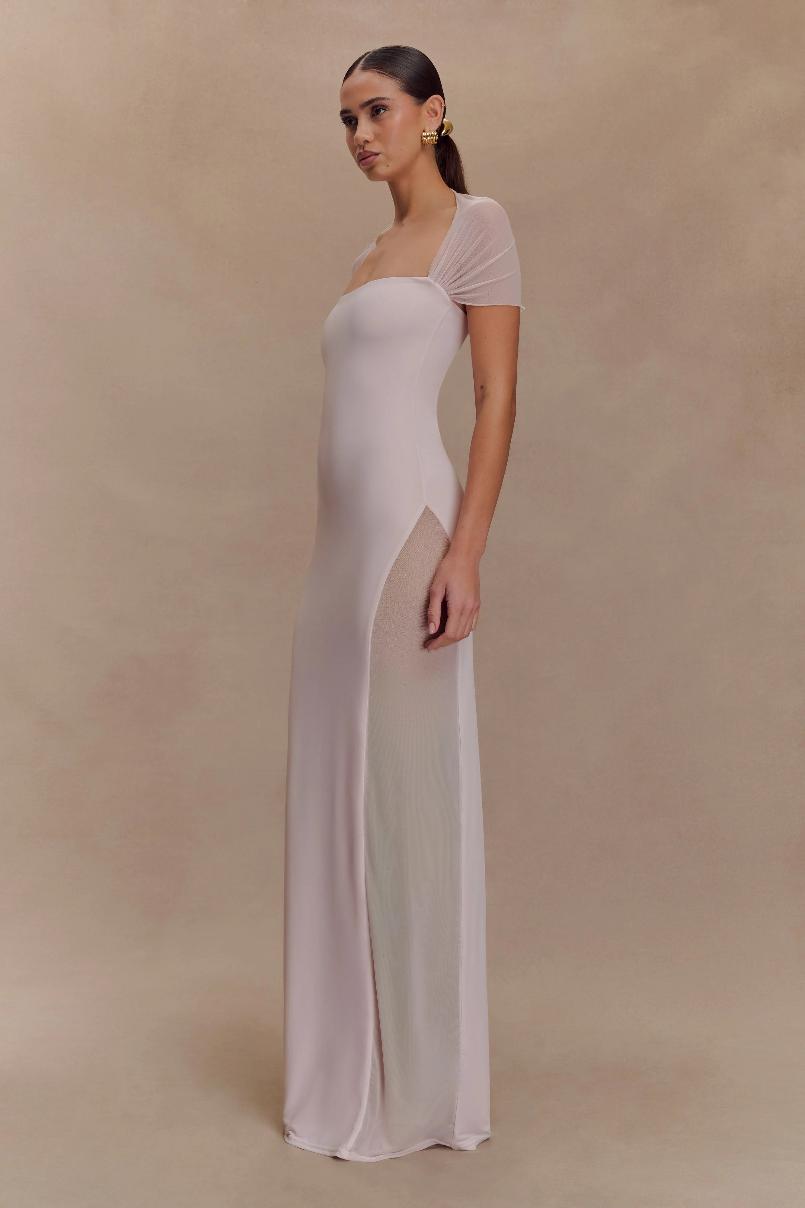 The WYATT Slinky And Mesh Maxi Dress is designed to command attention with minimal effort. Featuring a sleek straight neckline and a fixed mesh shawl that delicately drapes the shoulders, this silhouette creates a powerful balance between structure and softness. The fitted design hugs your curves, while the side leg split and mesh overlay add fluid movement and visual intrigue. Fully lined for comfort, this dress is the definition of evening sophistication—elevated and unforgettable.