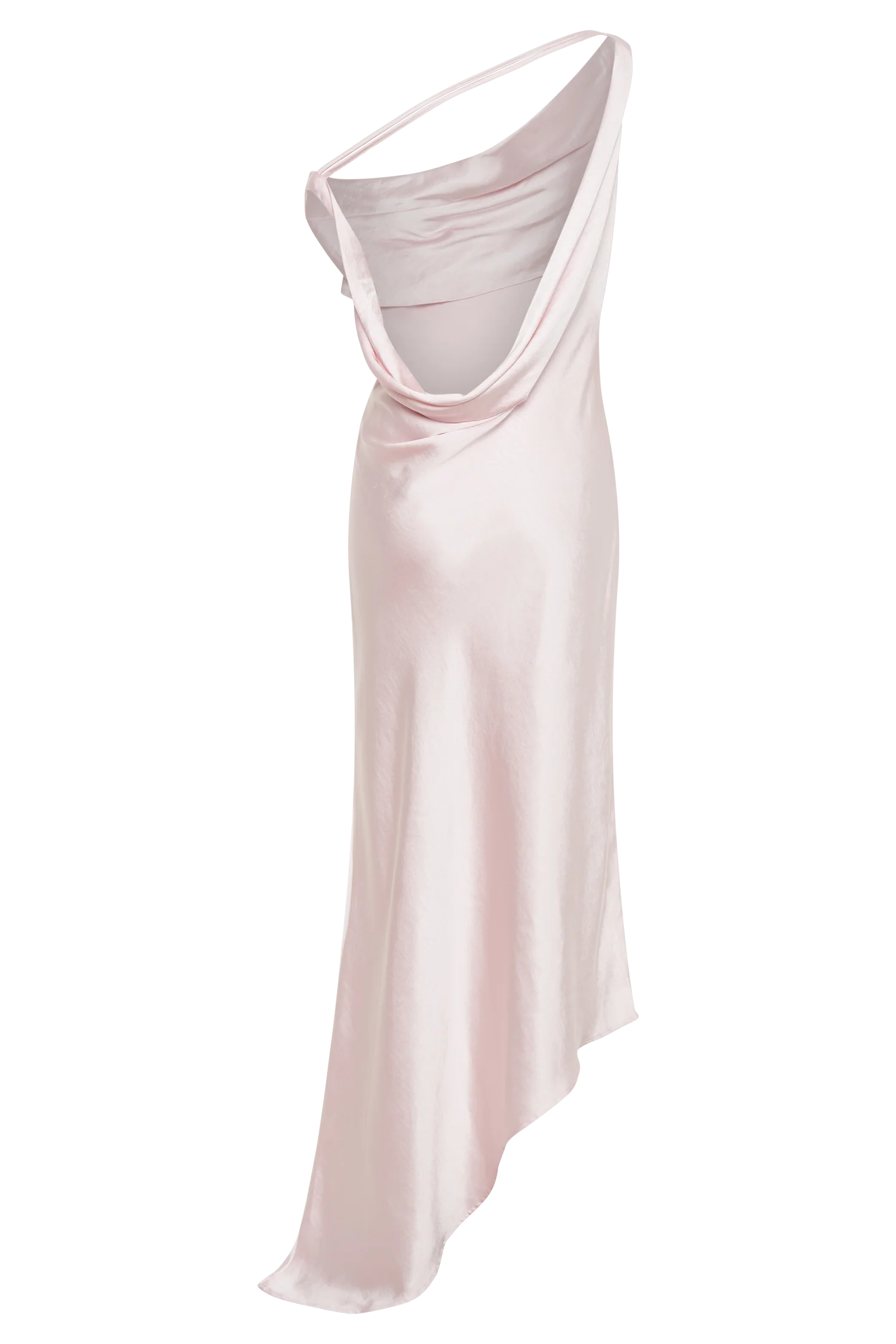 YVETTE is a Slip Maxi Dress with a low, open back, a slight cowl detail for the front neckline, and a loose, flowing hem. The front neckline dips into a slanted arrangement, with one shoulder strap up for a sleeveless look and the other down in an off-shoulder style. The asymmetrical hem is much the same, with one part gathered above the ankle and the other hitting the ground. Two thin fabric straps run across the back, adding extra detail to the low, back neckline.